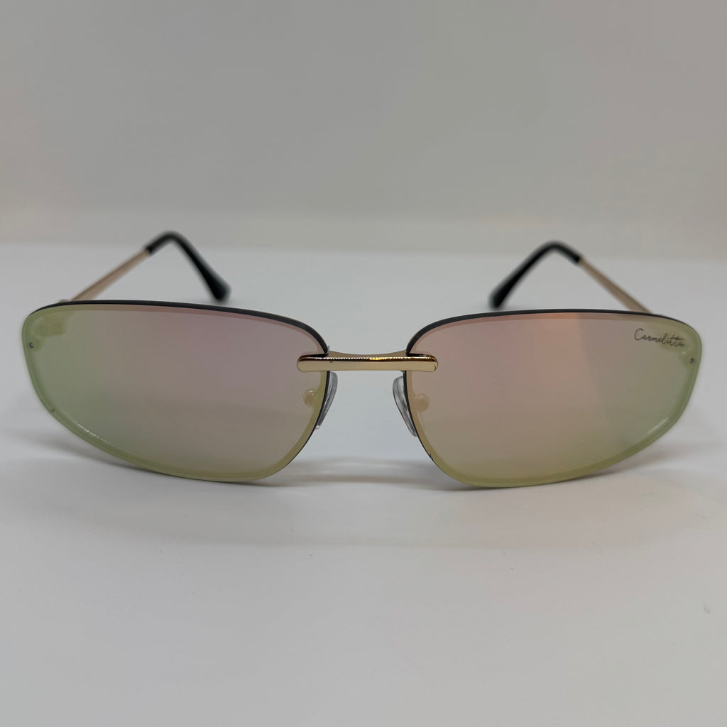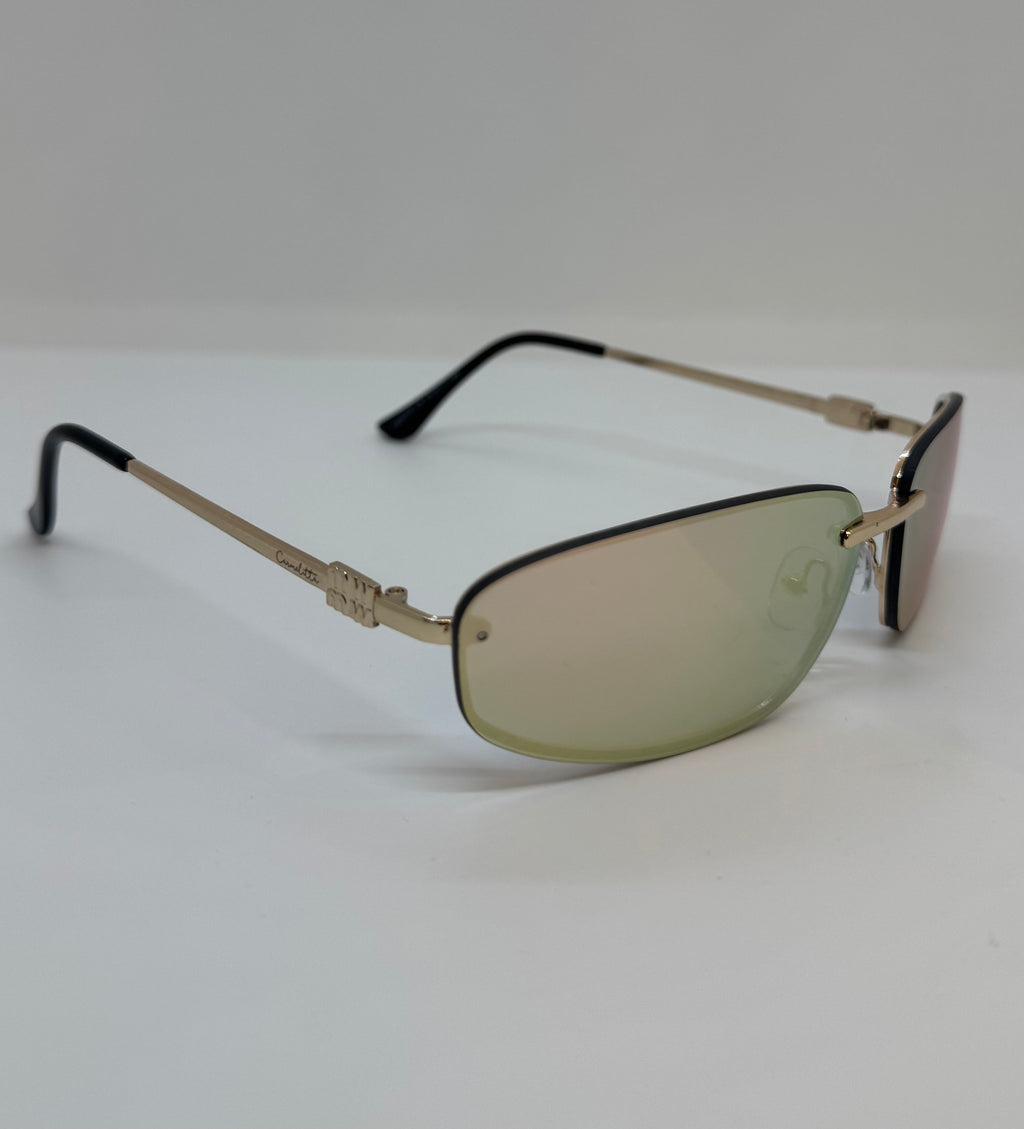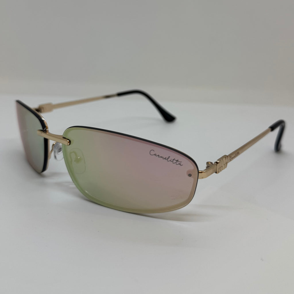 Óculos com hastes em metal dourado com lente espelhada rosa e verde degrade.