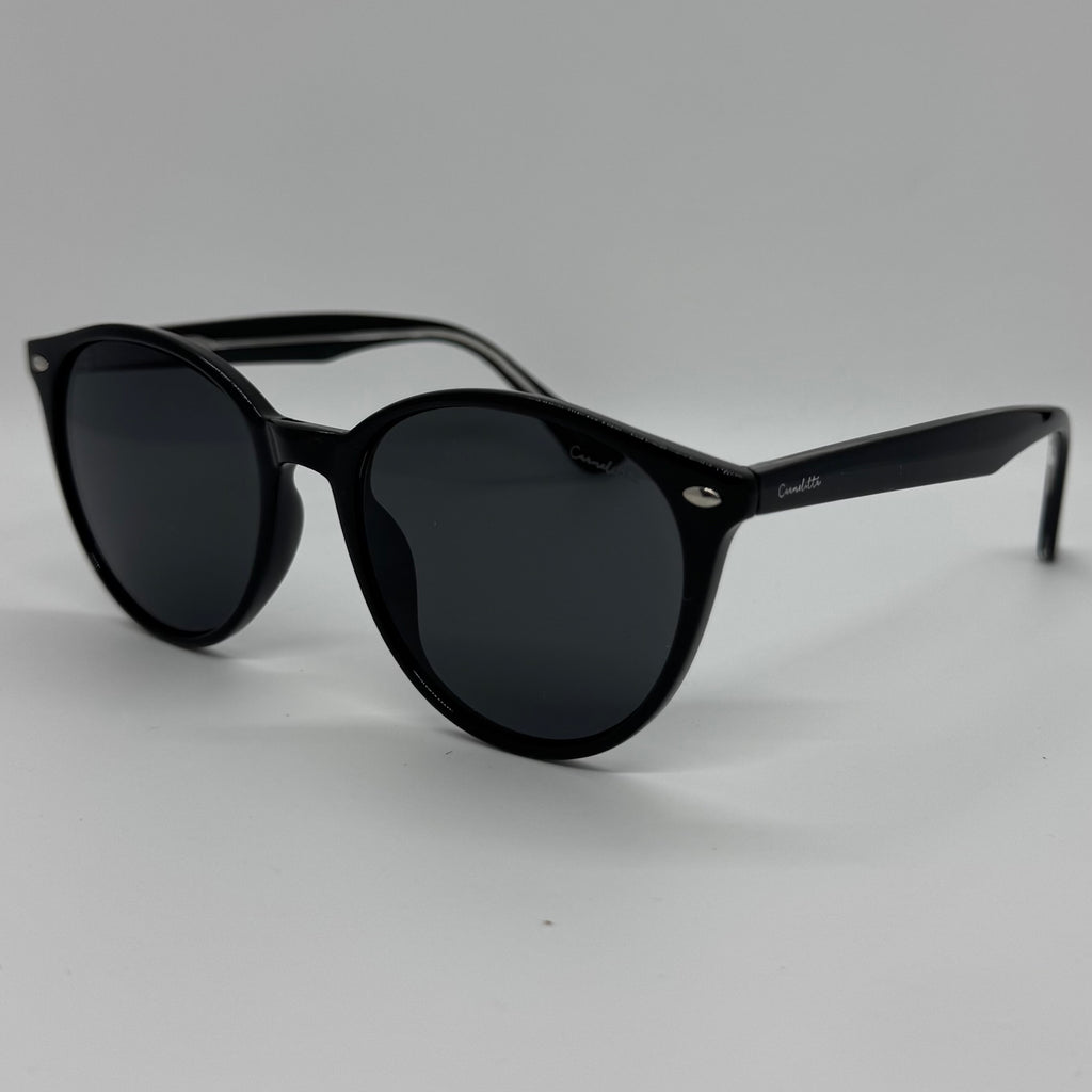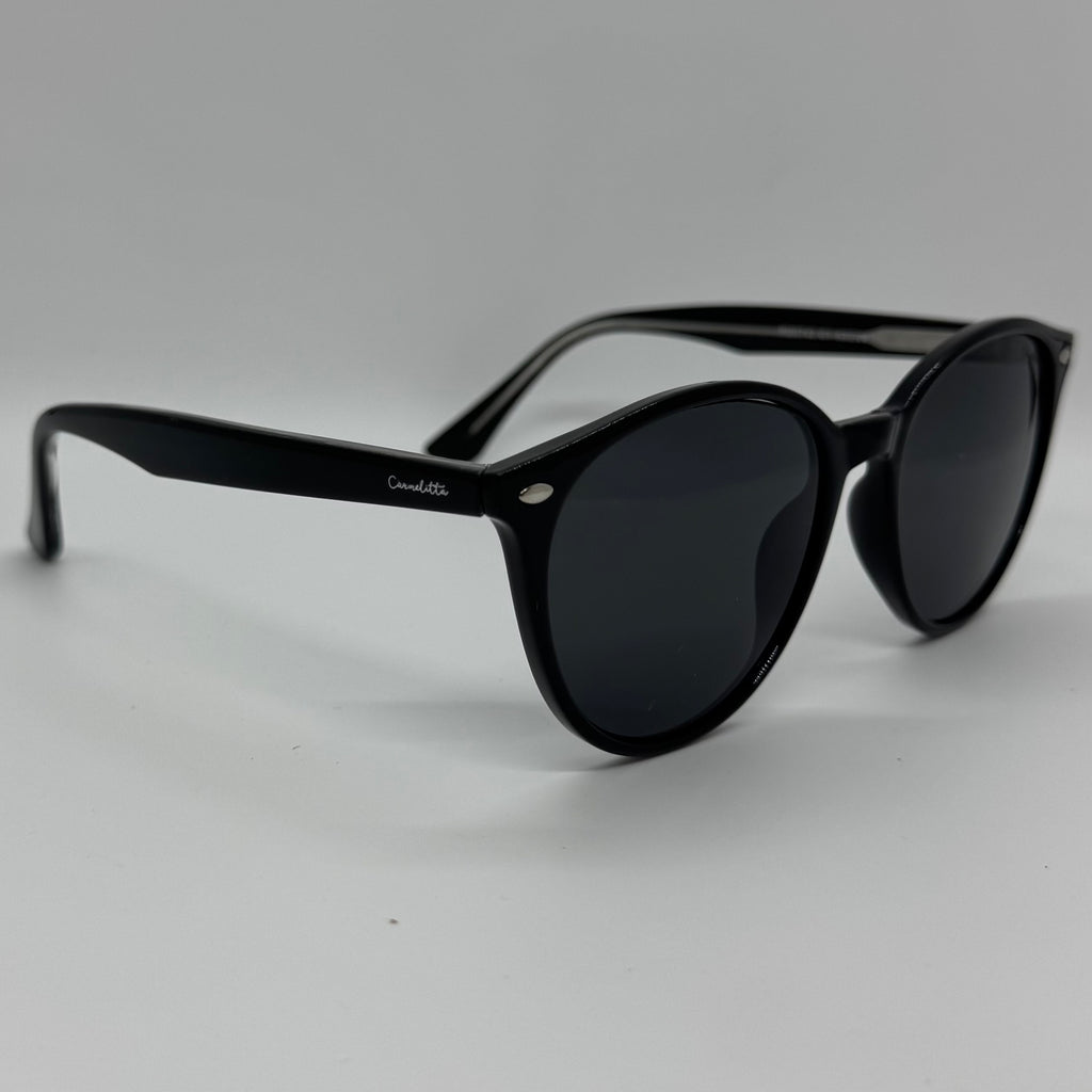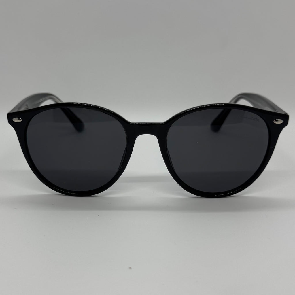Óculos com hastes em acetato preto agulhado com lente preta.