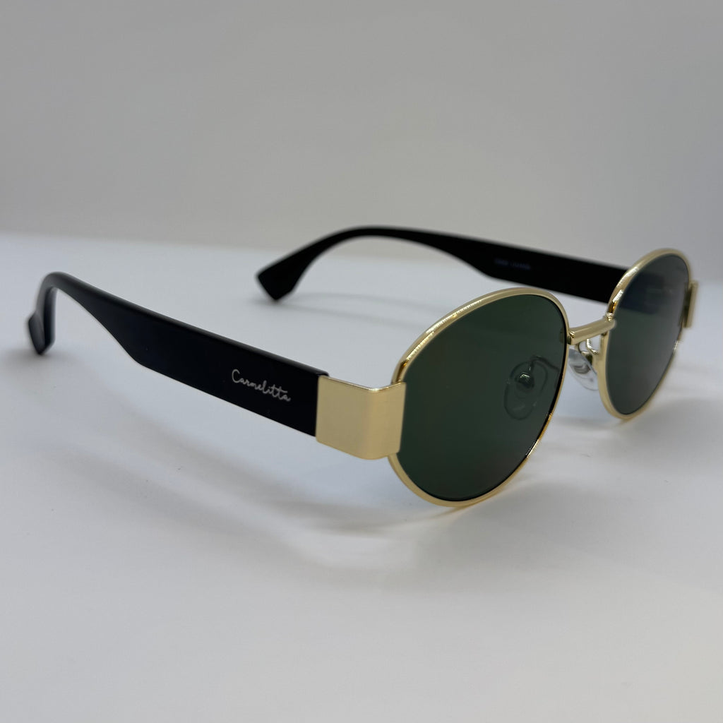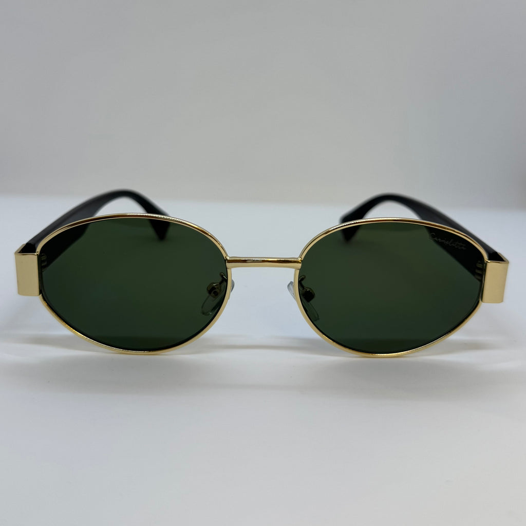 Óculos com estrutura metalica leve e durável na cor frente dourada e hastes preta, formato de design oval, e lentes verde.