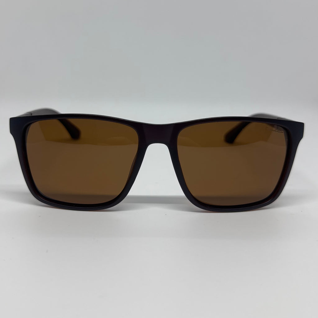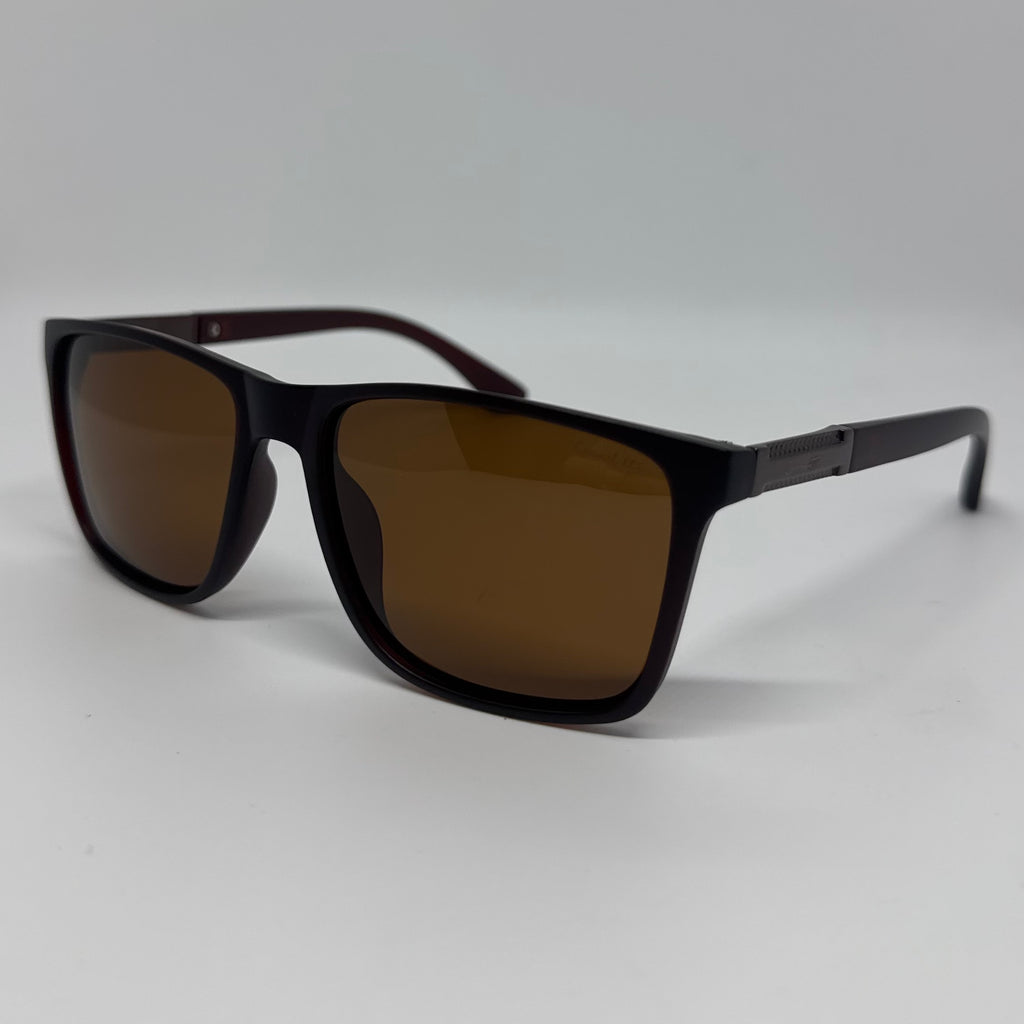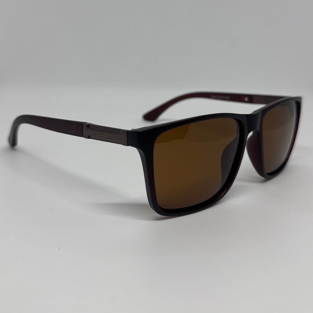 Óculos com hastes em acetato marrom com detalhes em metal bronze e lente marrom polarizada.