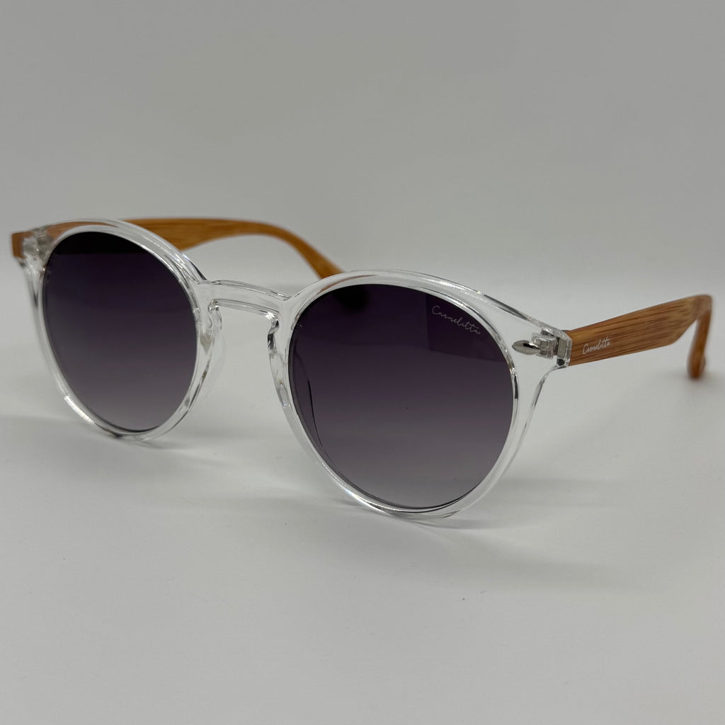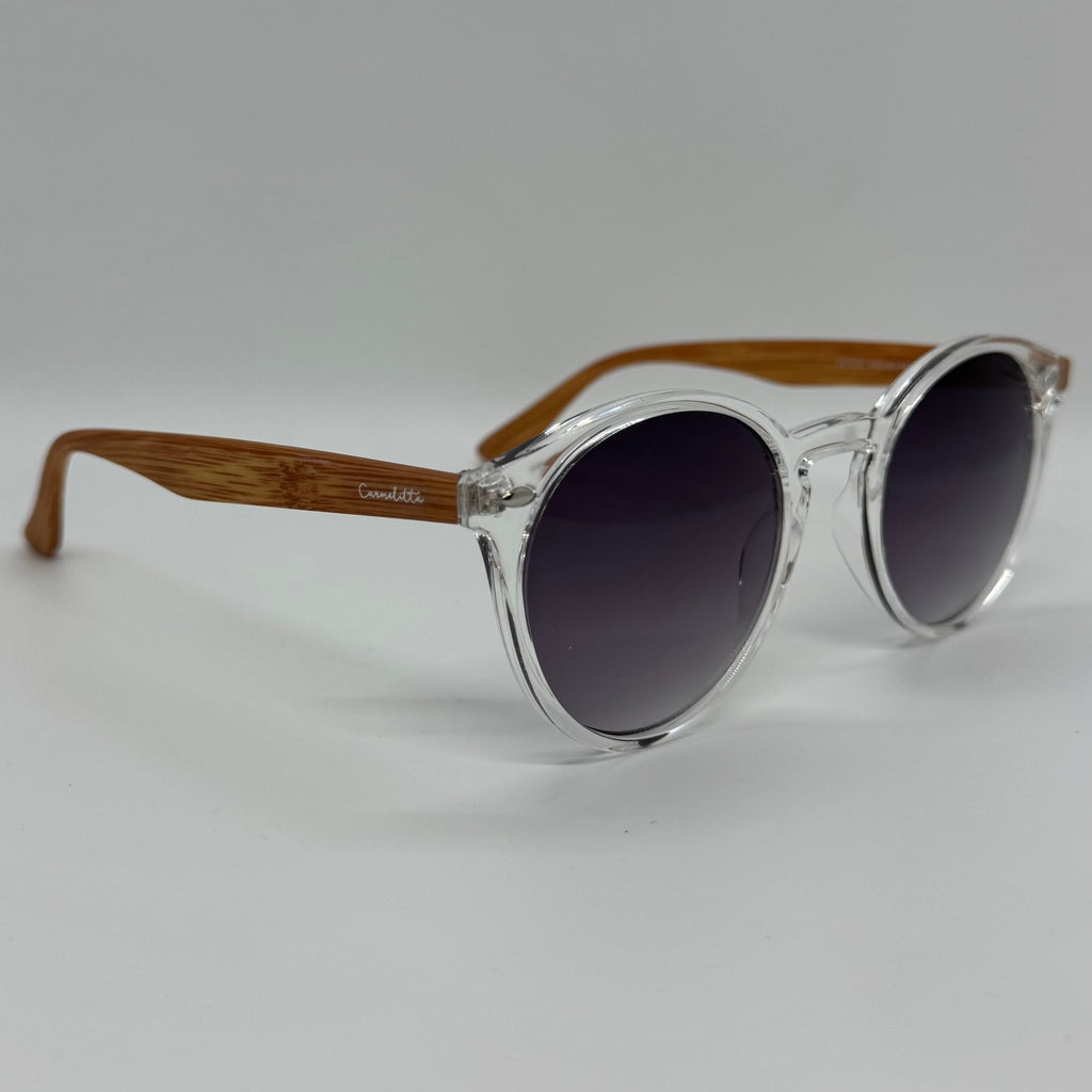 Óculos com hastes em bambu e frente em acetato transparente com lente roxa degrade.