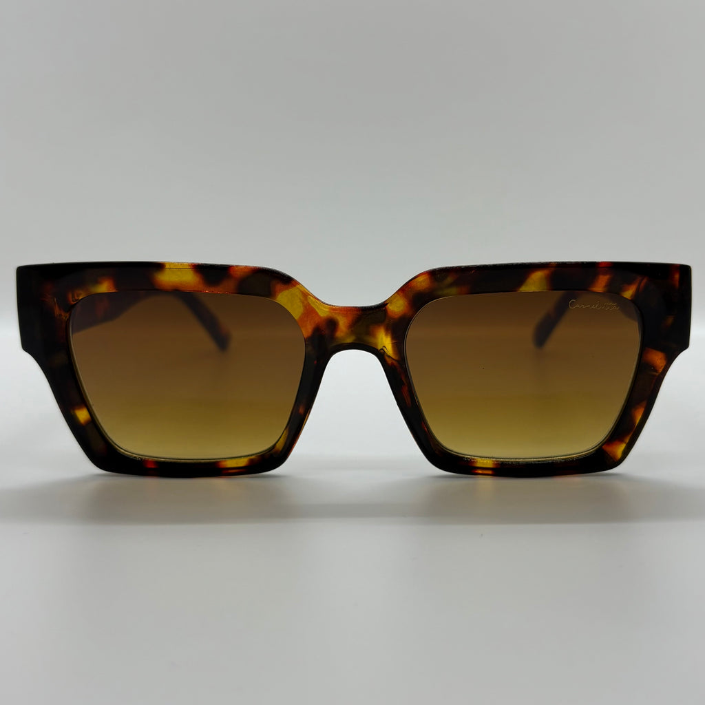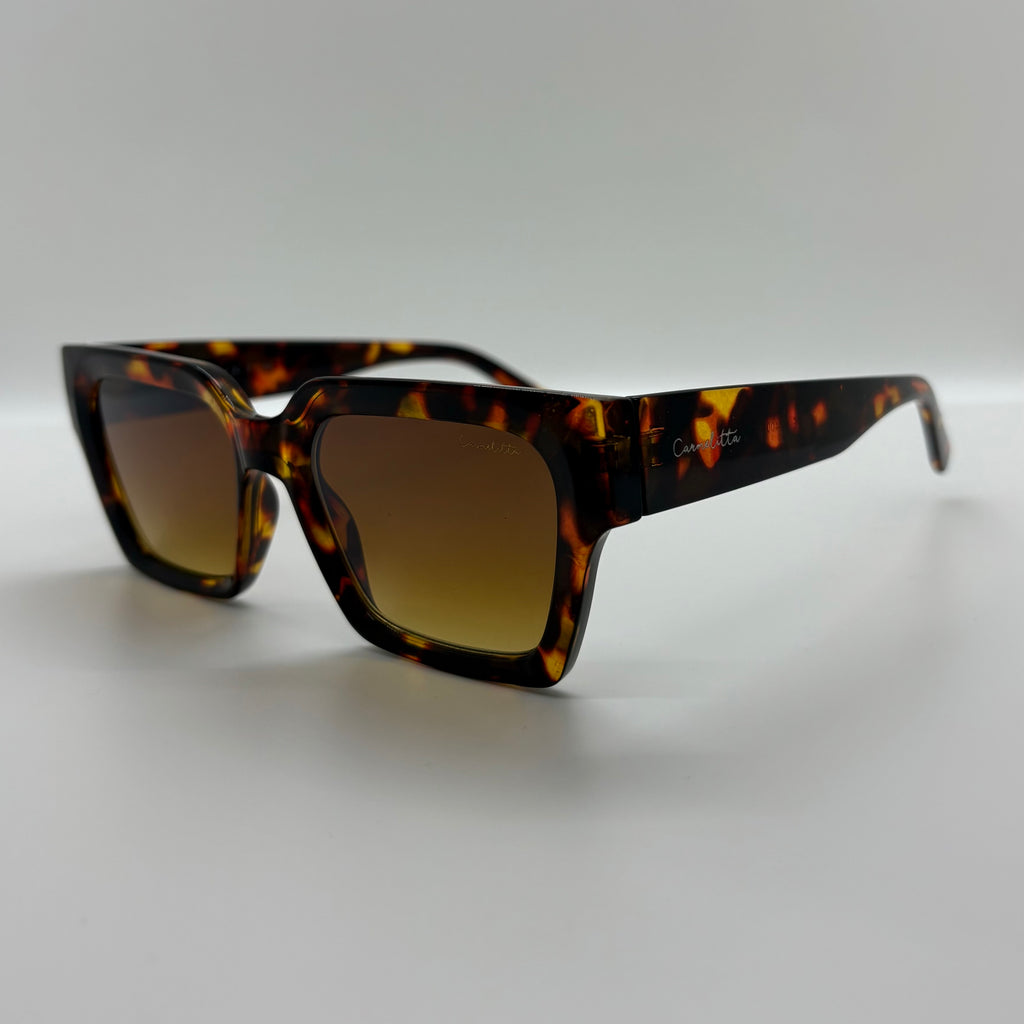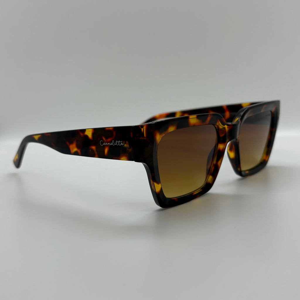 óculos com armação e hastes em tartaruga( tons de marrom e âmbar) em acetato e lentes marrom degradê.