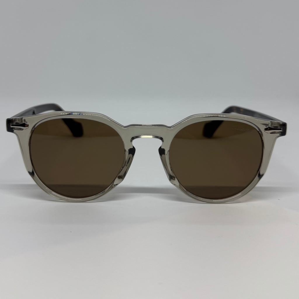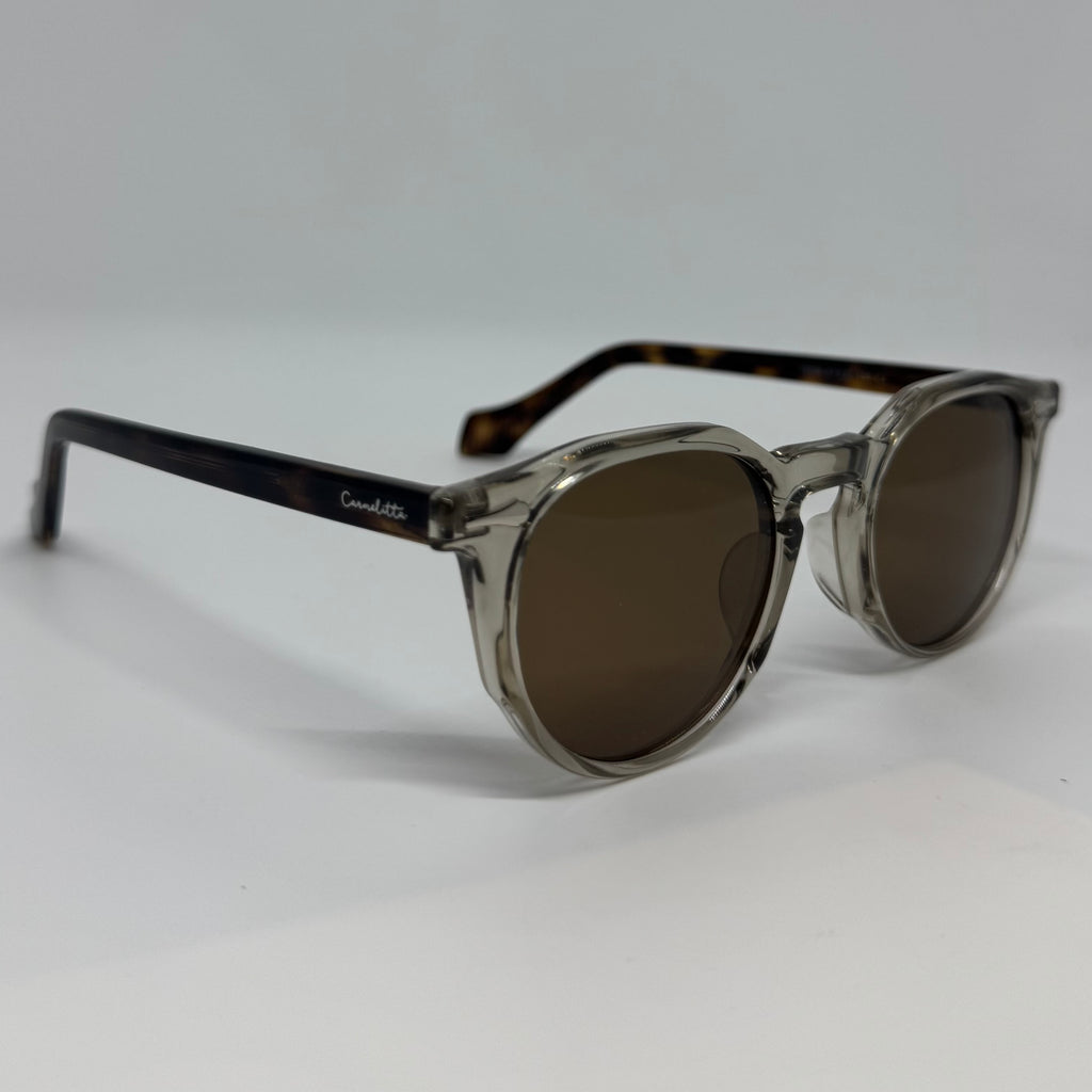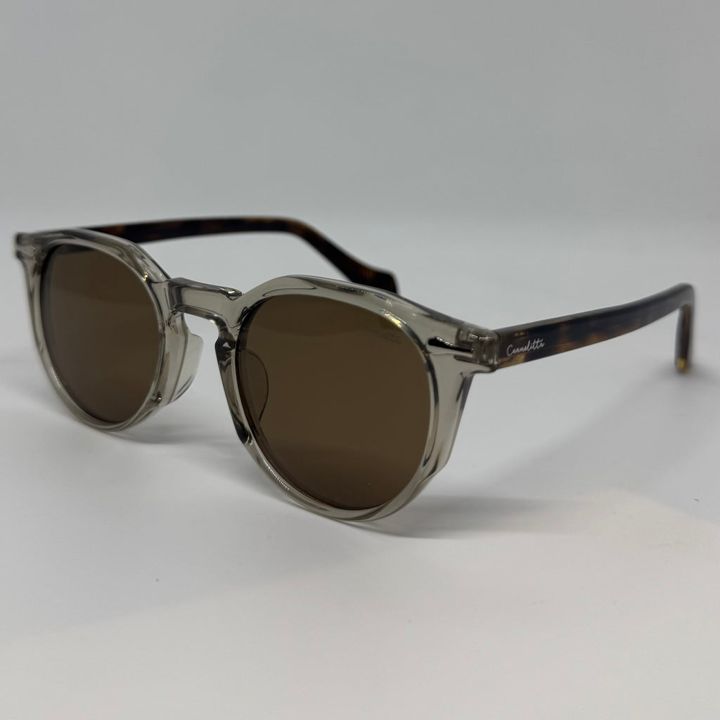 Óculos com hastes em acetato tartaruga com frente em acetato cinza fume e lente marrom polarizada.