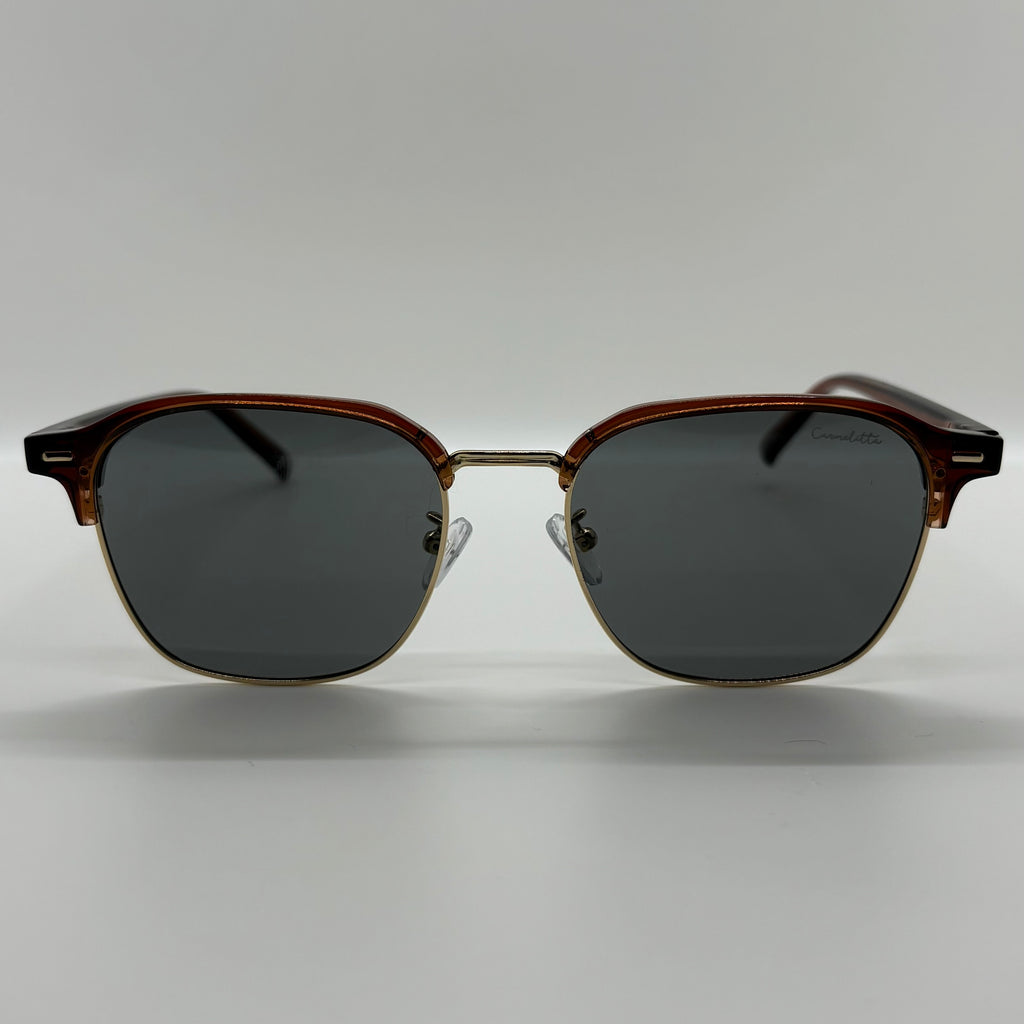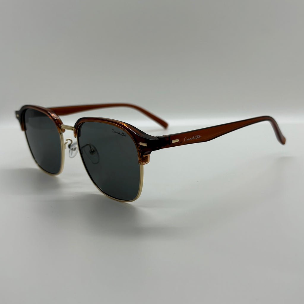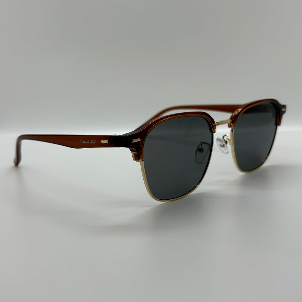 óculos com armação em metal e acetato em marrom translúcido com detalhes dourados, hastes marrom e lentes preto fumê.