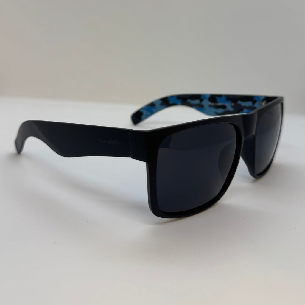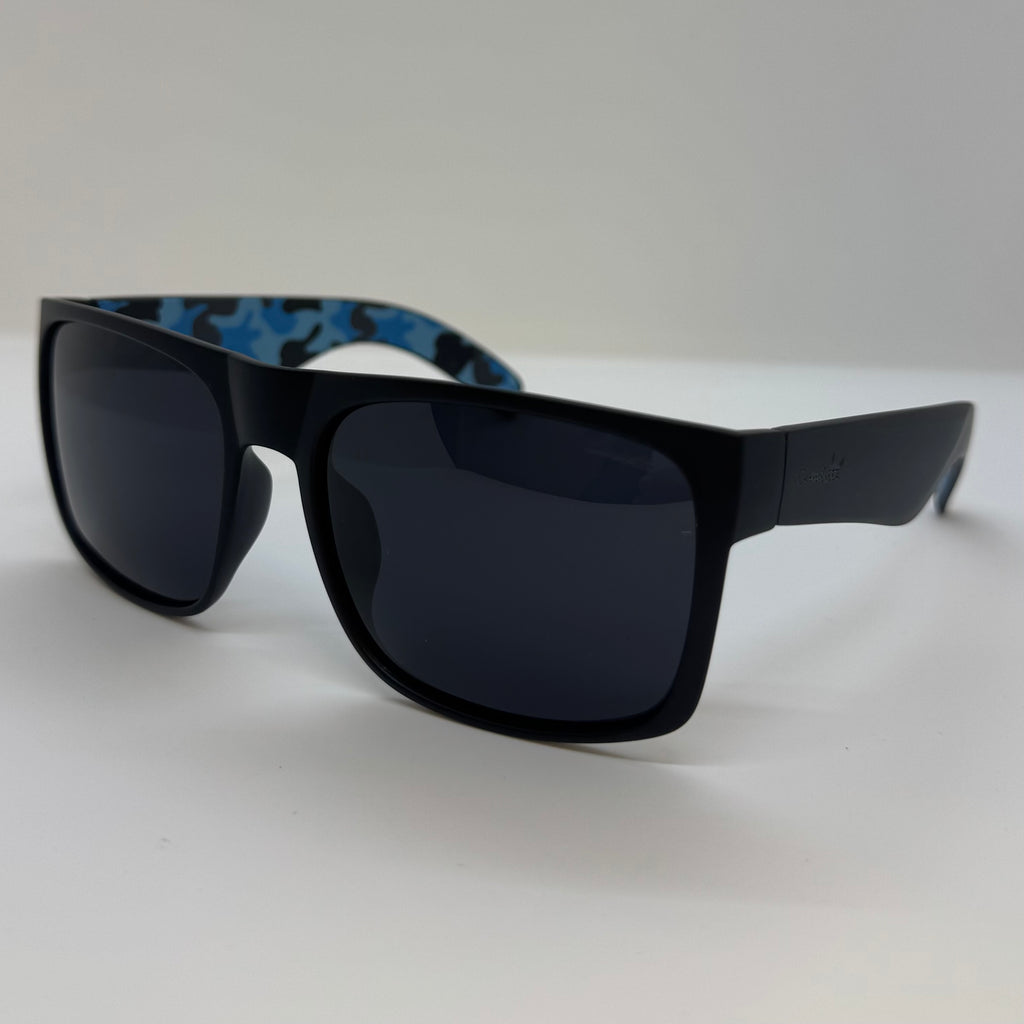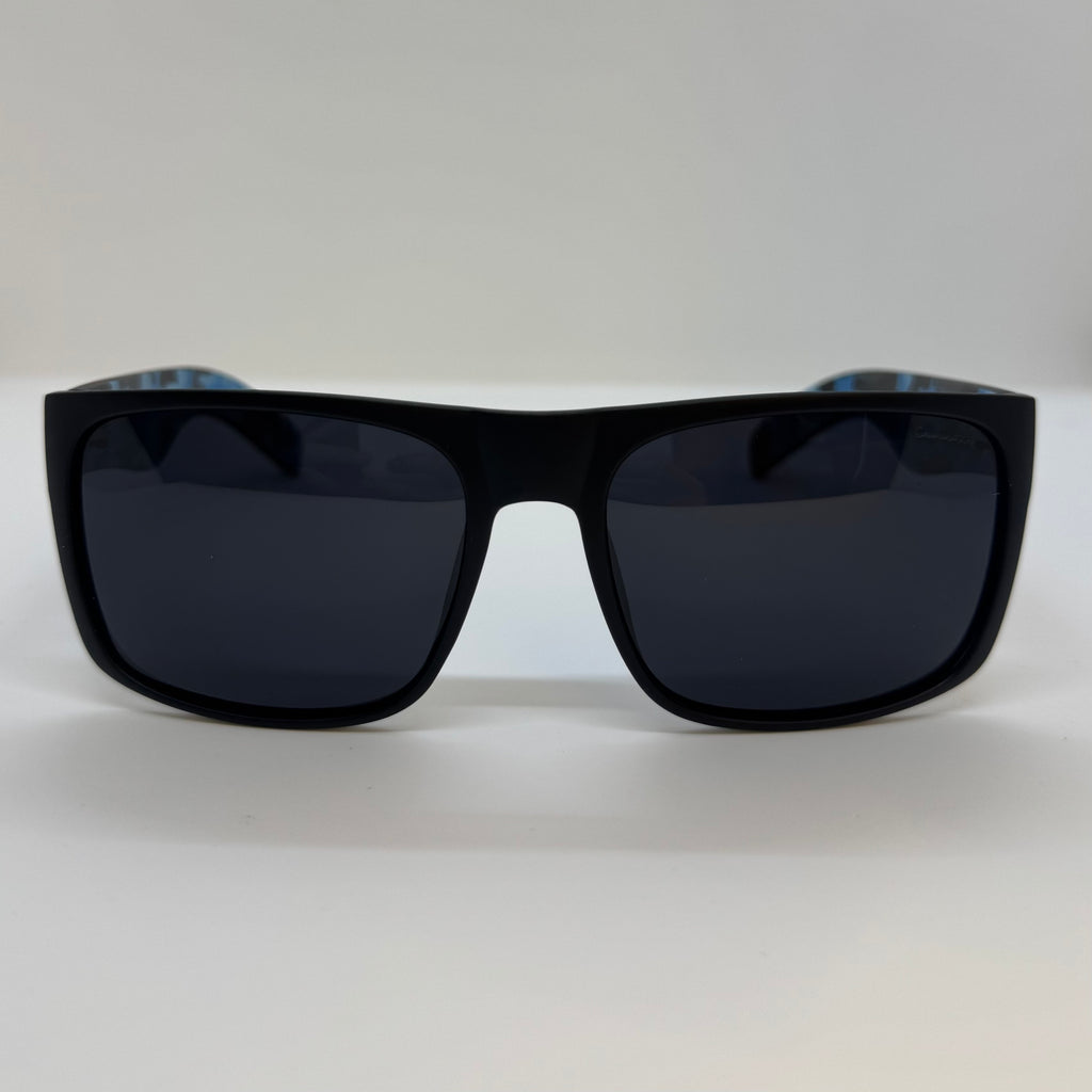 Óculos com hastes em acetato preto com interior desenhado na cor azul e lente preta polarizada.