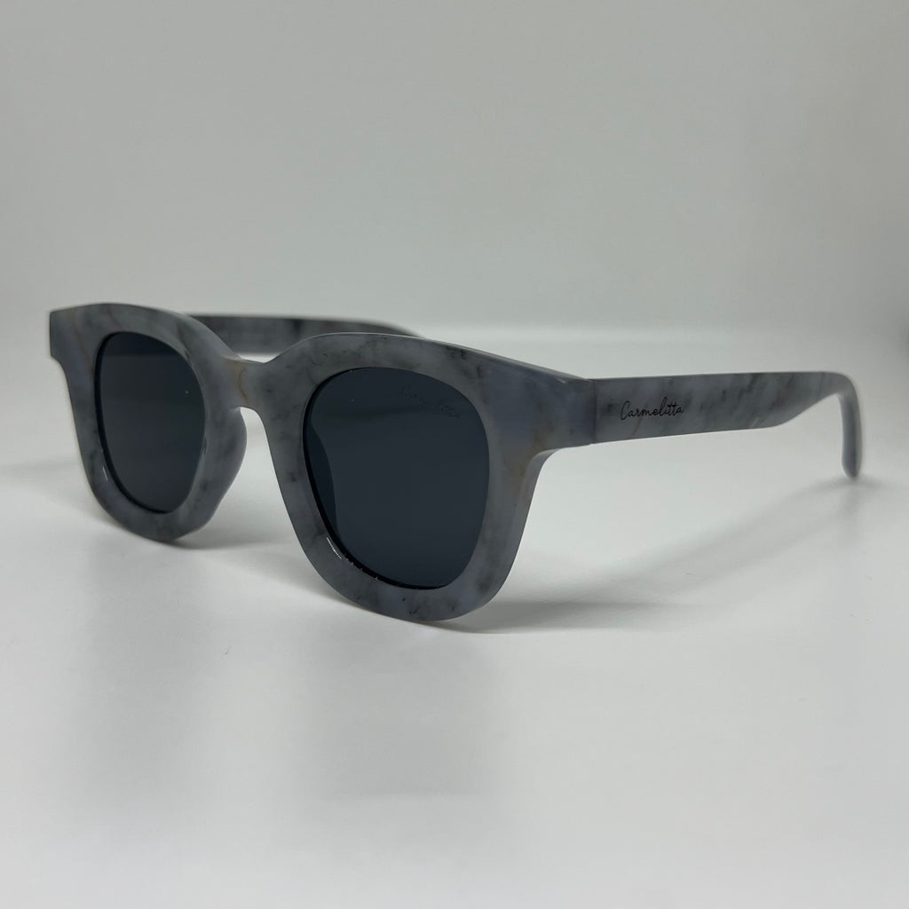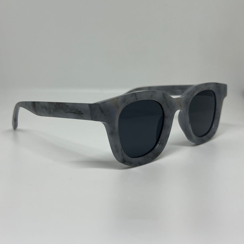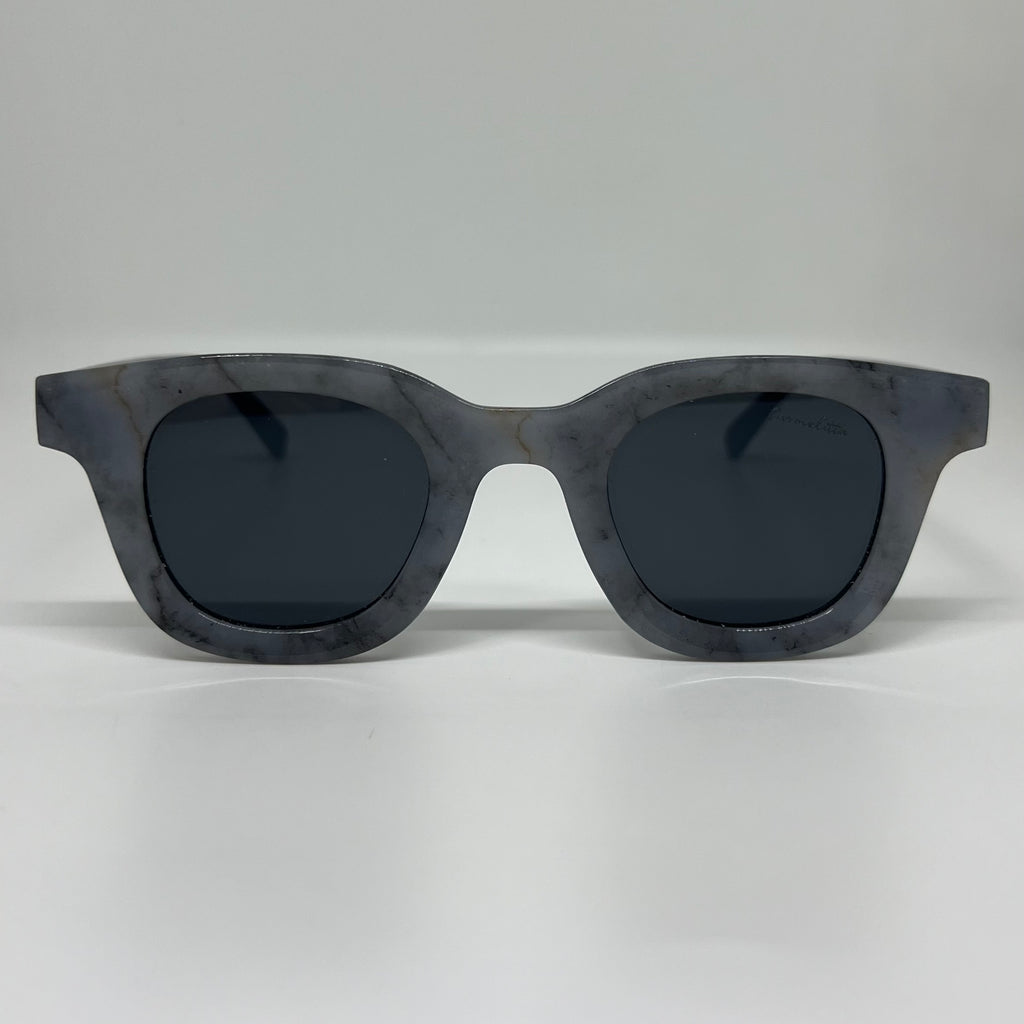 Óculos com hastes em acetato italiano na cor mármore e lente preta.