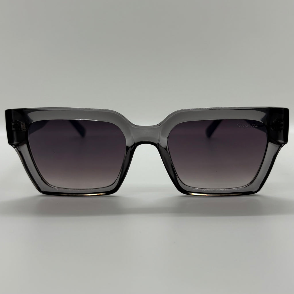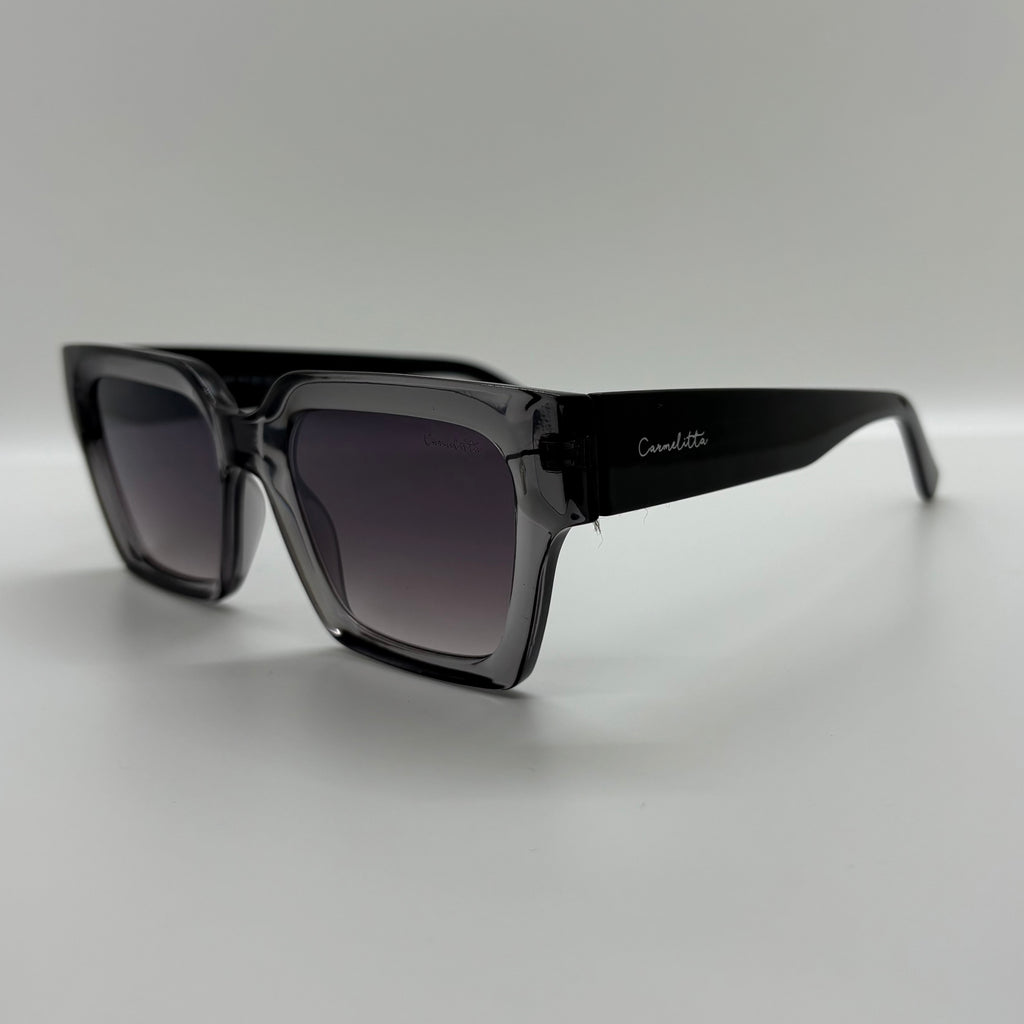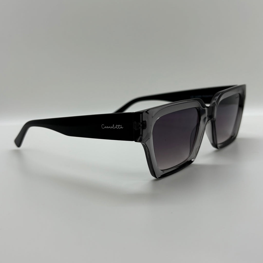 óculos com armação na cor cinza fumê translúcido, hastes preta em acetato, e lentes em cinza degradê.