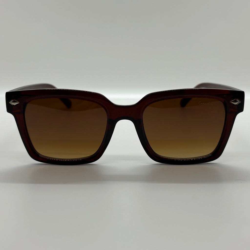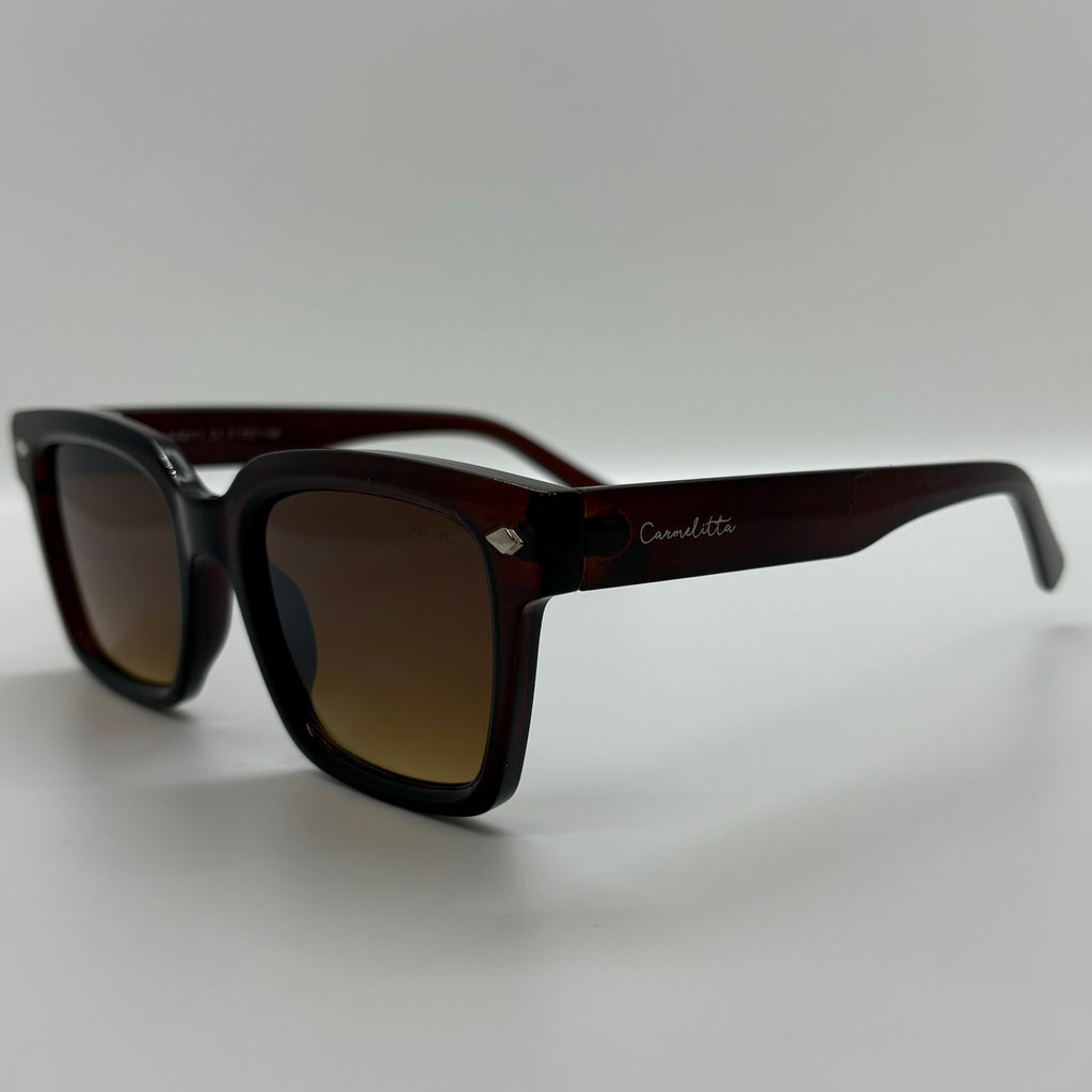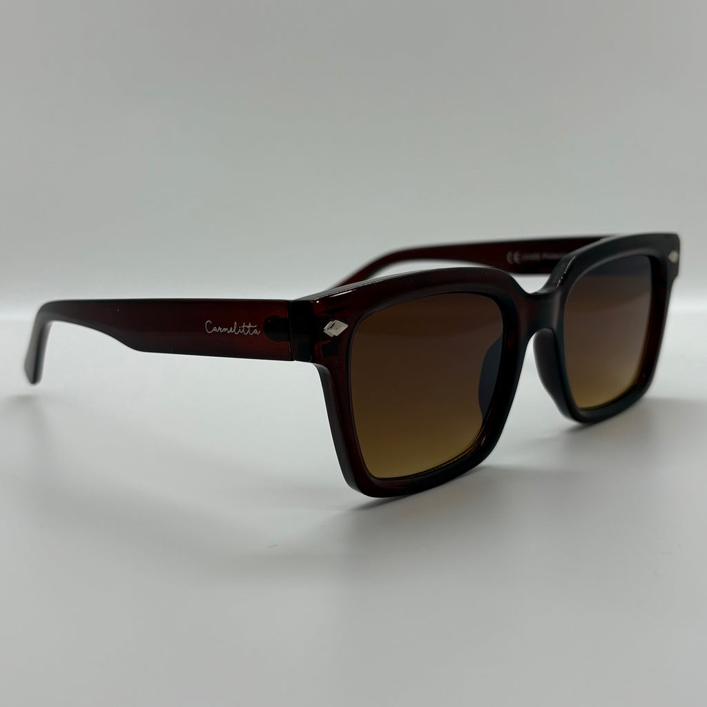 óculos armação marrom escuro em acetato, com um detalhe pequeno e brilhante de losango na frente da armação, hastes em marrom e lentes em marrom degradê.