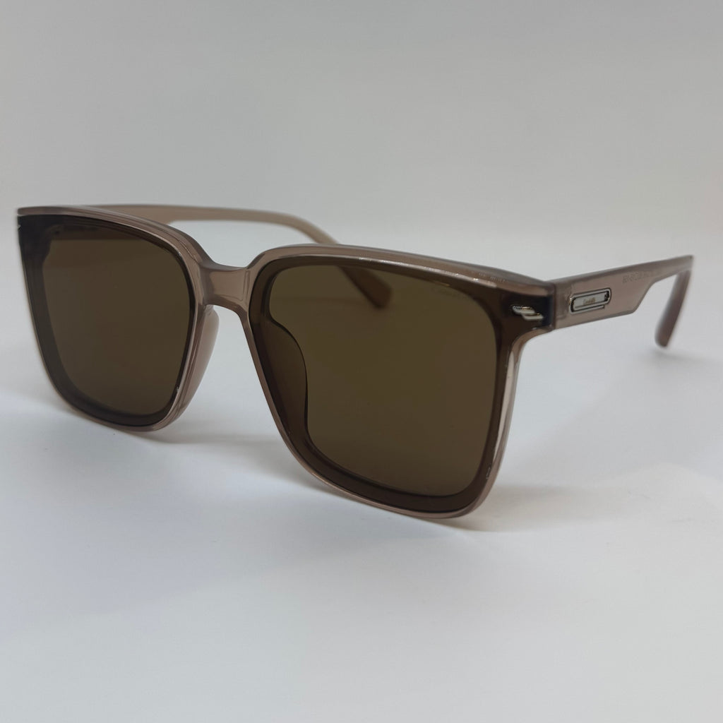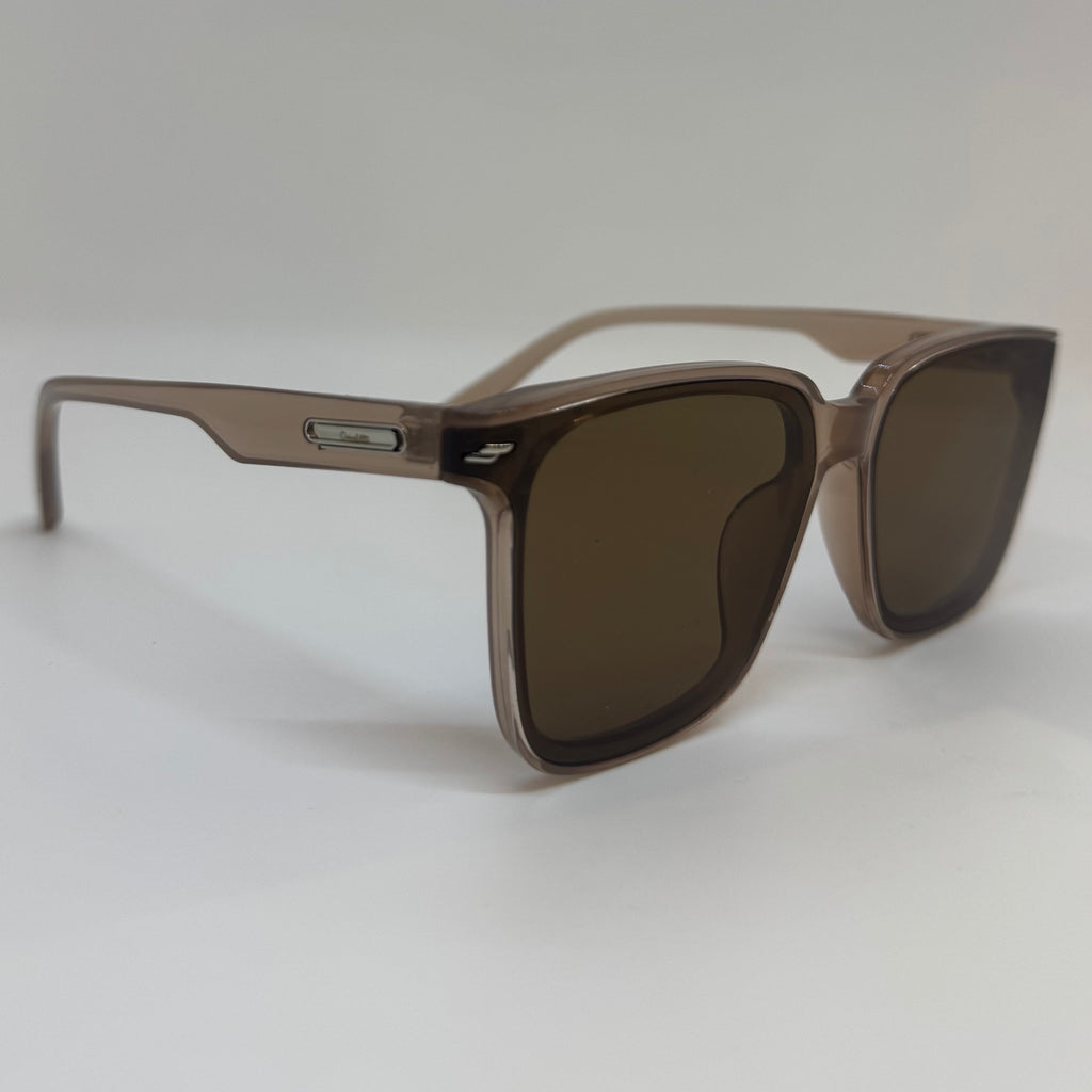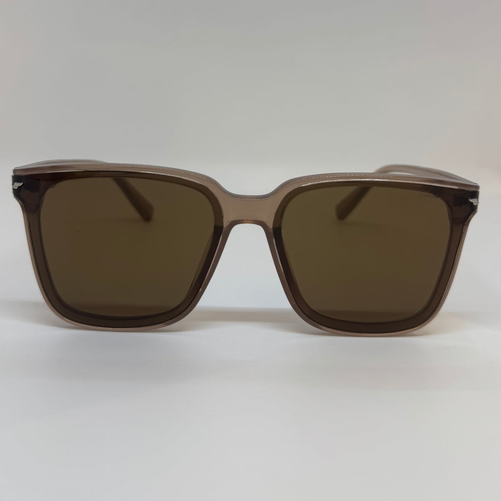 Óculos com hastes em acetato rose translúcido com lente marrom.