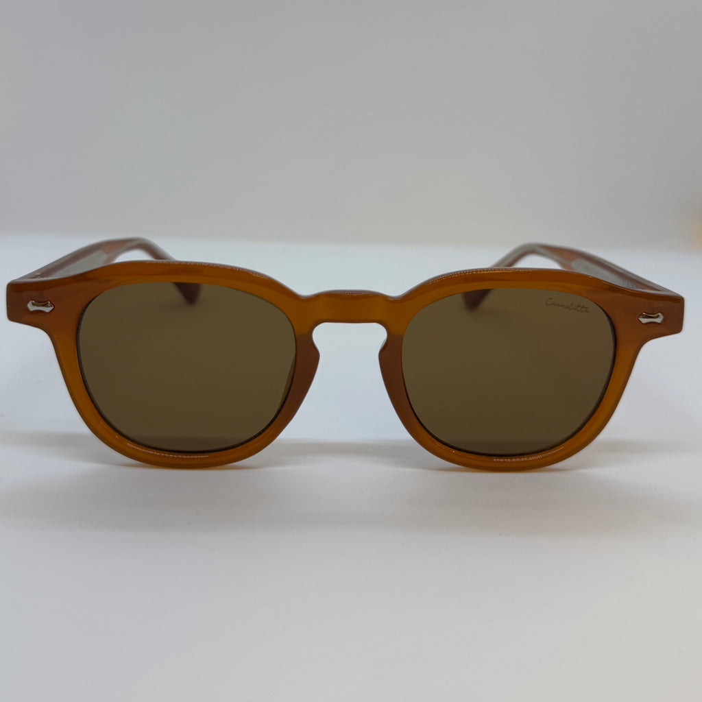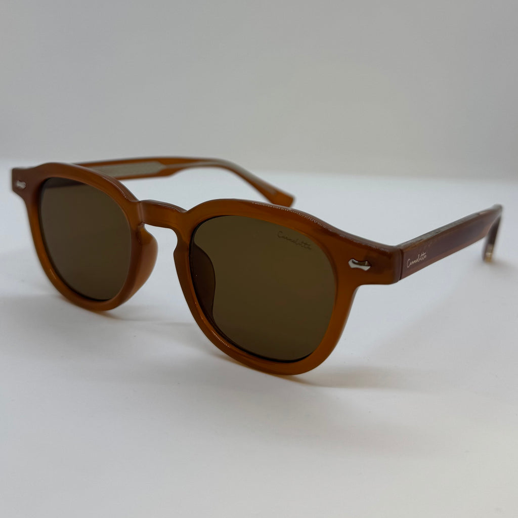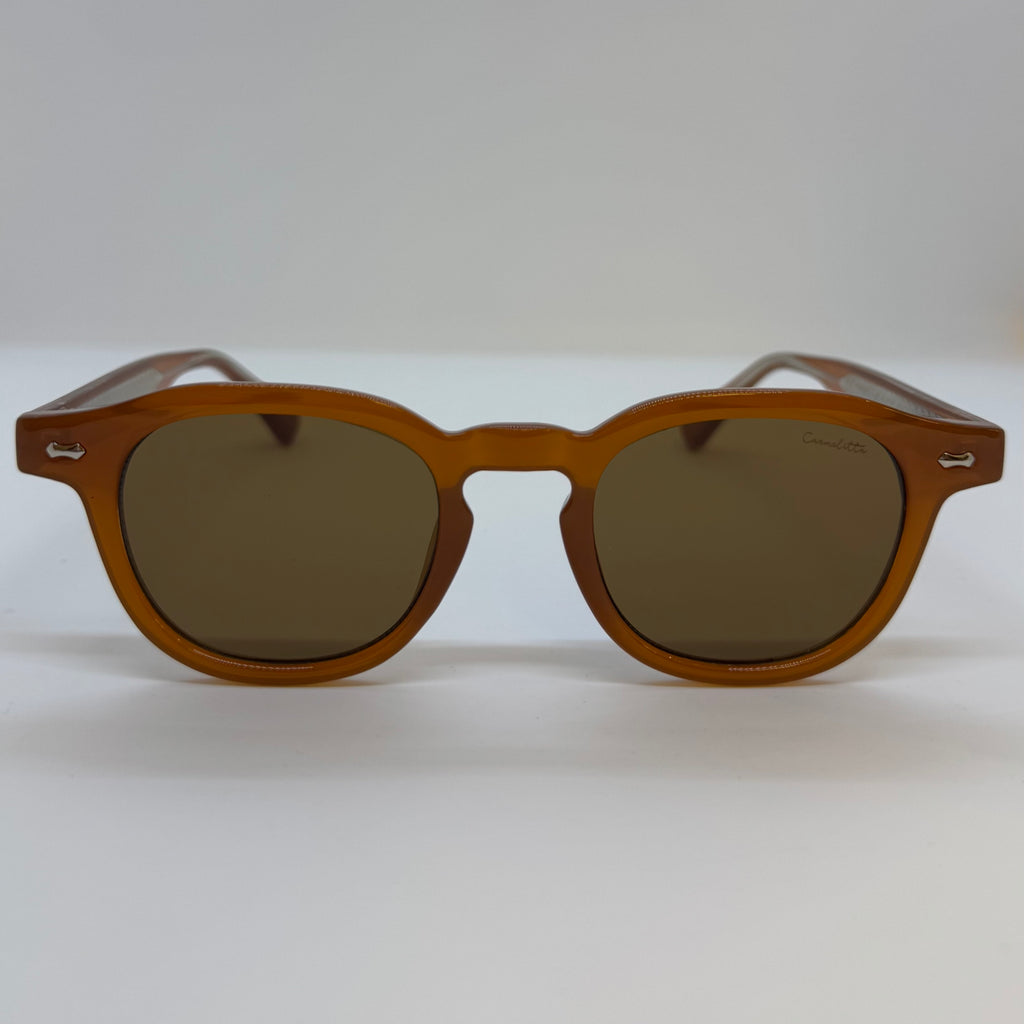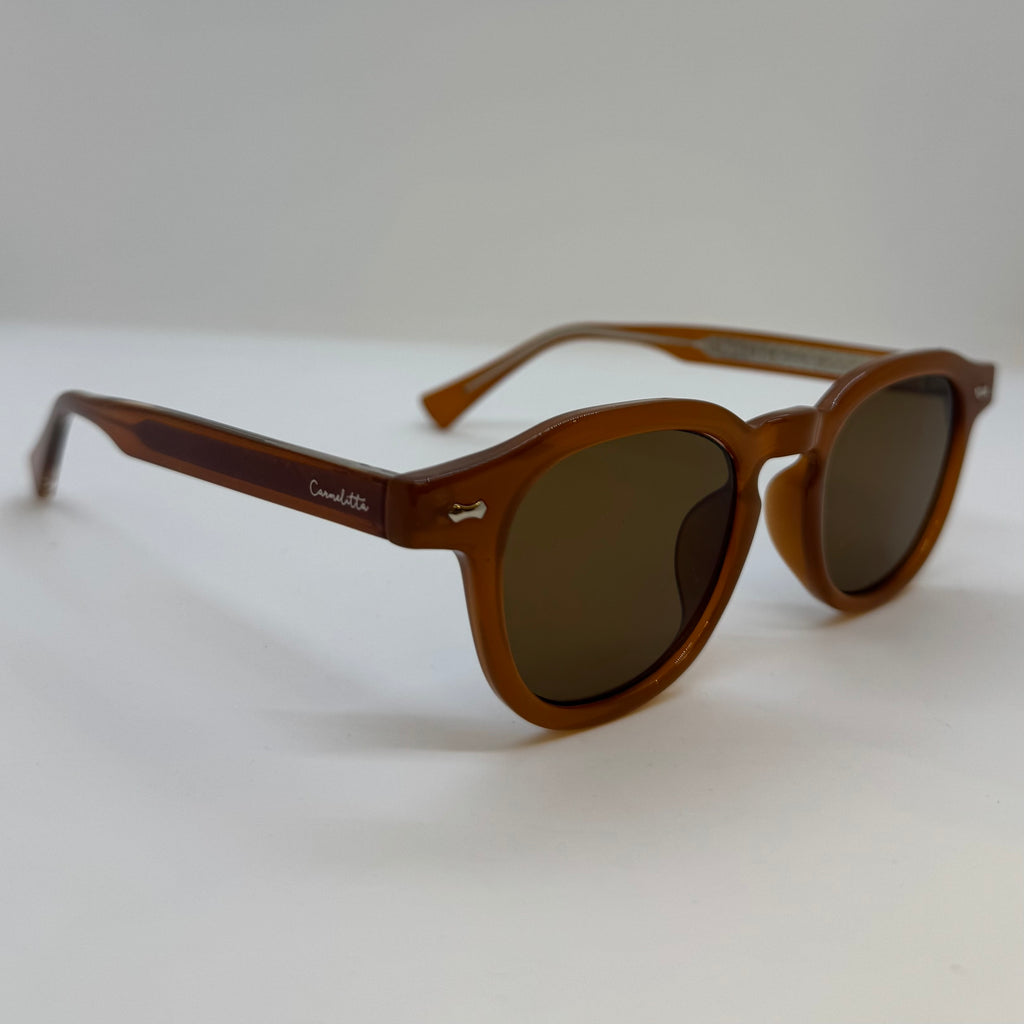 Óculos com armação em acetato de alta qualidade na tonalidade marrom caramelo, modelo redondo levemente achatado na parte superior, hastes firmes em marrom com detalhe metálico discreto próximo à dobradiça e lentes em marrom.