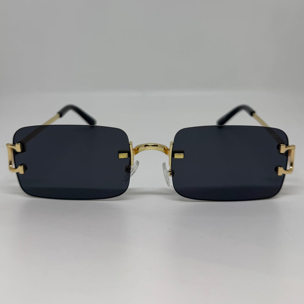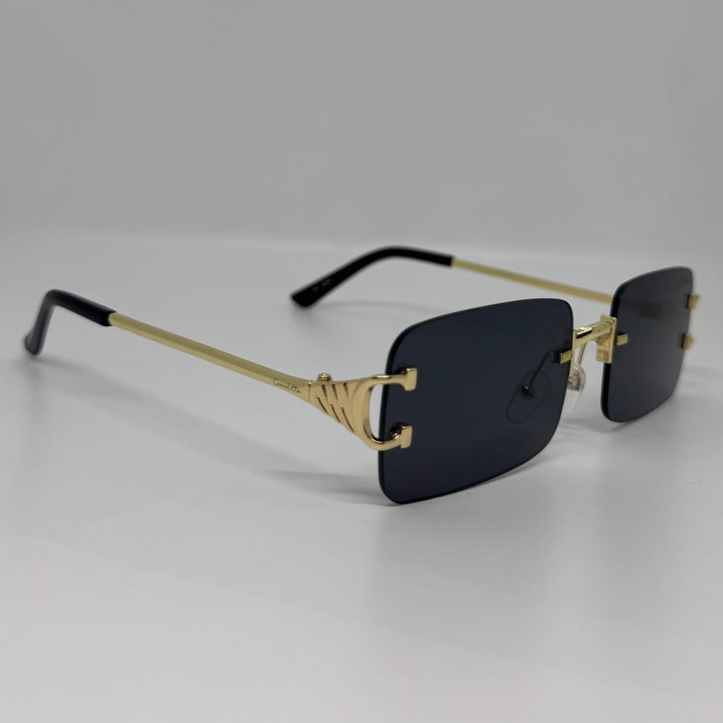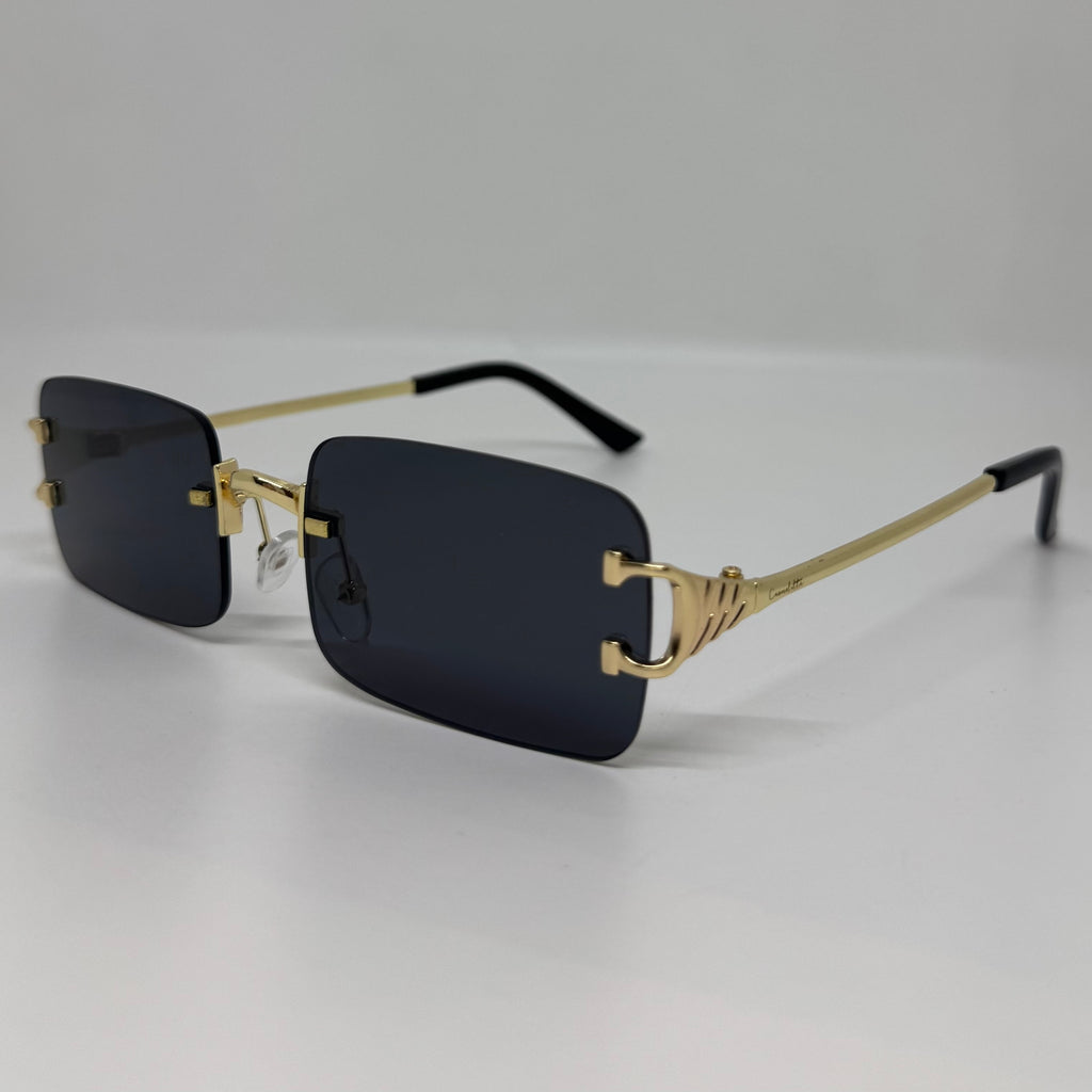 Óculos com hastes em metal dourado com lente preta.