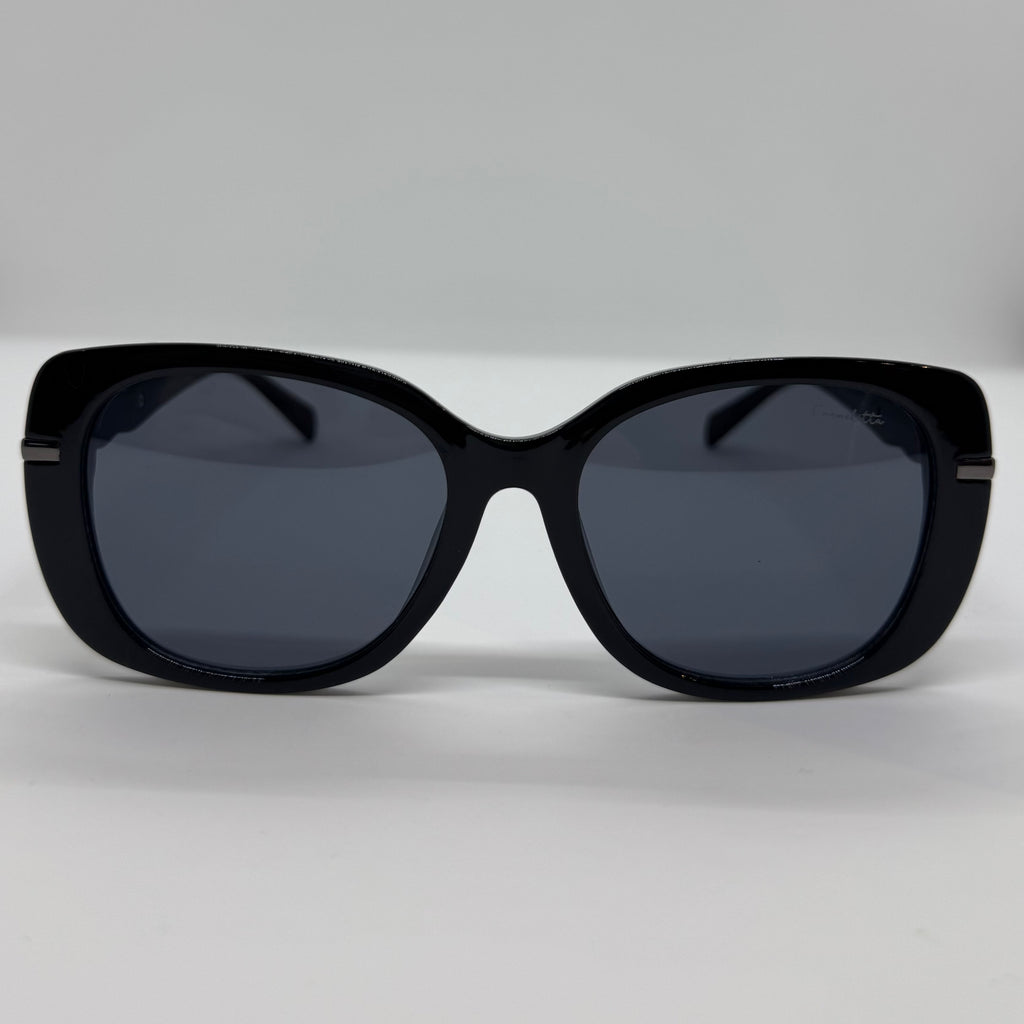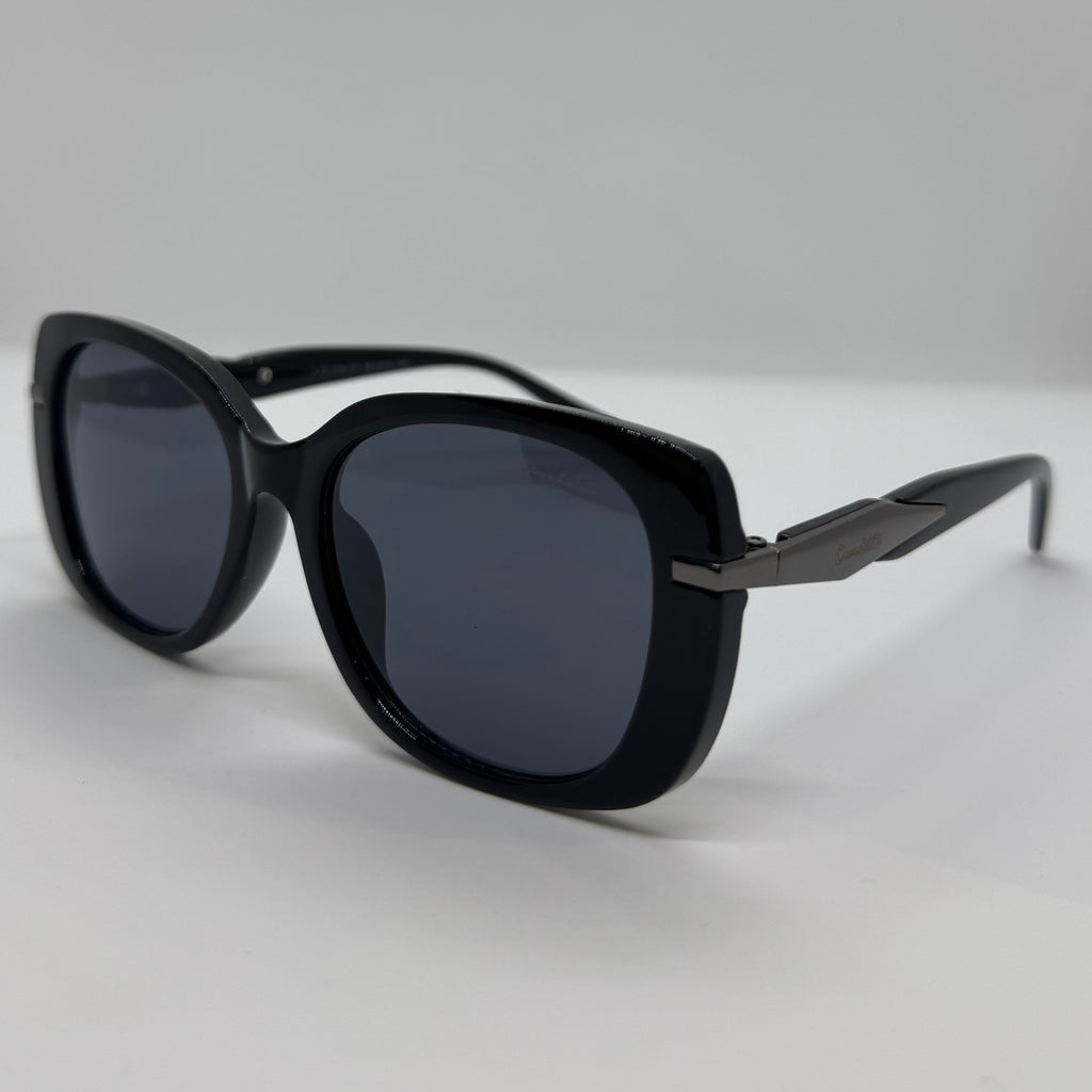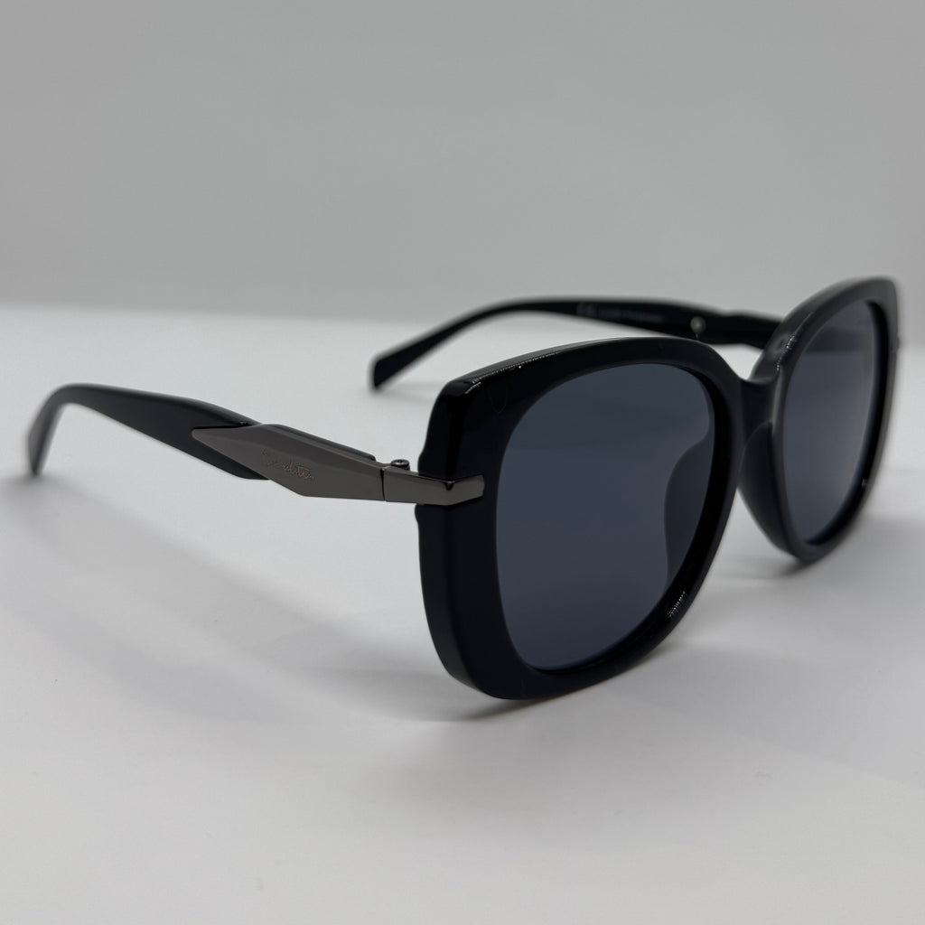 Óculos com armação produzida em acetato preto de alta qualidade, lentes fumê, hastes em metal grafite com detalhe geométrico sofisticado proximo as laterais, design de formato retangular levemente arredondado.