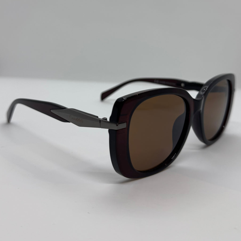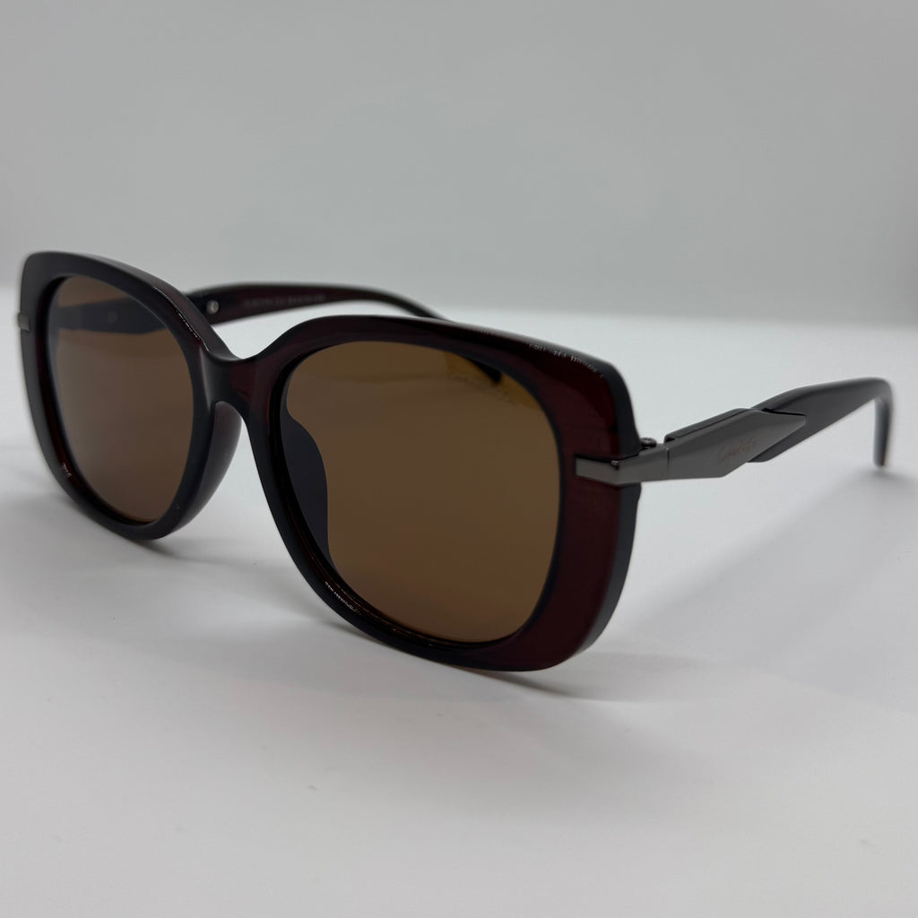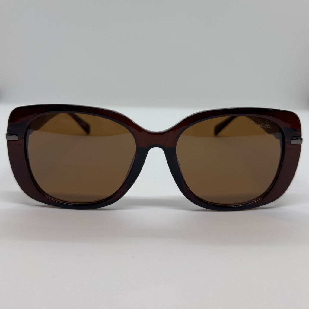Óculos com armação de estrutura em acetato marrom escuro, lentes em marrom, hastes com detalhe metalico prateado e finalização em acetato preto, design de formato levemente arredondado.