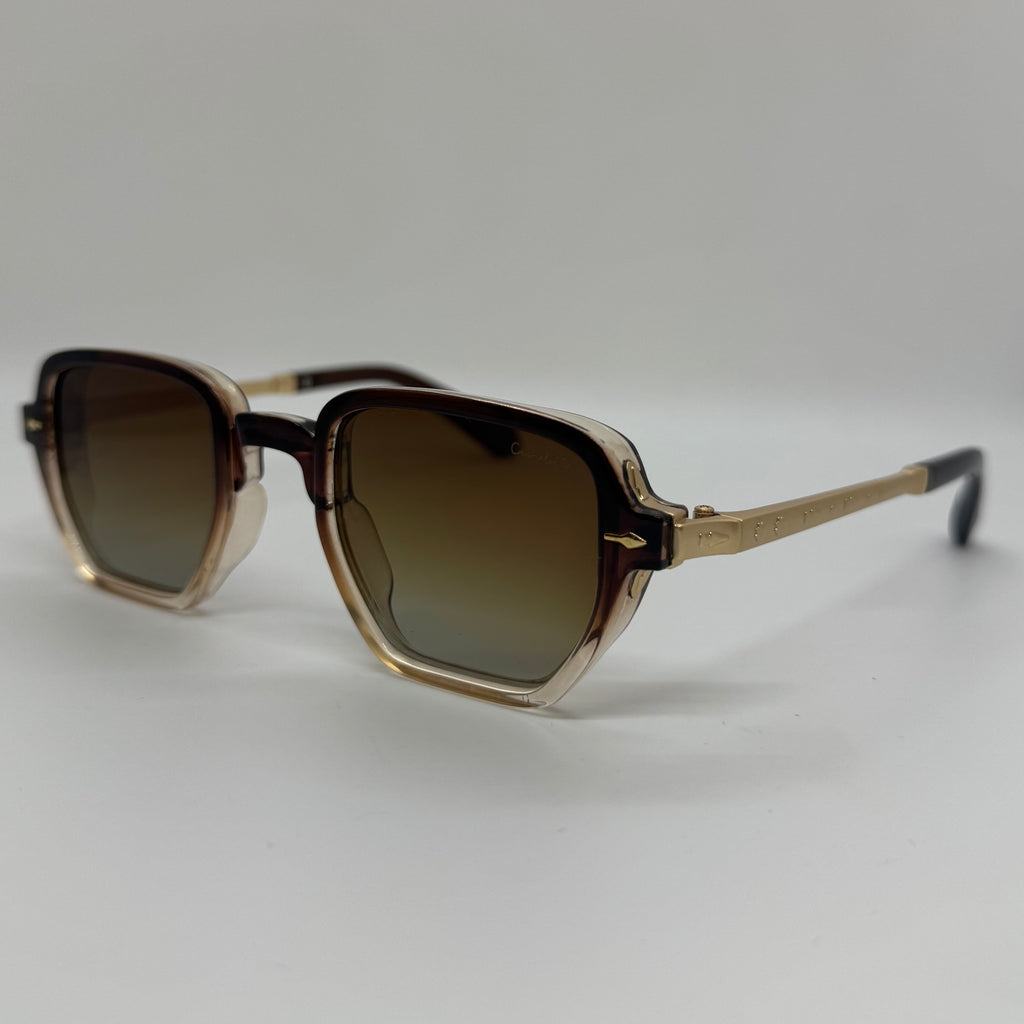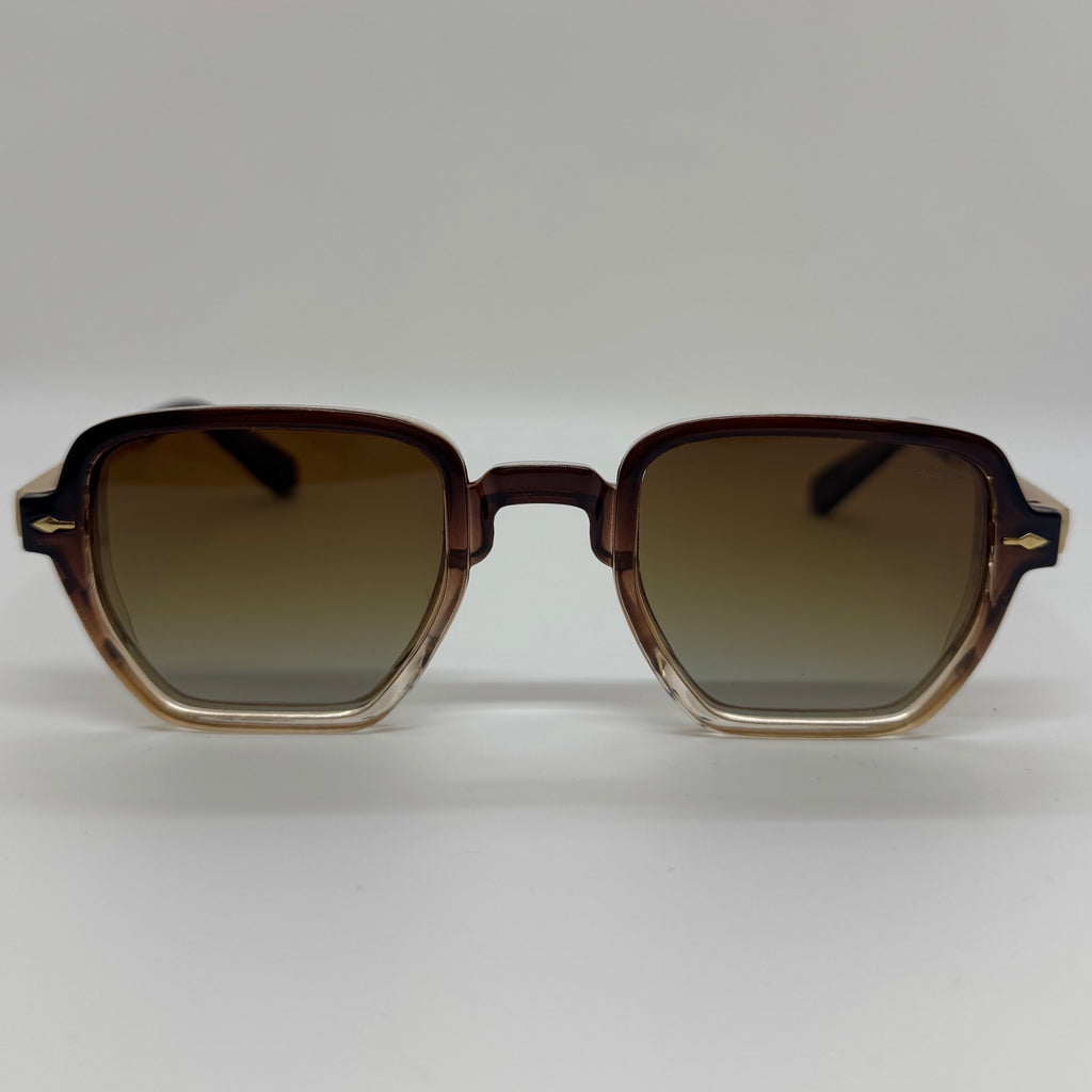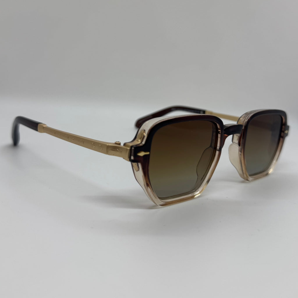Óculos com hastes em mental dourado com frente em acetato marrom degrade e lente marrom degrade.