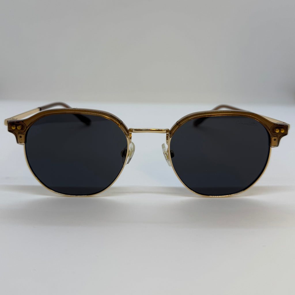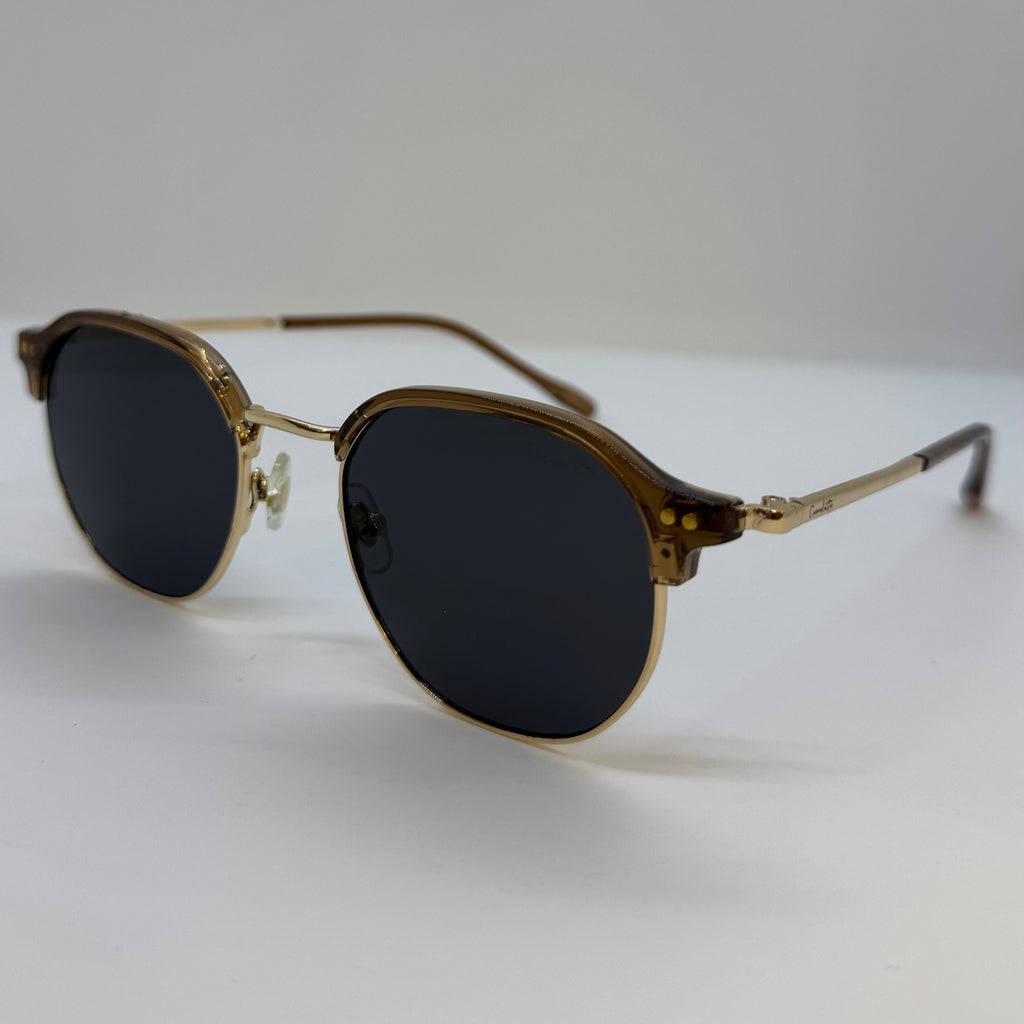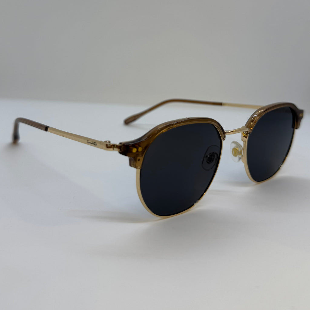 Óculos com combinação de metal leve com acetato de alta resistência na cor dourado com bordas em marrom, hastes douradas com ponteiras marrom, design arredondado, e lentes preta.