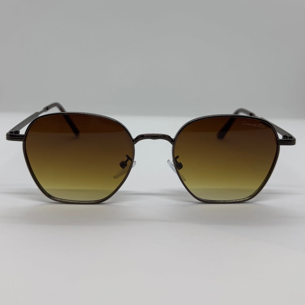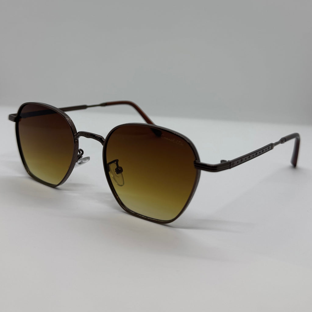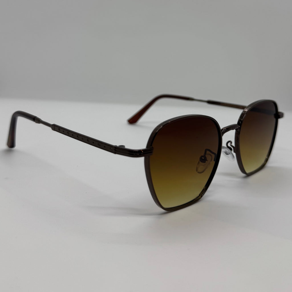 Óculos com armação em metal bronze, hastes em metal bronze seguindo o mesmo padrão da parte frontal e finalização em acetato na cor preta para encaixe mais confortável, lentes em marrom degradê garantindo melhor conforto visual, além de possuir um detalhe minimalista texturizado nas hastes que traz um ar de sofisticação.