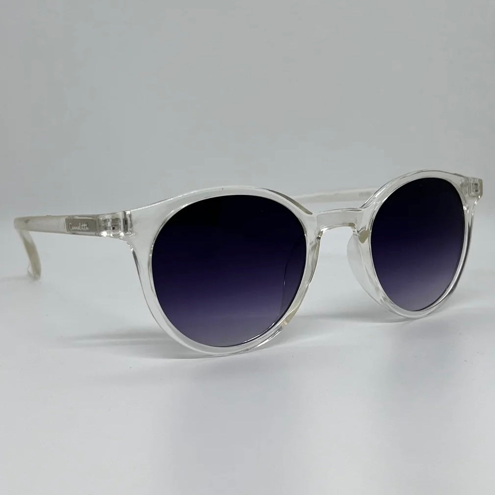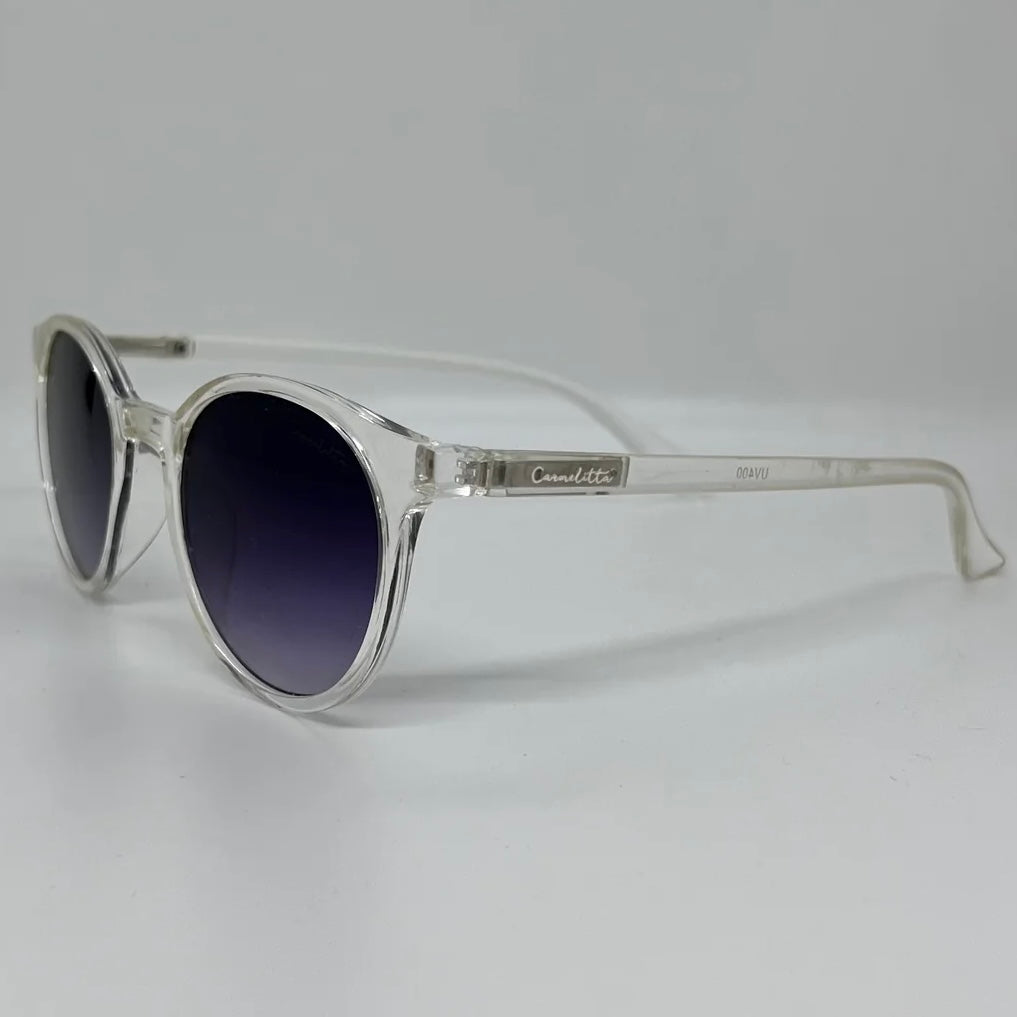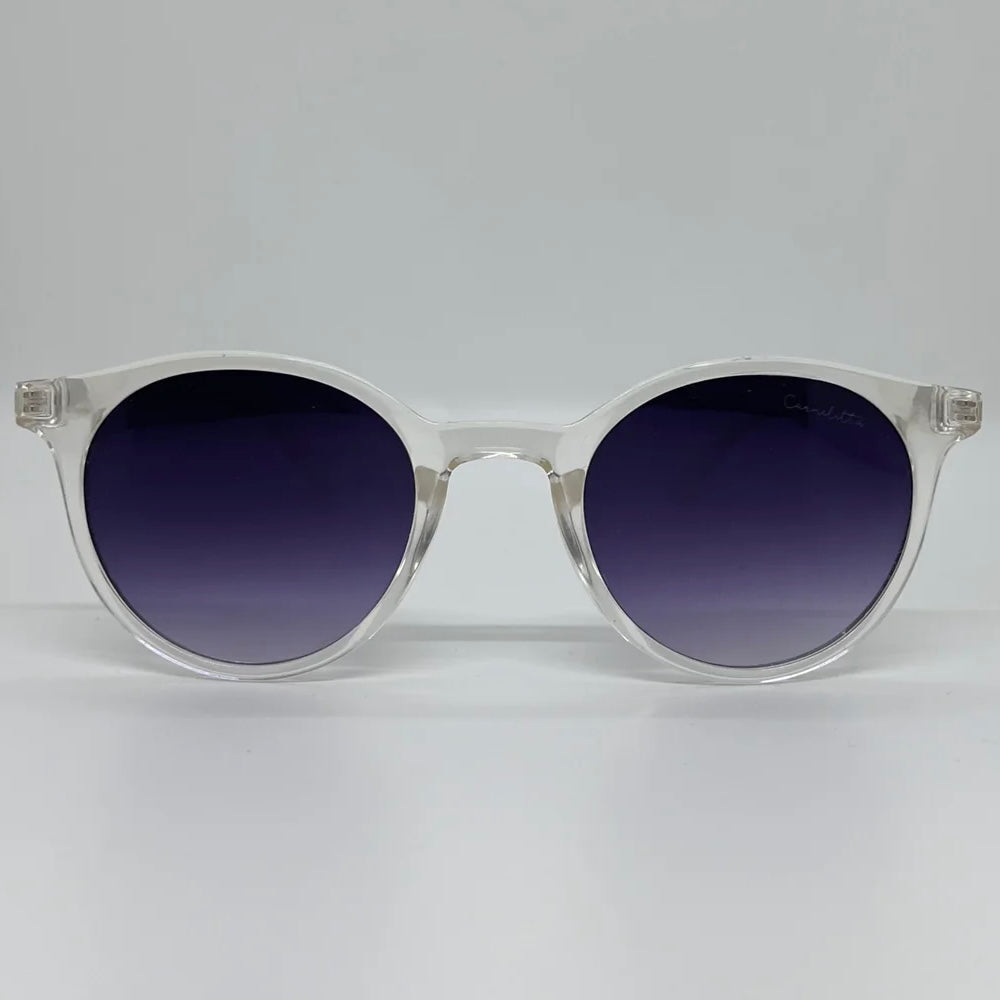 Óculos com hastes em acetato transparente com lente roxa degrade.