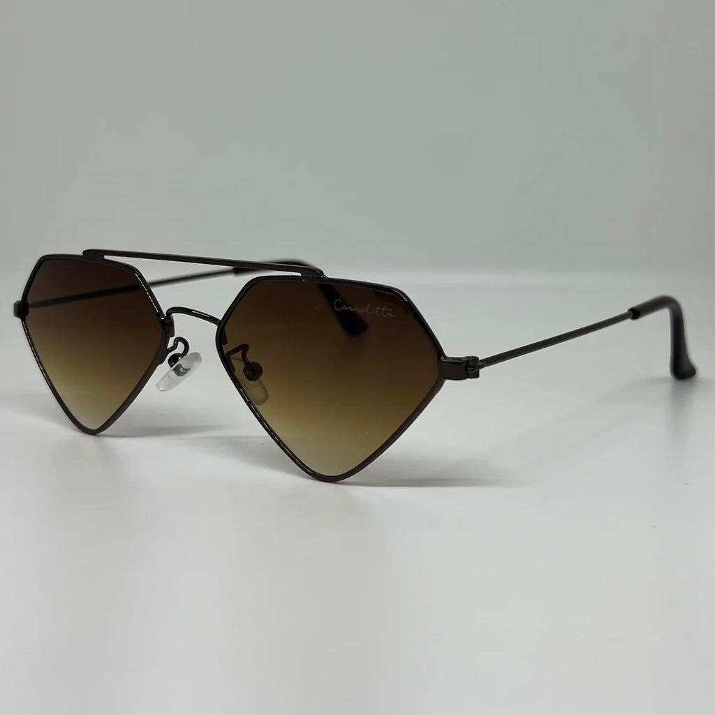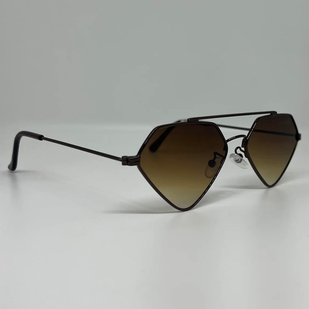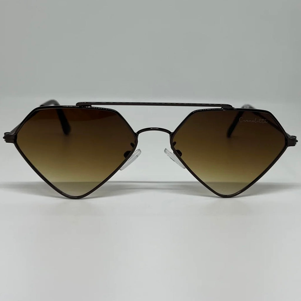 Óculos com hastes em metal, frente em acetato e lente marrom.