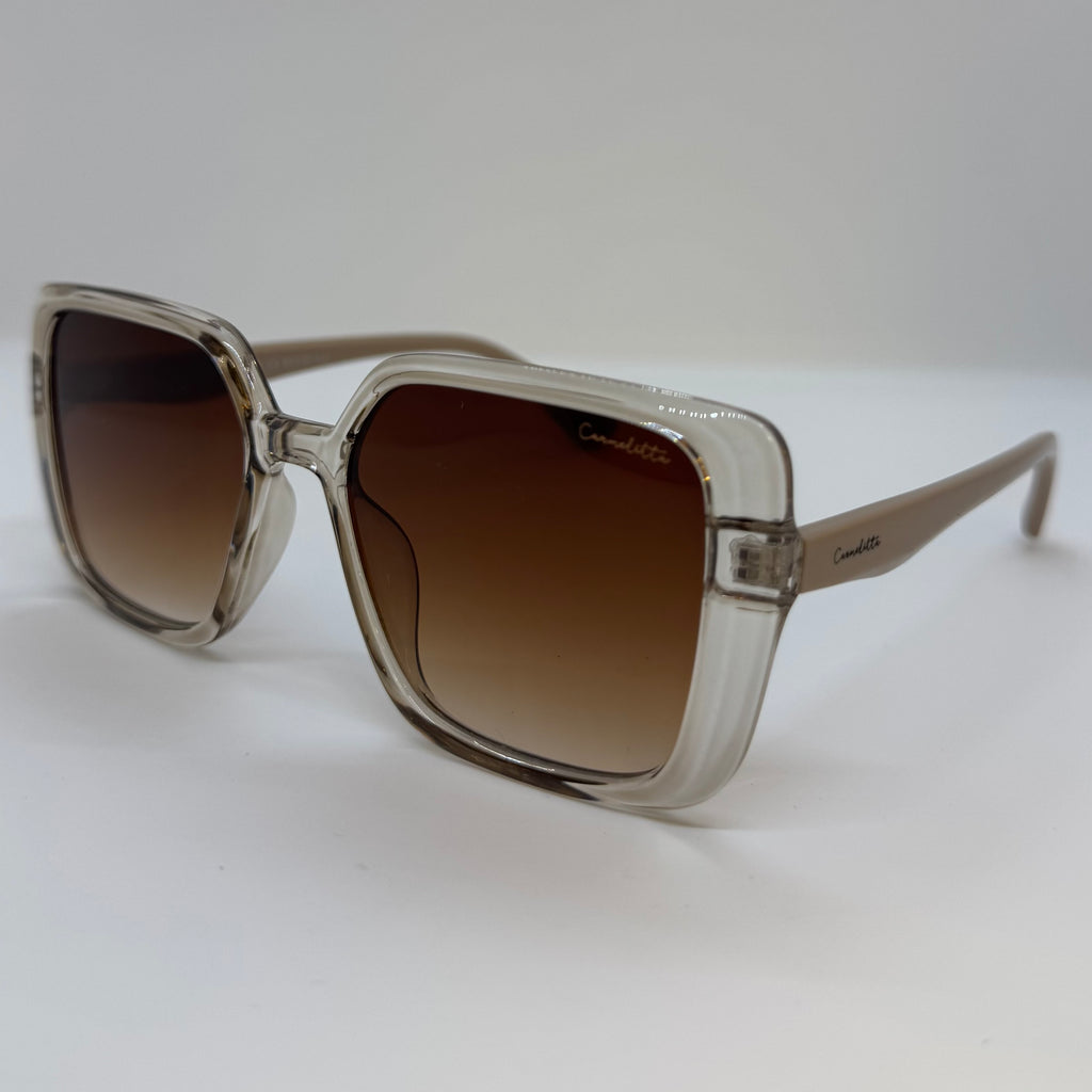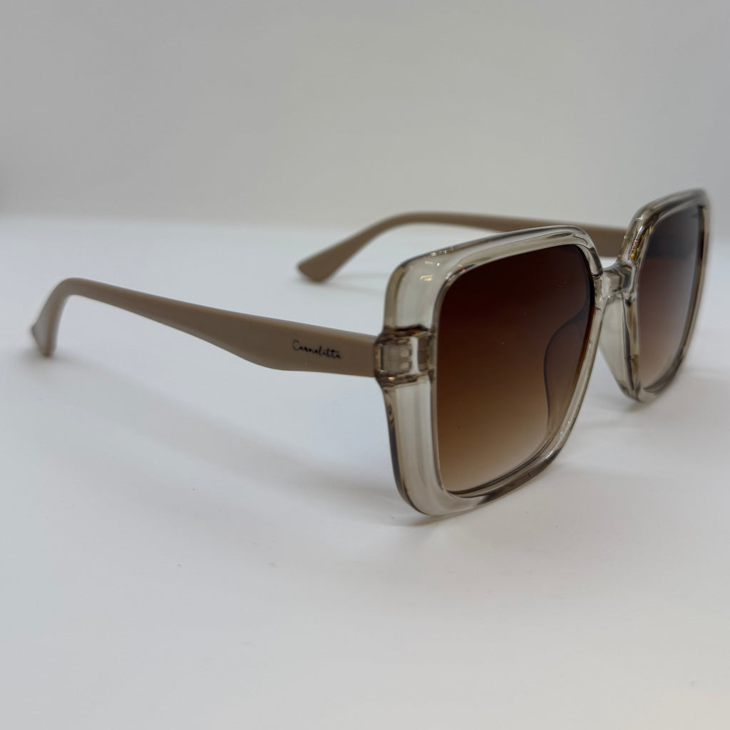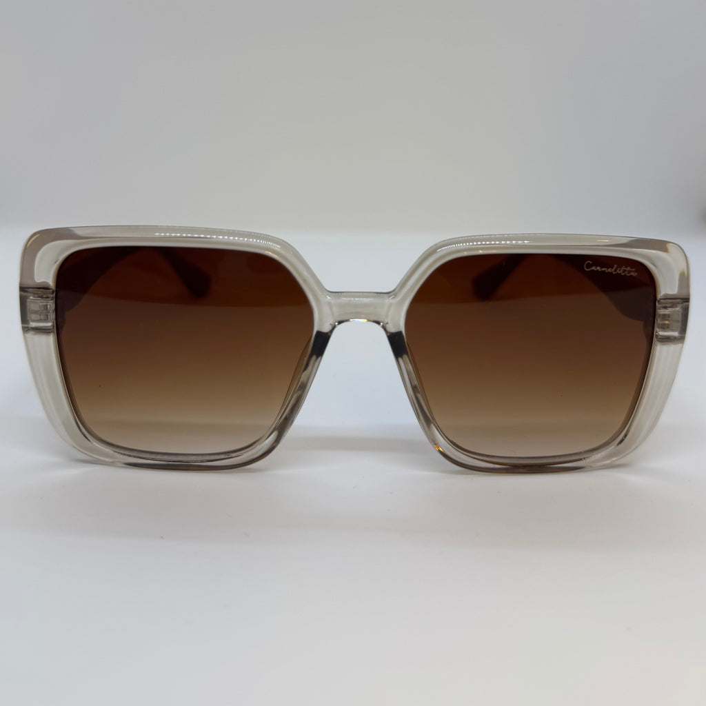 Óculos com hastes em acetato nude, frente nude translúcido e lente marrom degrade.