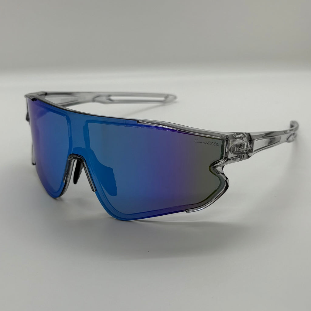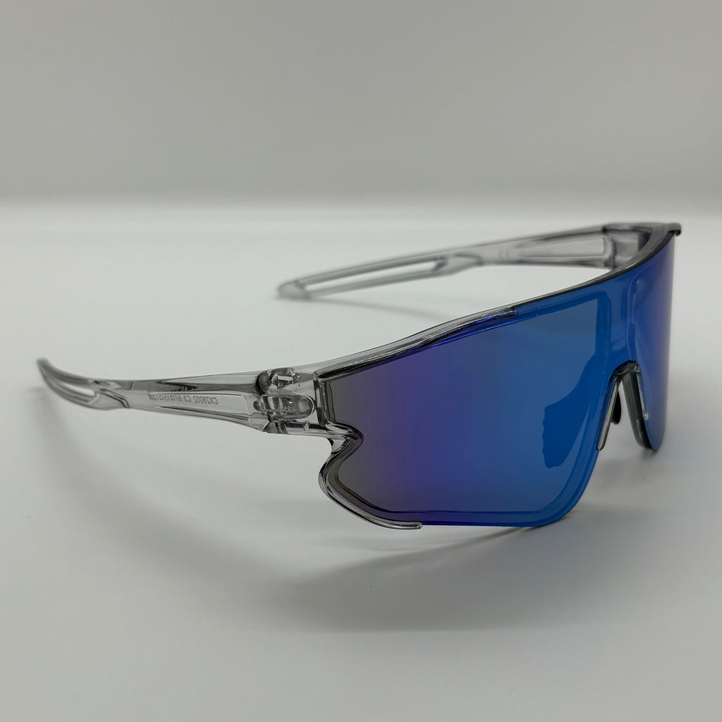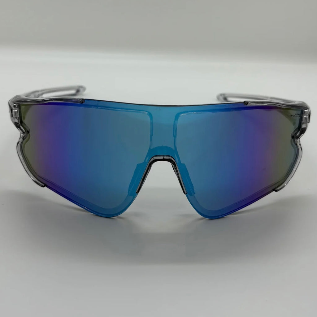 Óculos esportivo com armação transparente em acetato, hastes com curvatura anatômica e lentes espelhada em azul com reflexos arroxeados.
