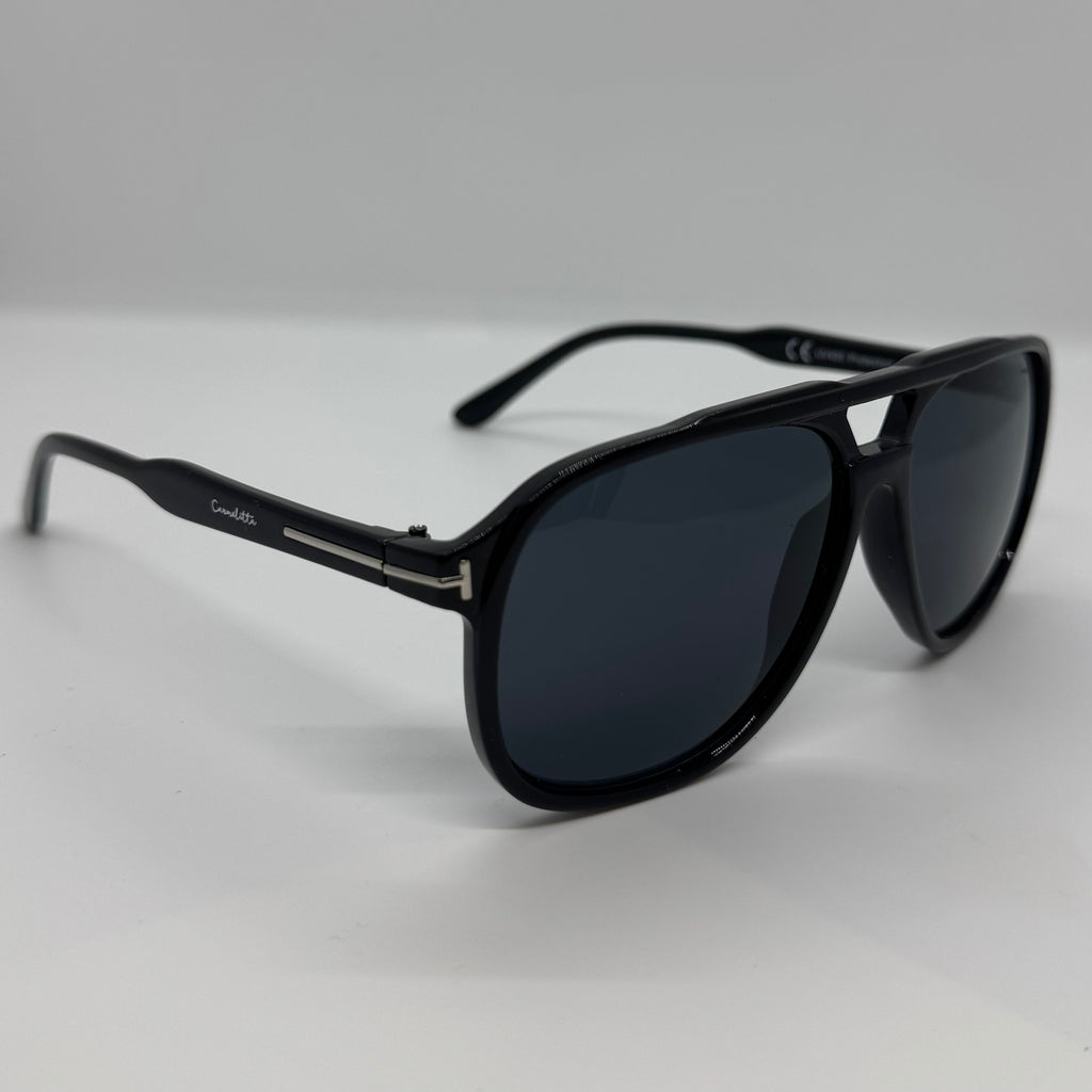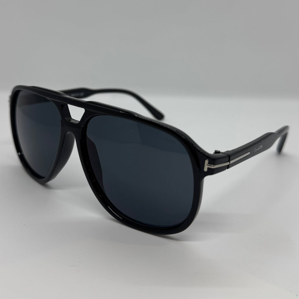 Óculos com hastes em acetato preto com detalhes prata e lente preta.