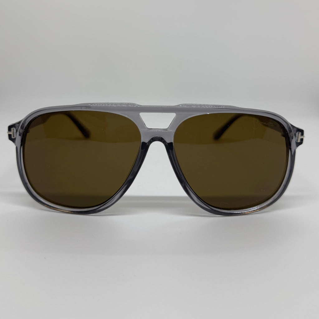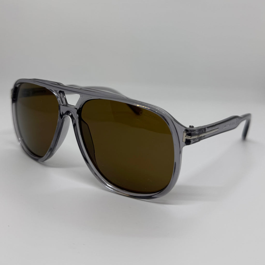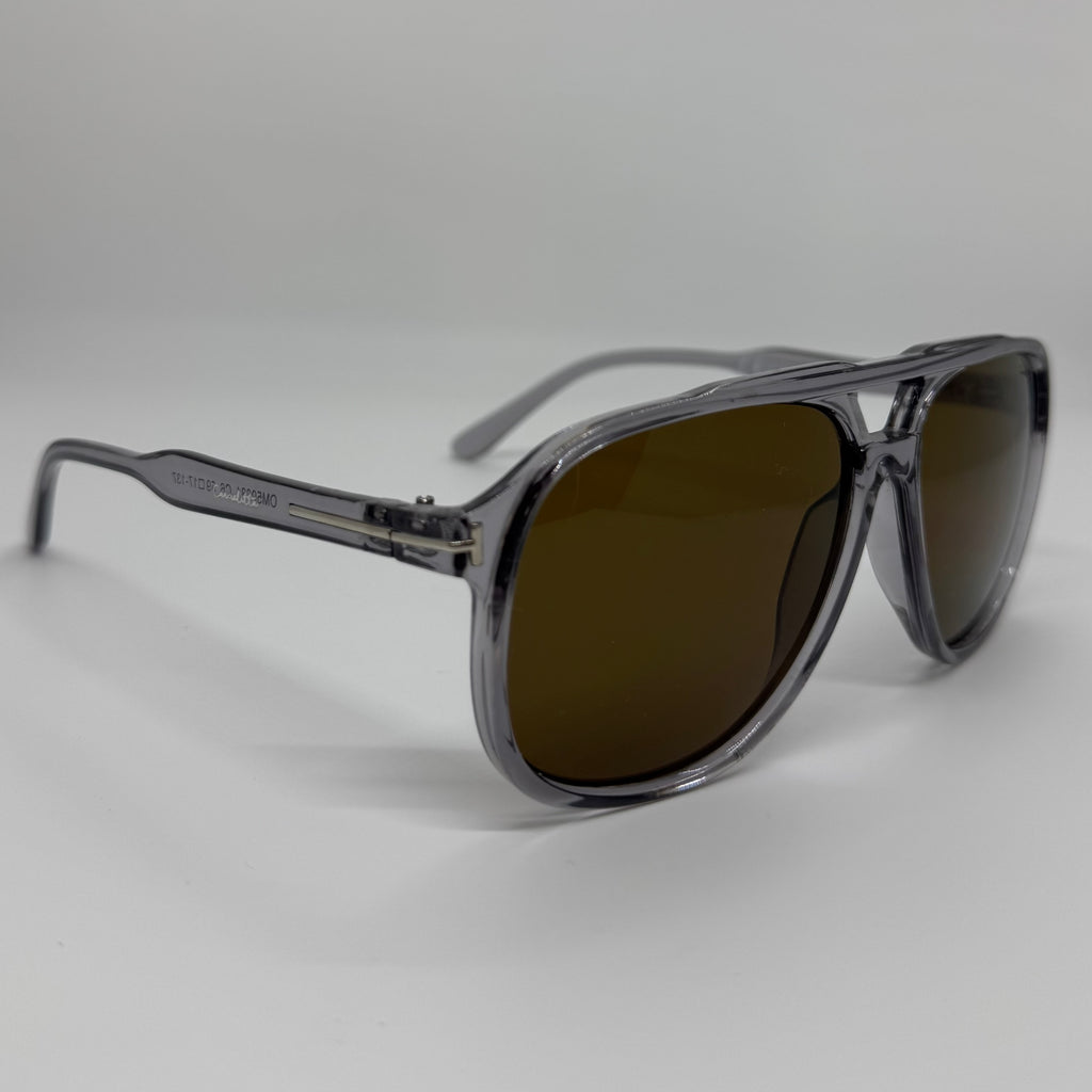 Óculos com hastes em acetato cinza translúcido e lente marrom.
