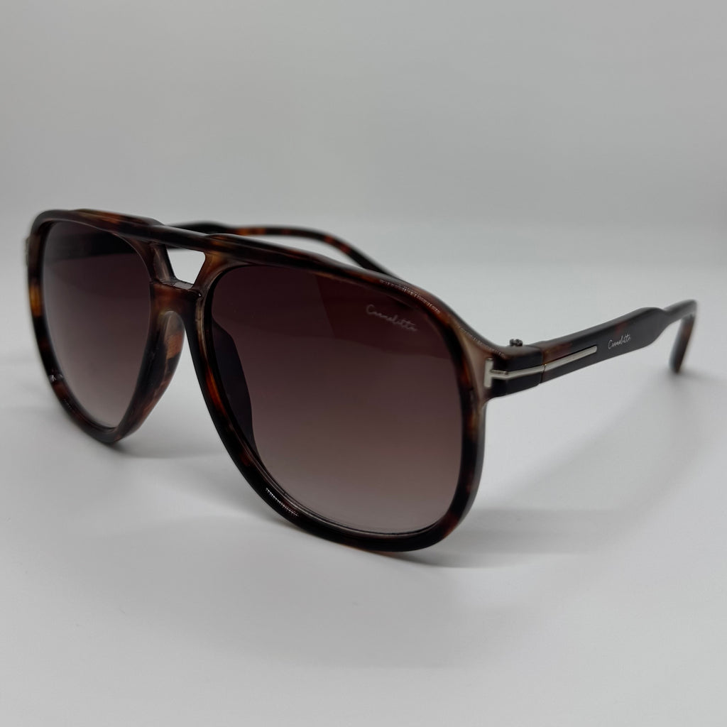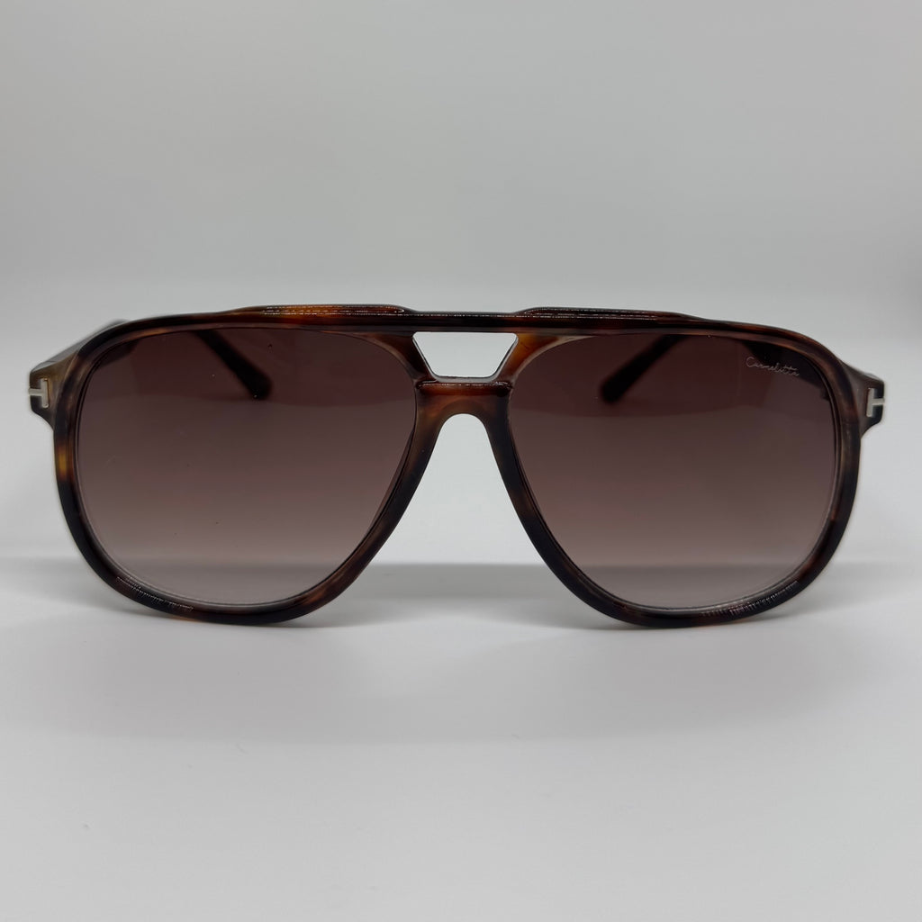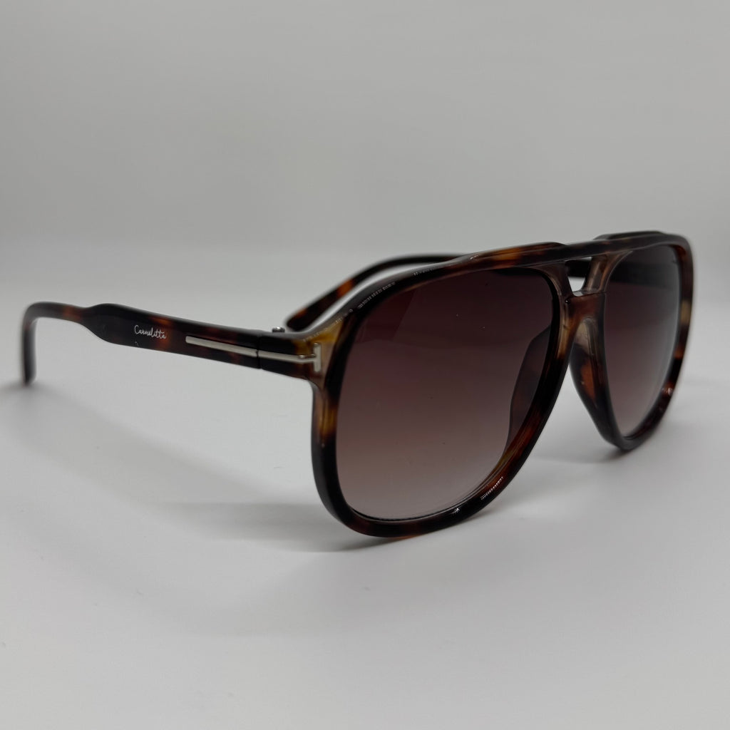 Óculos com hastes em acetato tartaruga com lente roxa degrade.