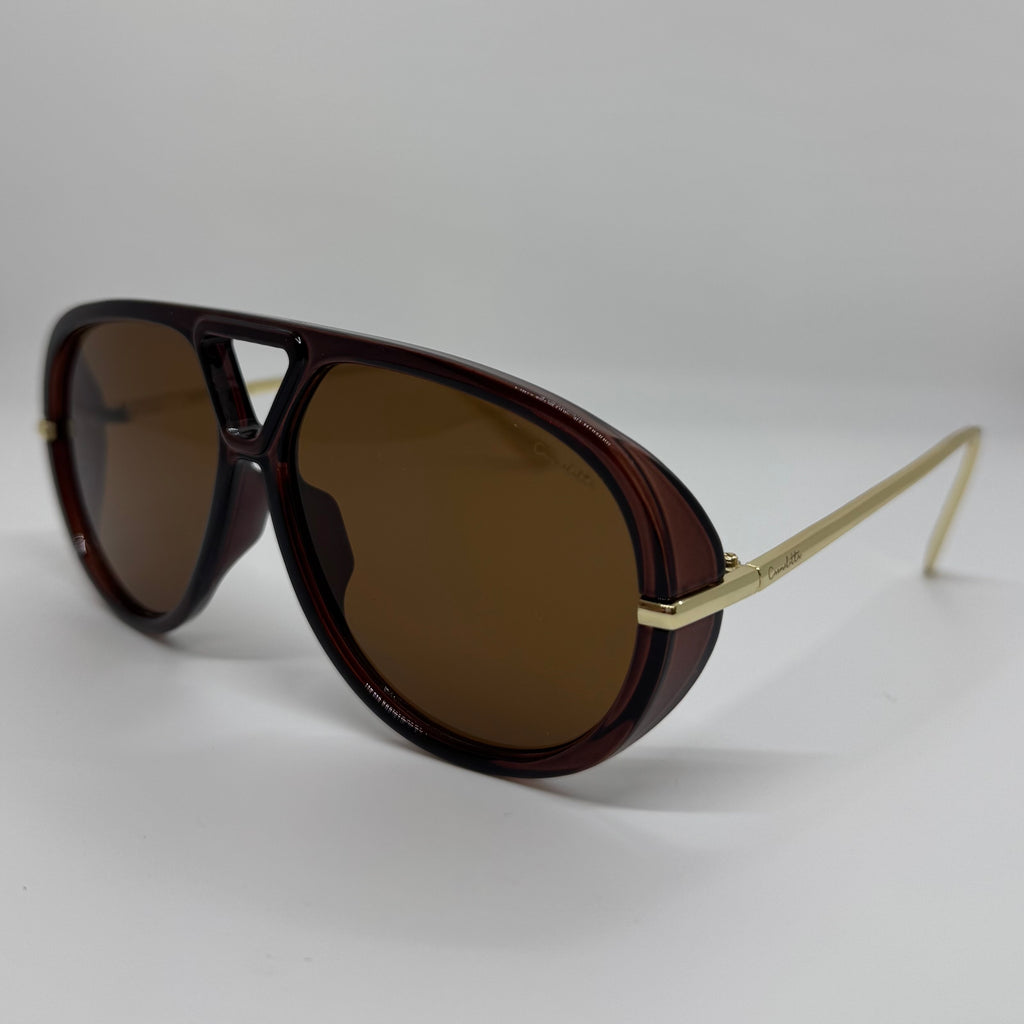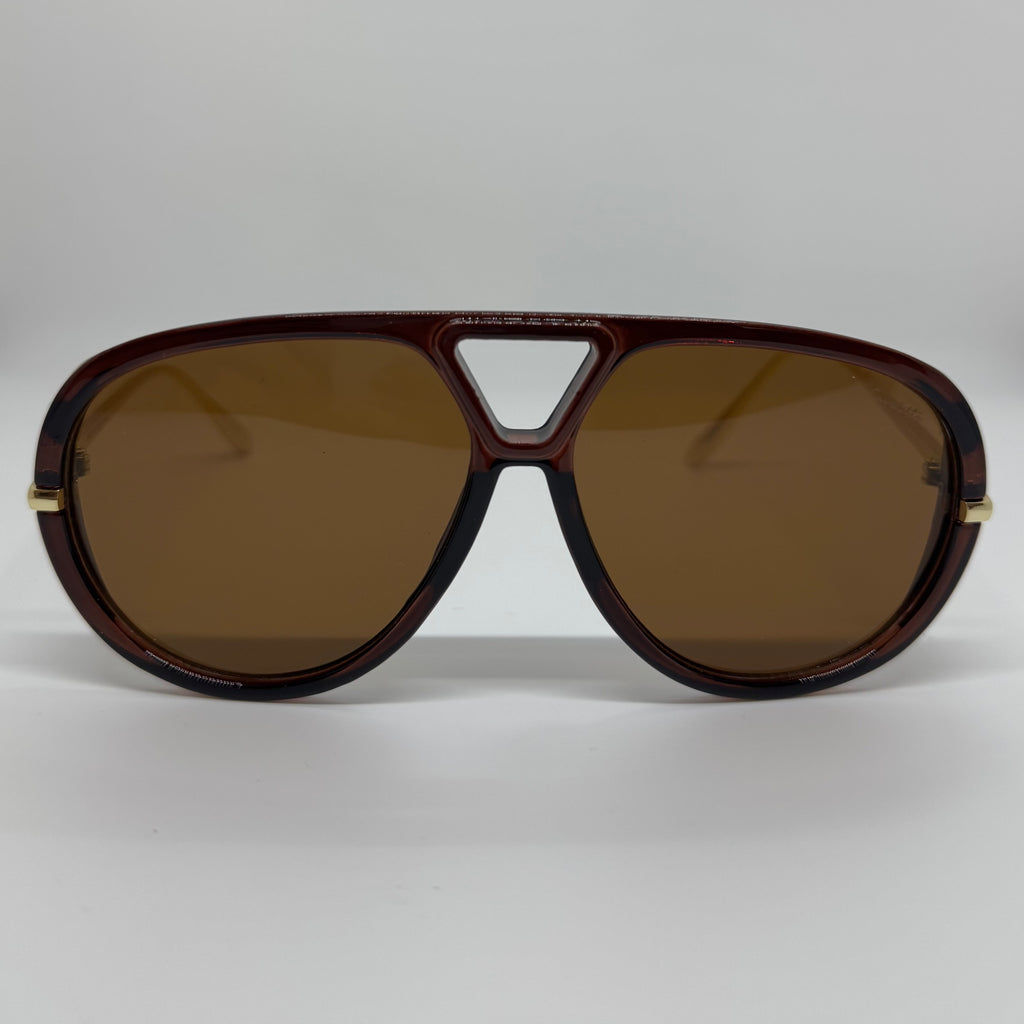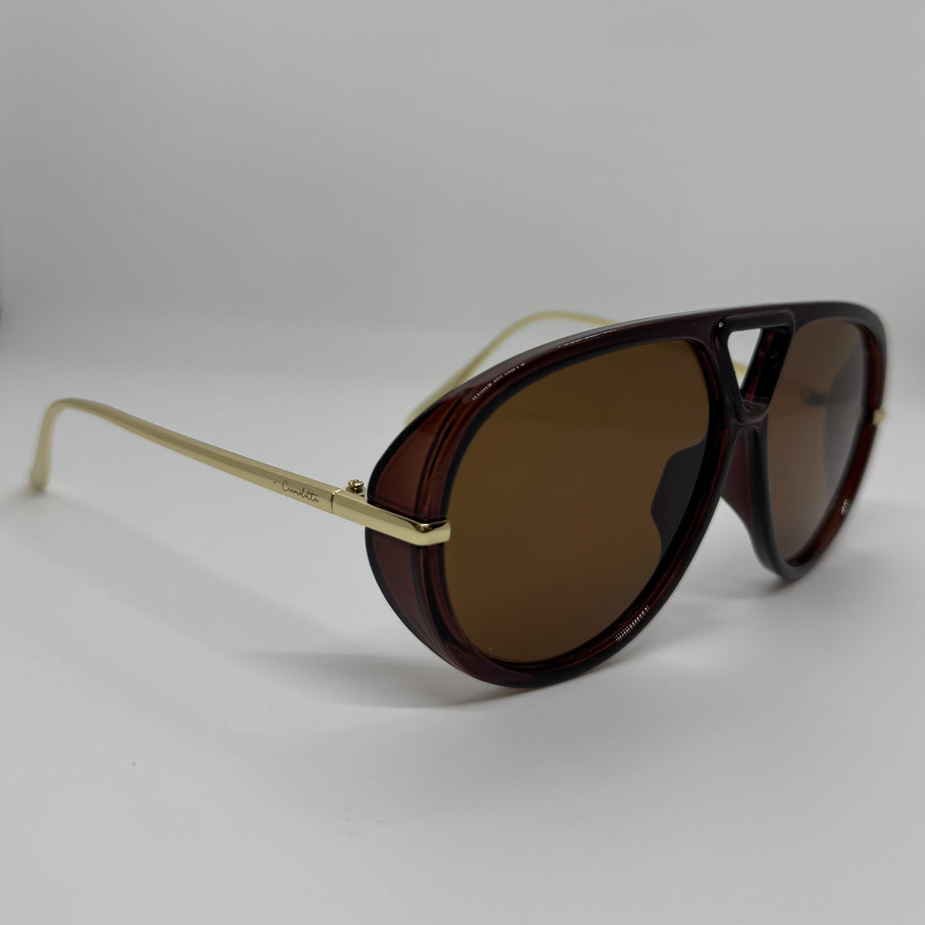 Óculos com hastes em metal dourado com frente em acetato marrom e lente marrom.