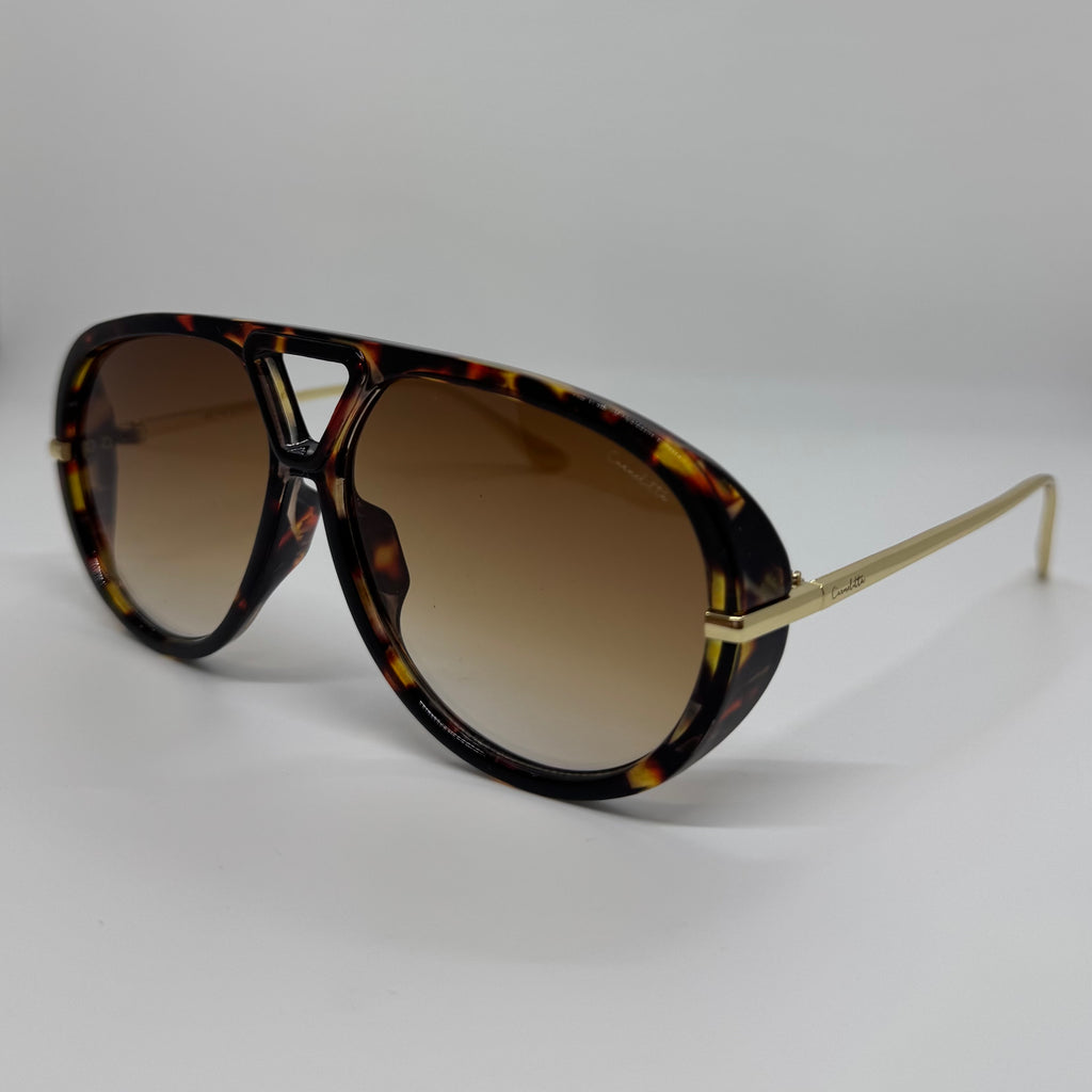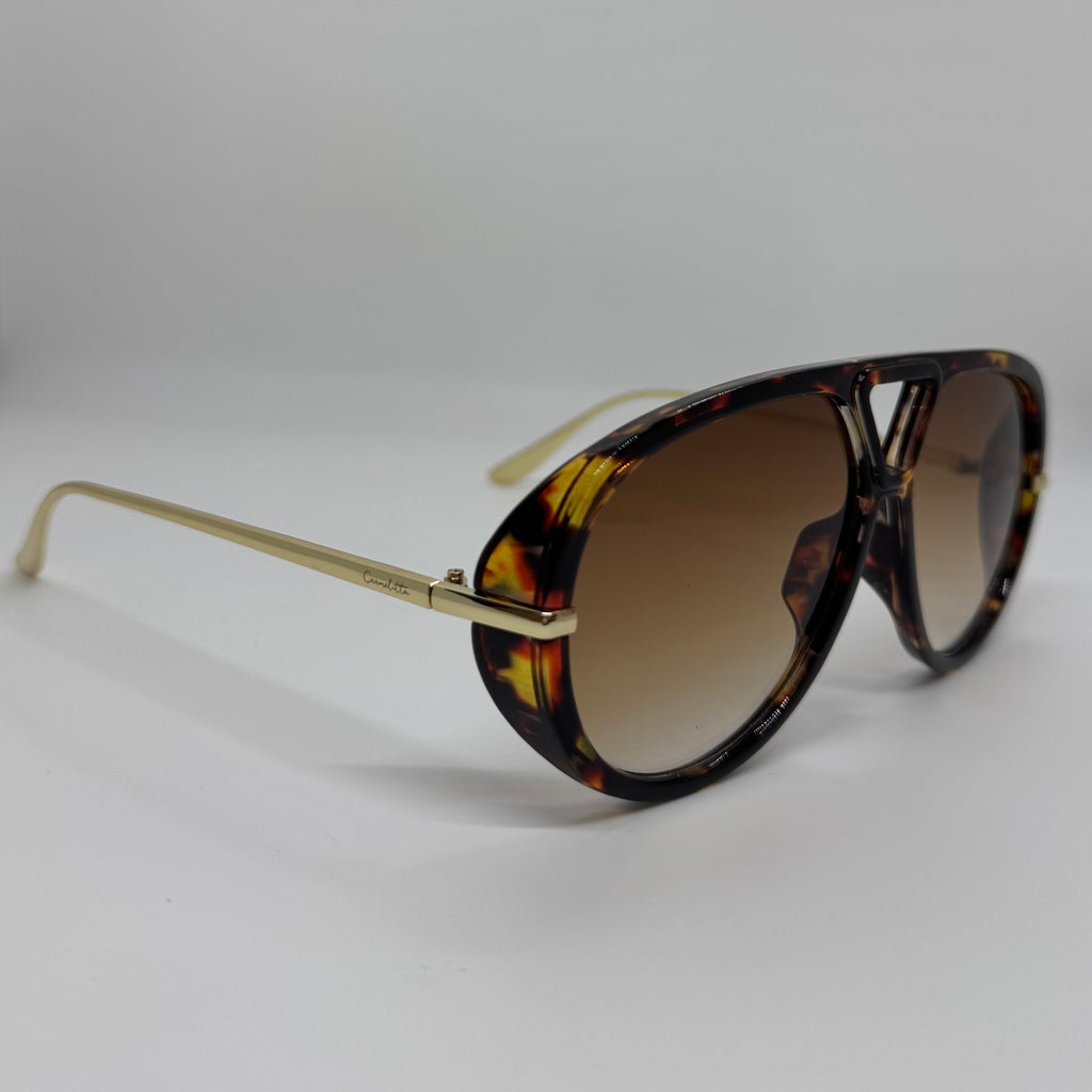 Óculos com hastes em metal dourado com frente em acetato tartaruga e lente marrom degrade.