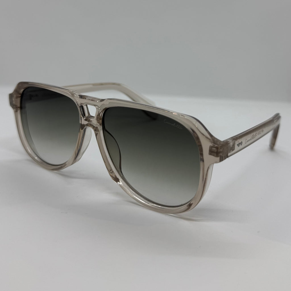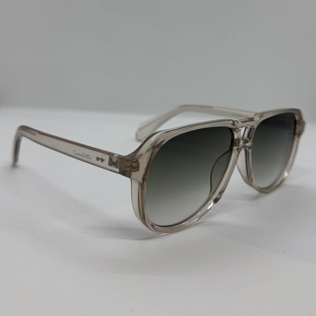 Óculos com hastes em acetato cinza translúcido com lente verde degrade.