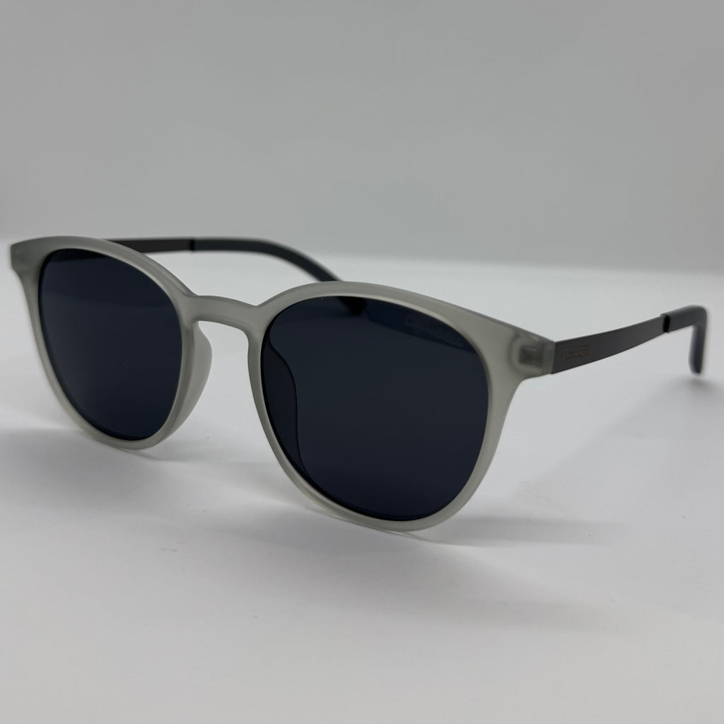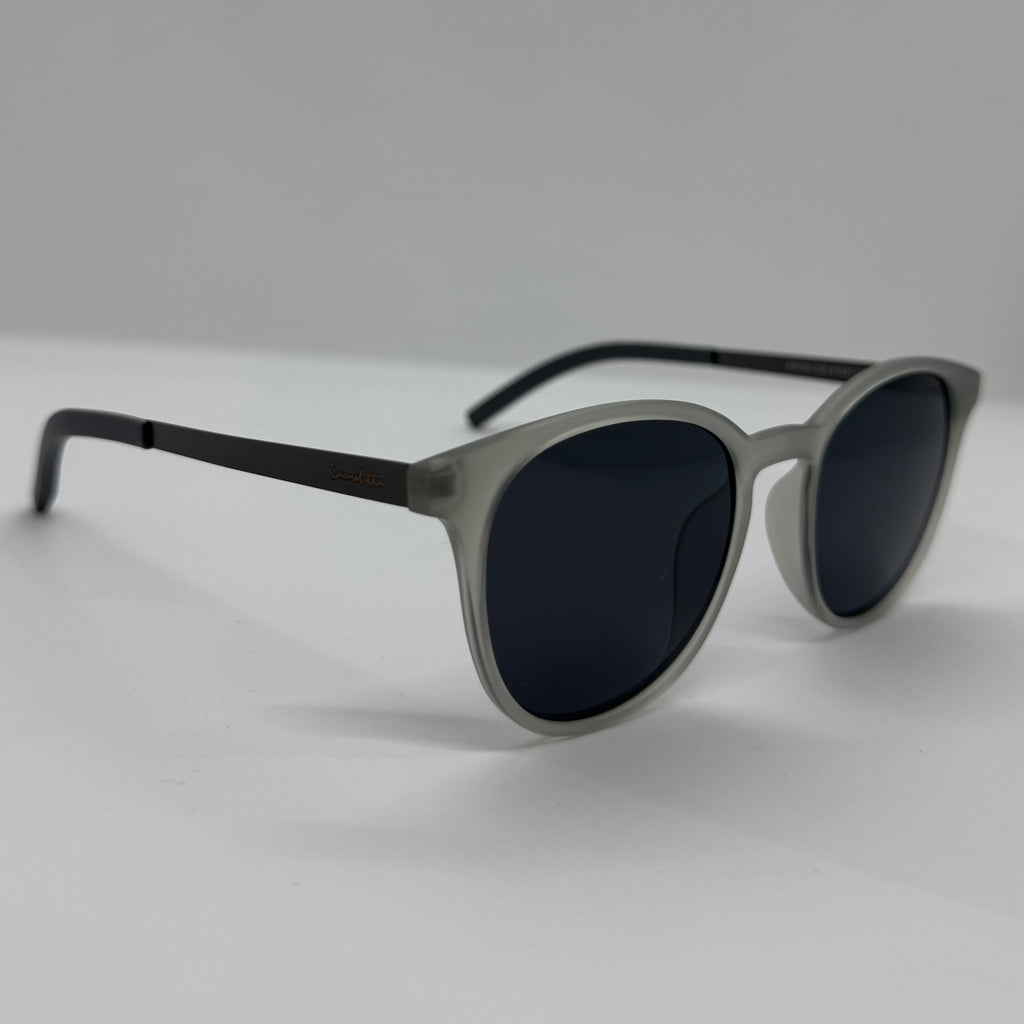 Óculos com hastes em metal grafite com frente em acetato cinza fosco e lente preta.