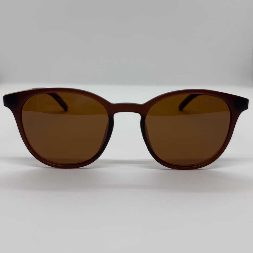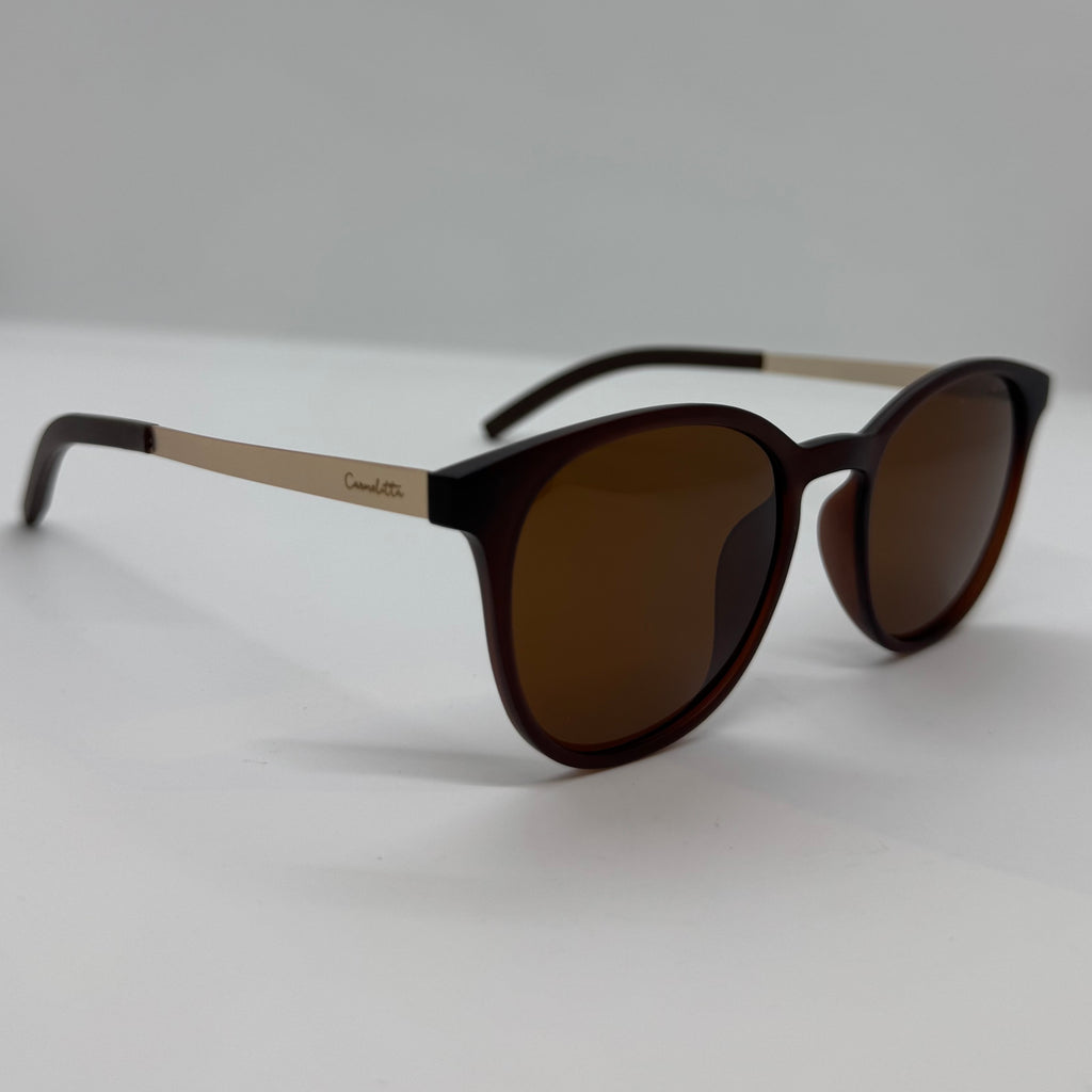 Óculos com hastes em metal dourado com frente em acetato marrom e lente marrom.