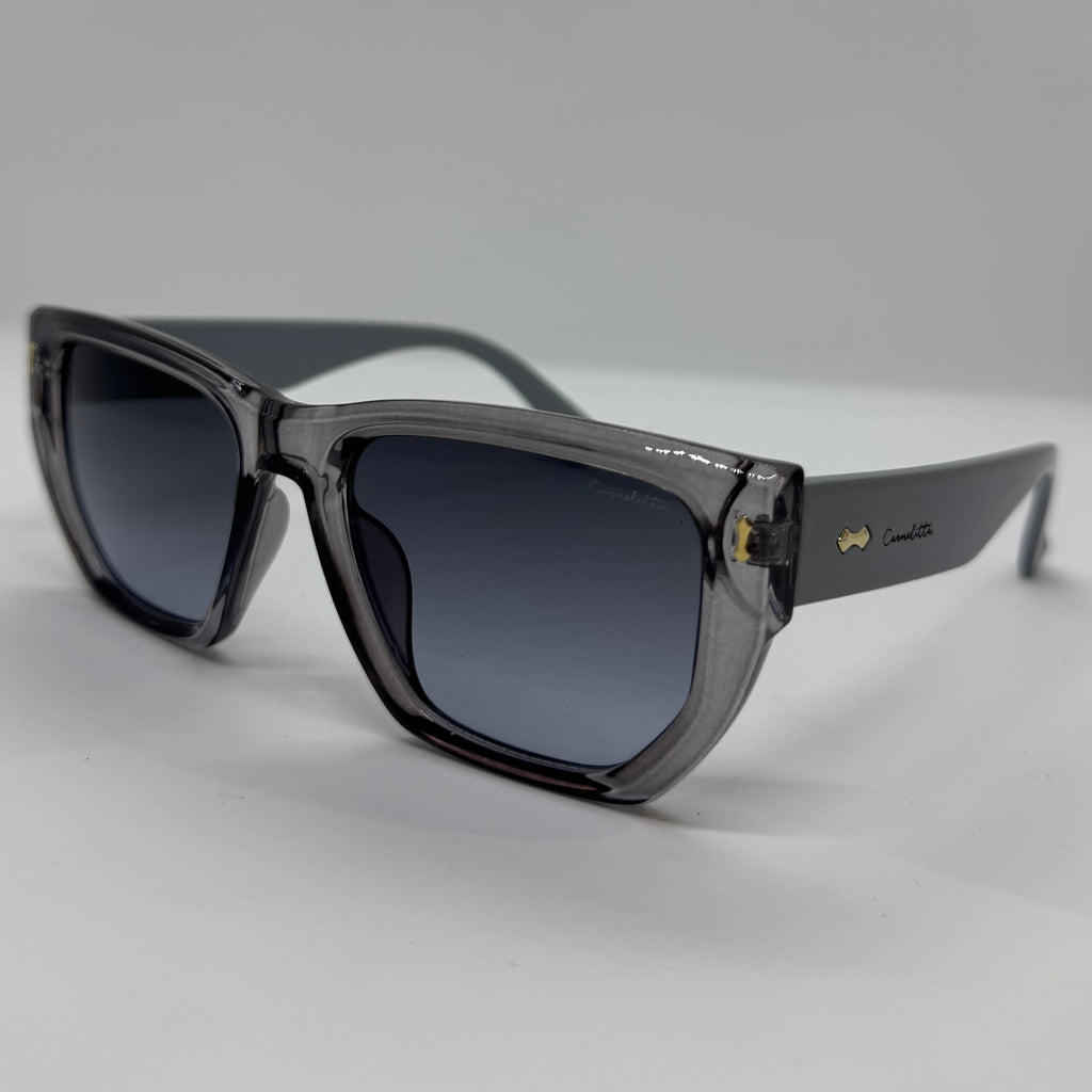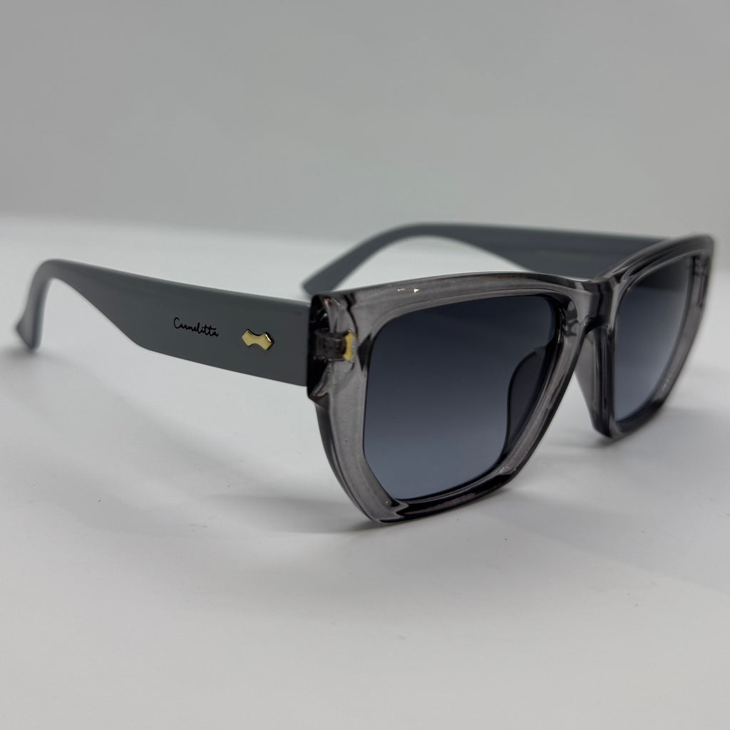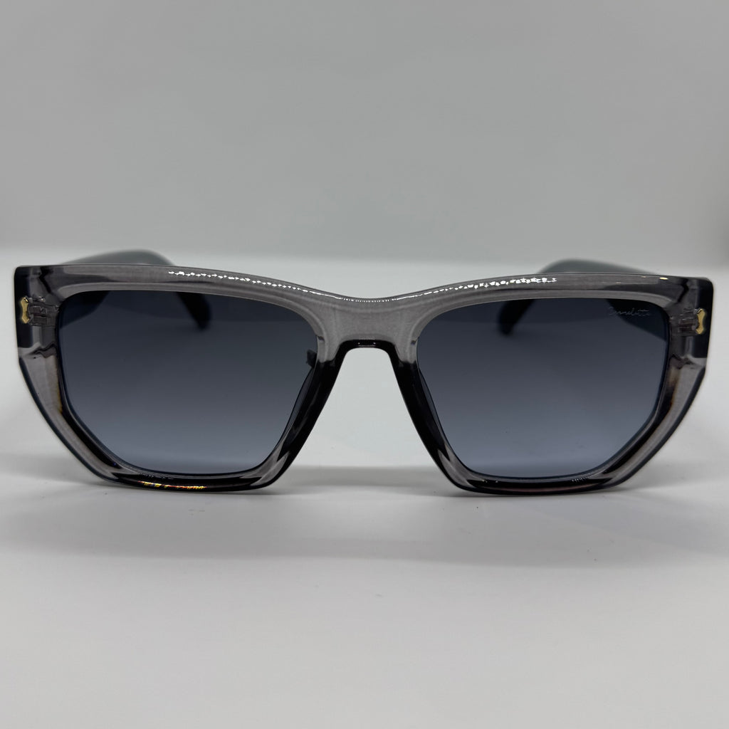 Óculos com hastes cinza translúcido com lente fume degrade.