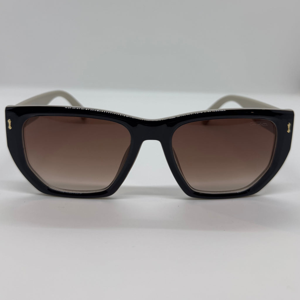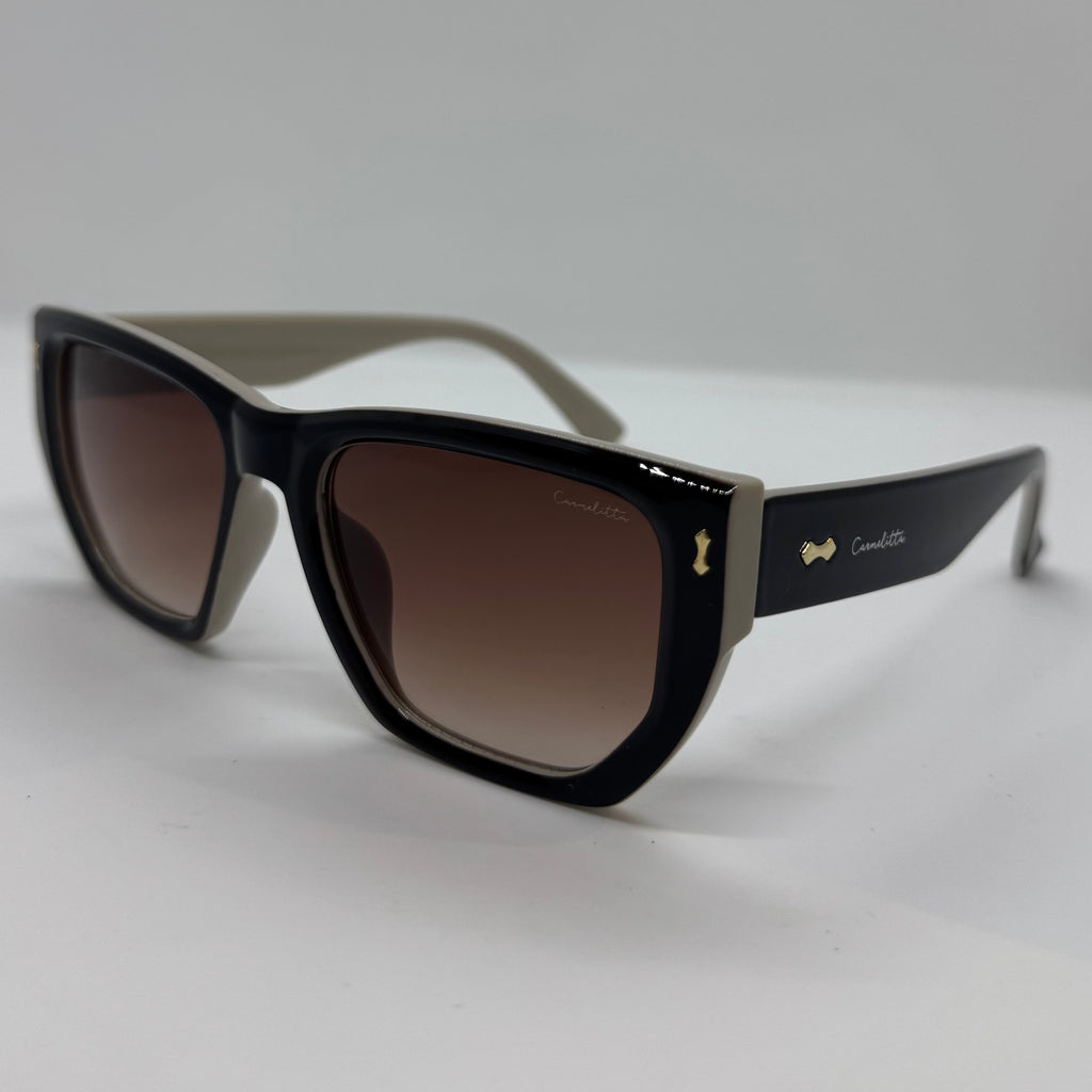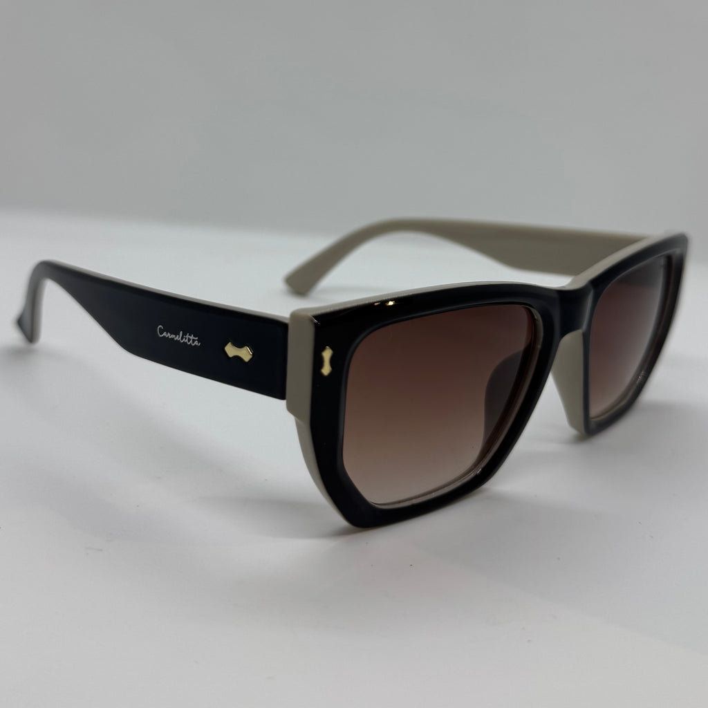 Óculos com hastes em acetato marrom com interior off white e lente marrom degrade.