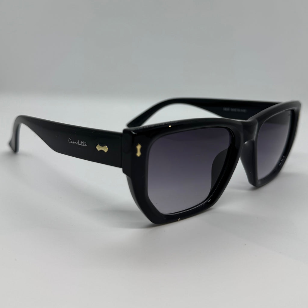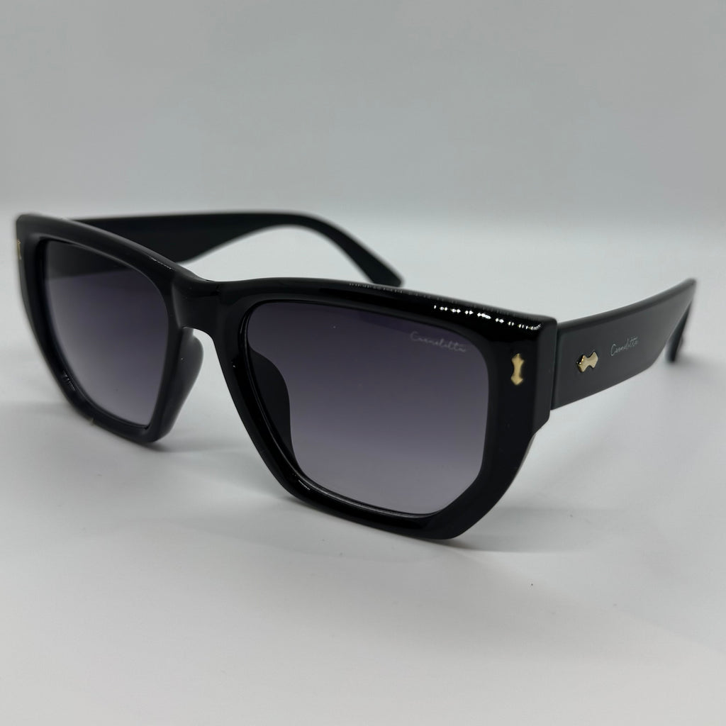 Óculos com hastes em acetato preto com lente roxa degrade.