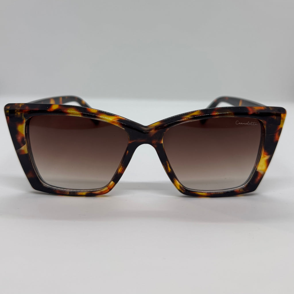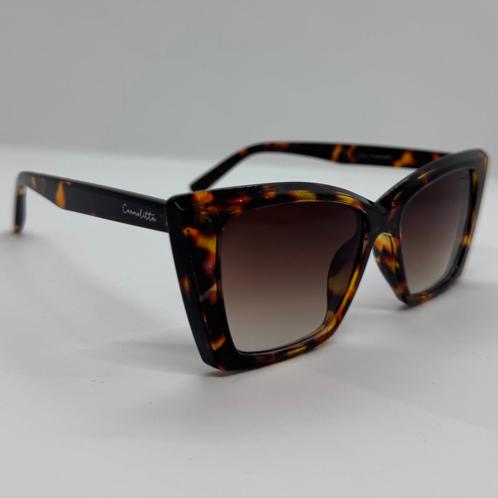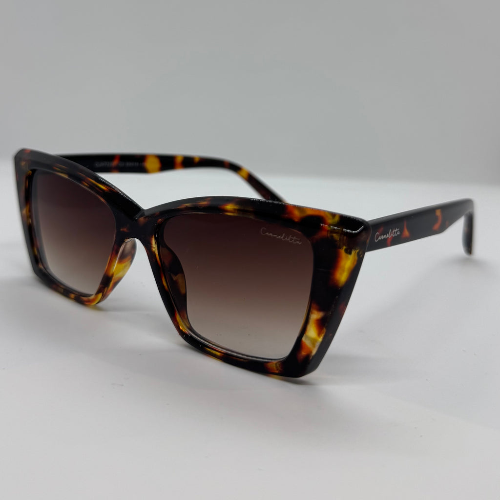 Óculos com hastes em acetato tartaruga com lente marrom degrade.