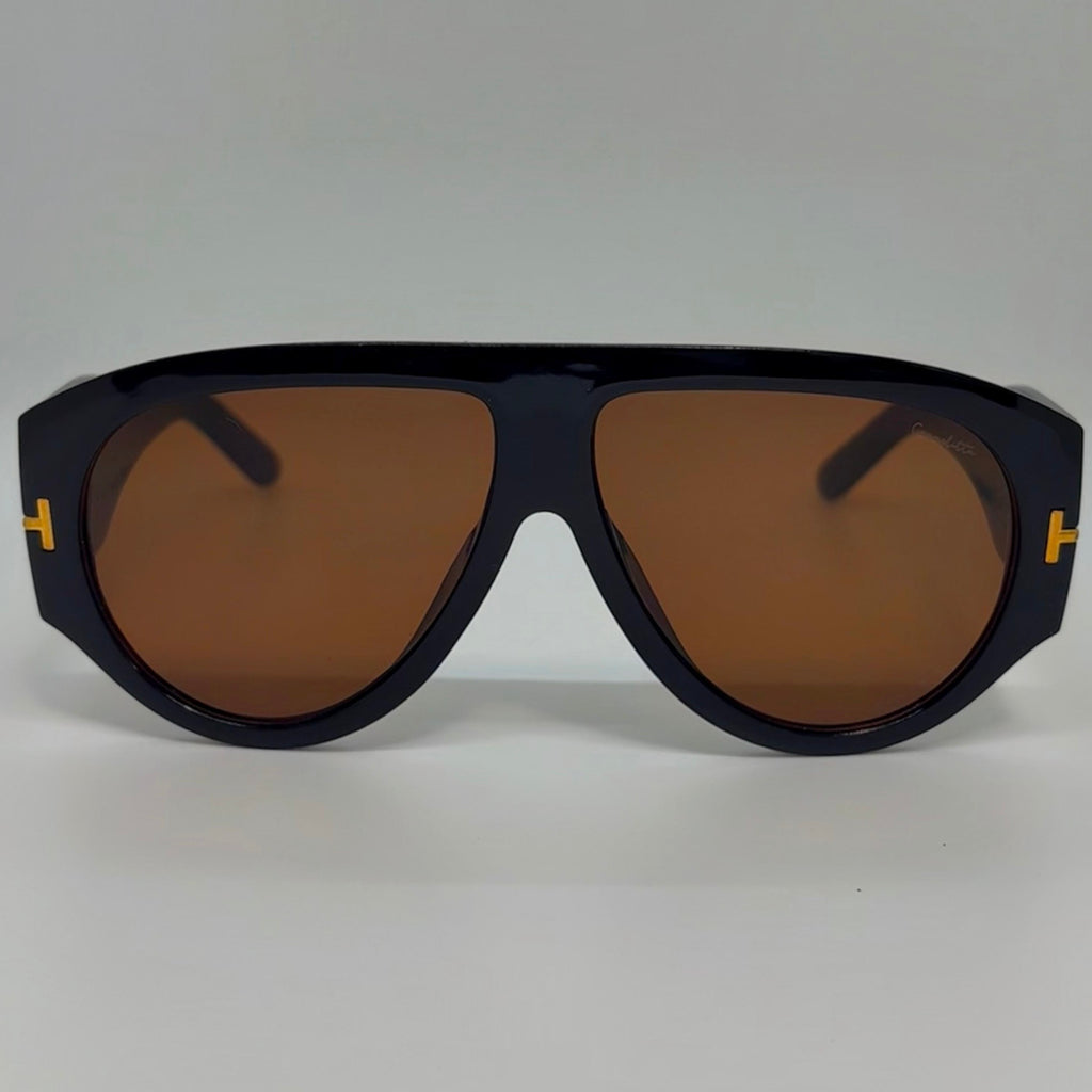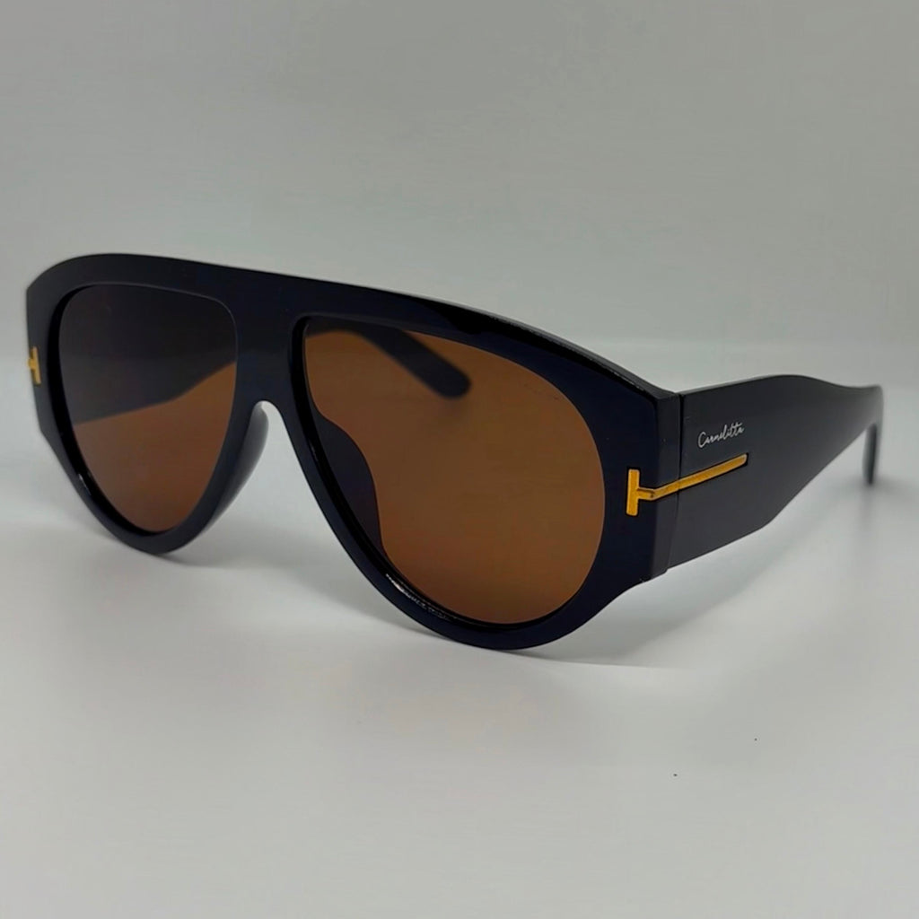Óculos com hastes em acetato marrom com lente marrom.