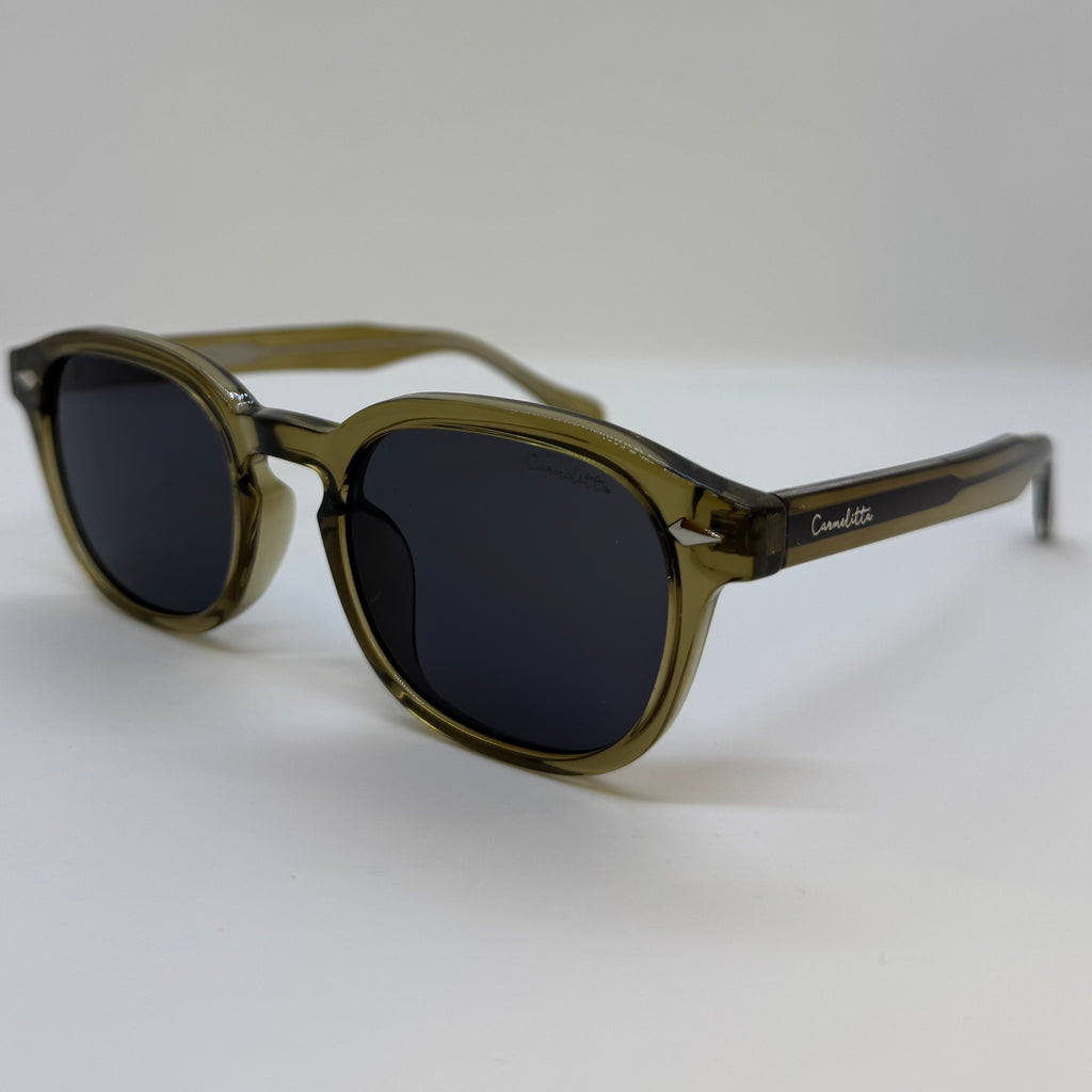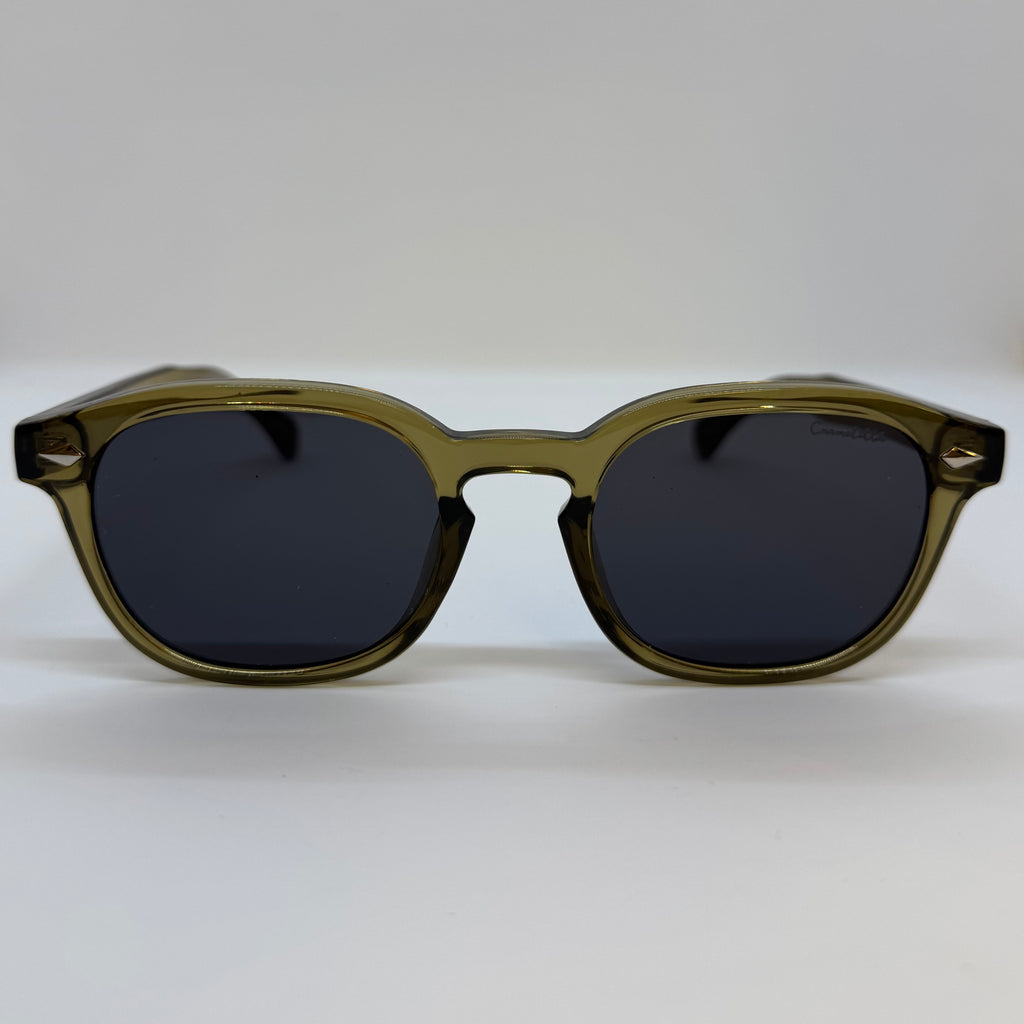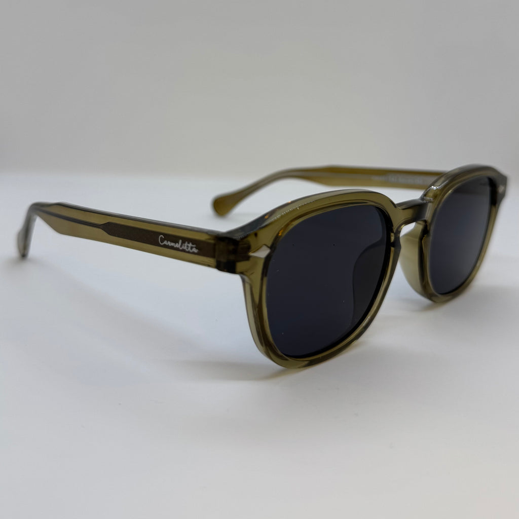 Óculos com hastes e frente em acetato âmbar e lente fosca.