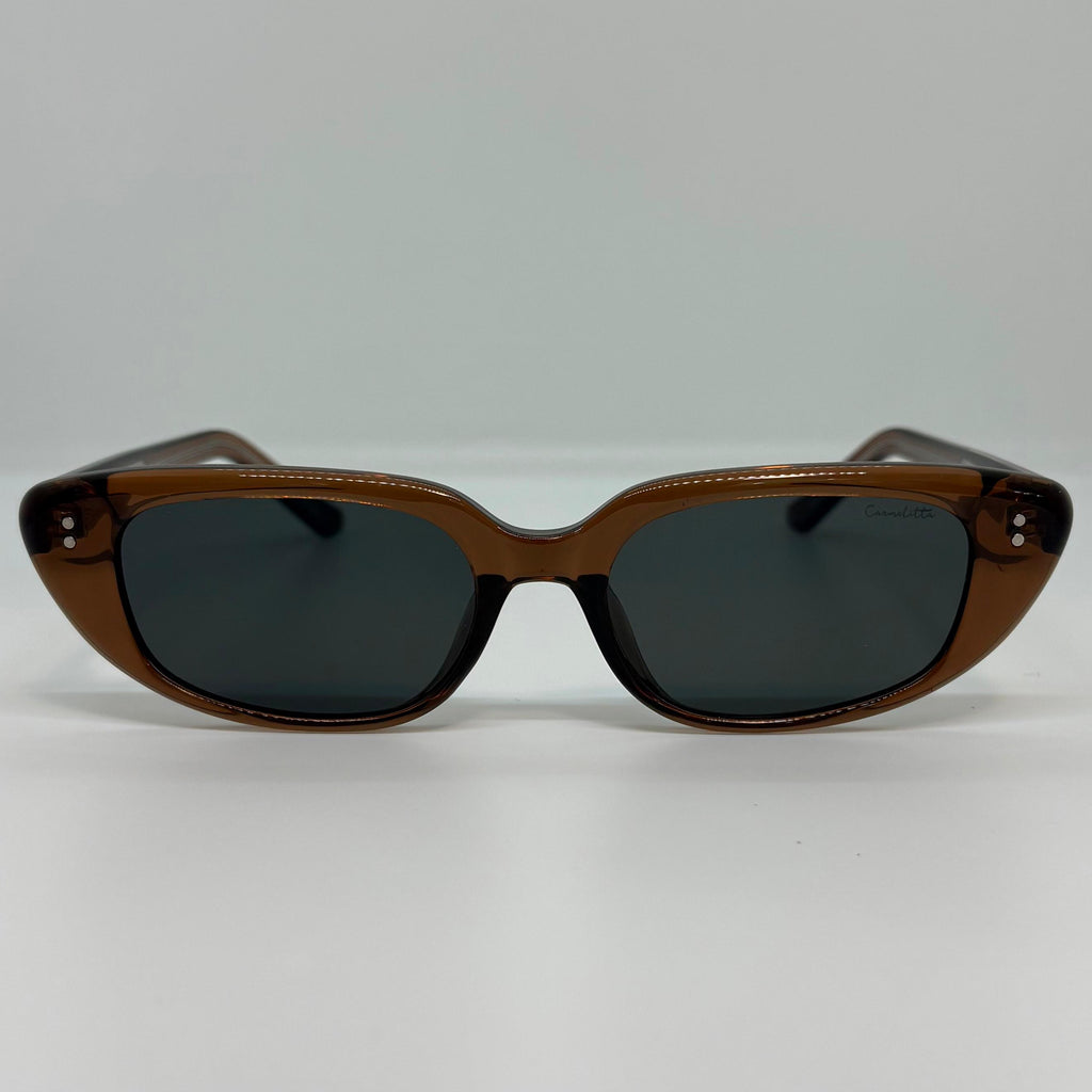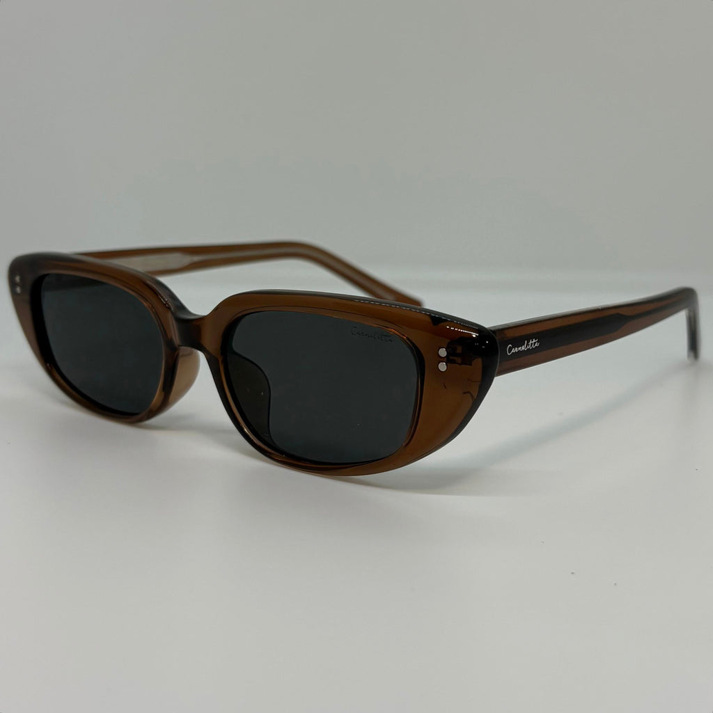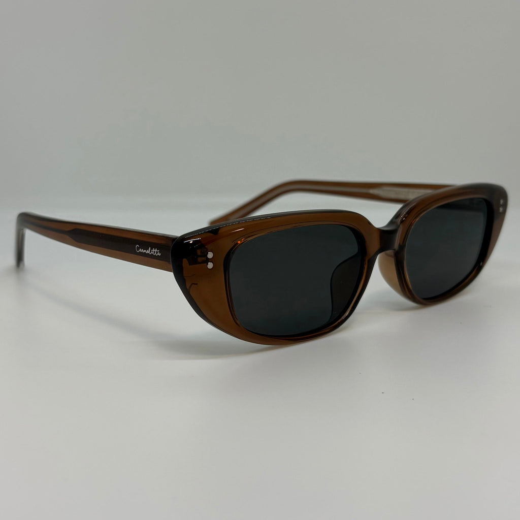Óculos com hastes em acetato marrom translúcido com lente preta.