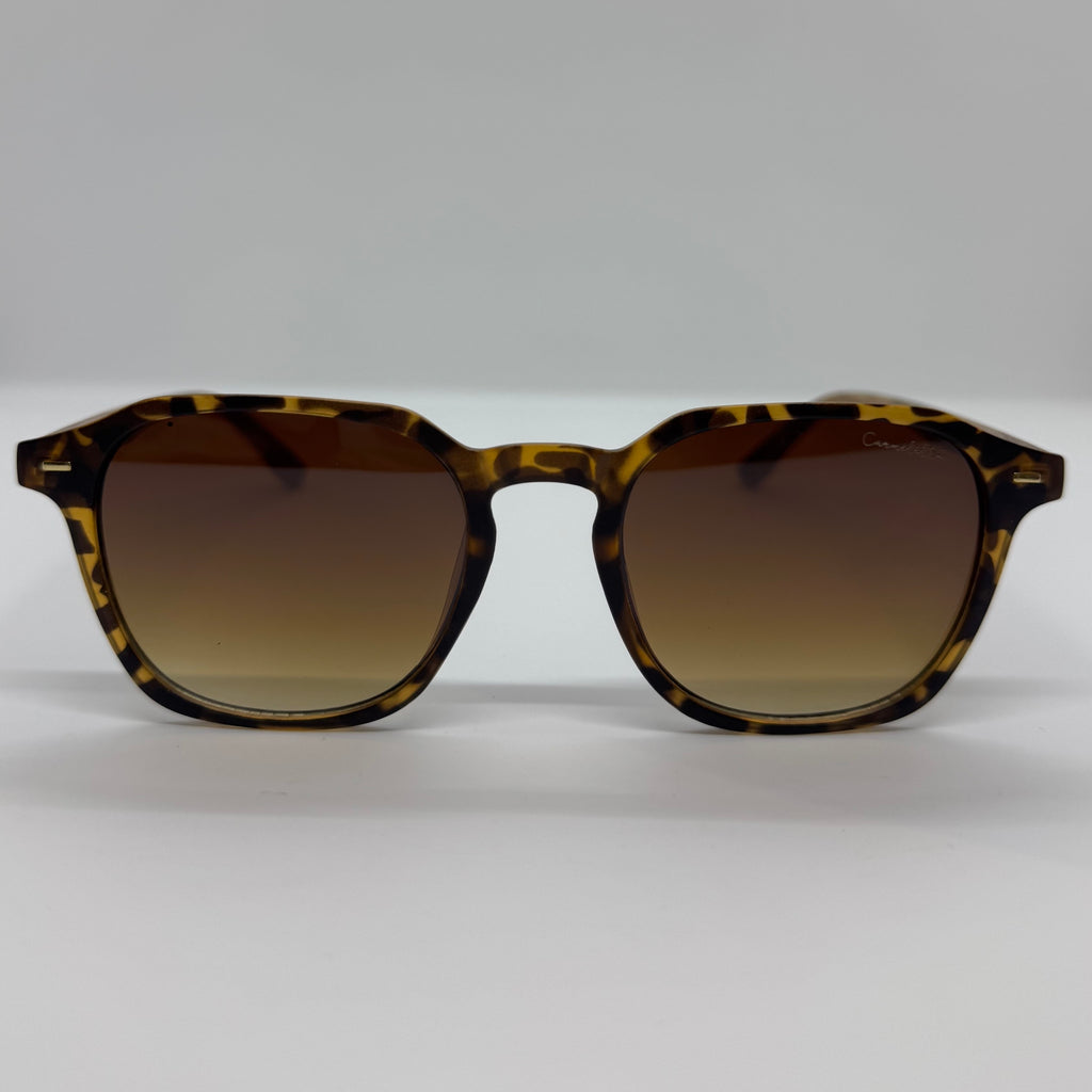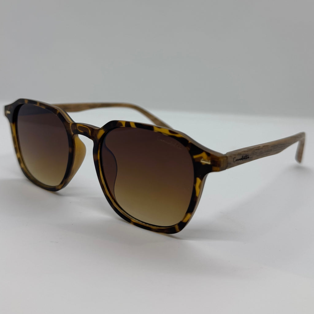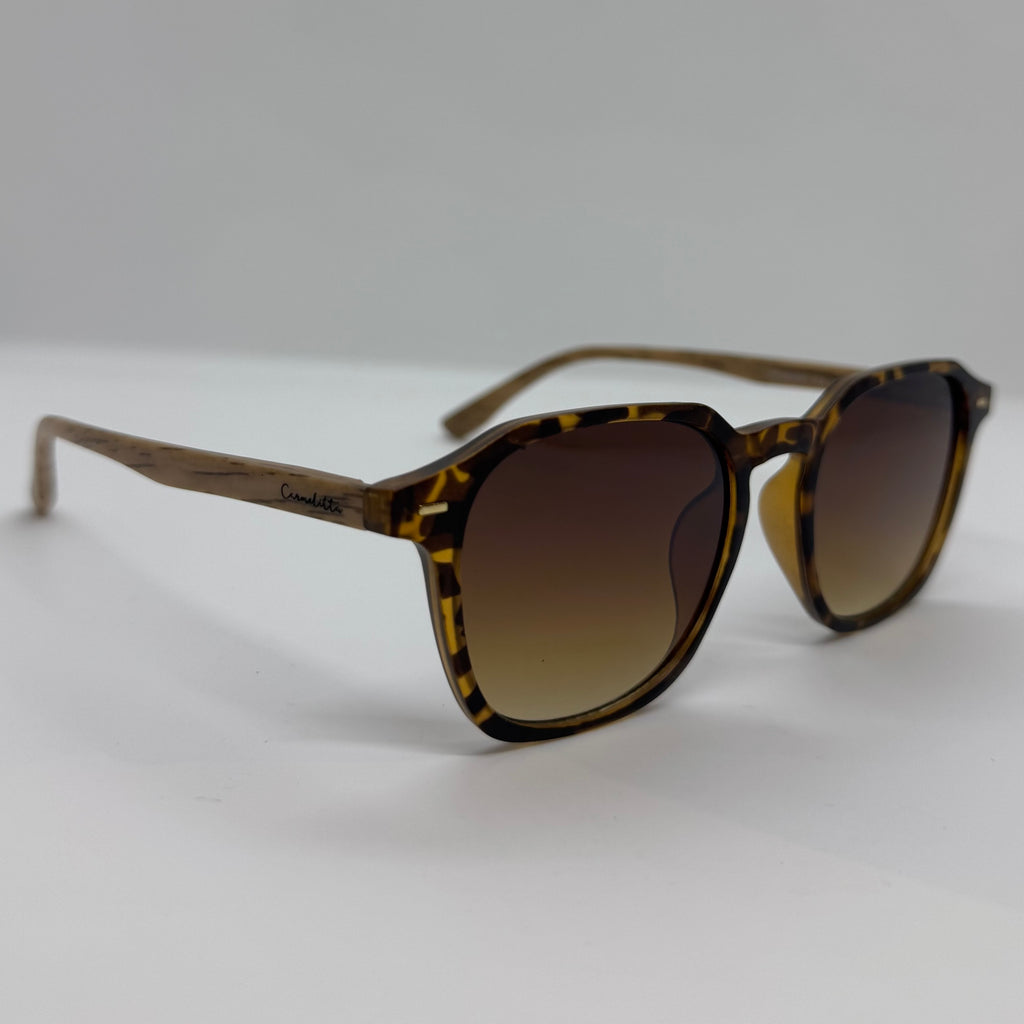 Óculos com hastes de bambu com frente em acetato tartaruga e lente marrom degrade.