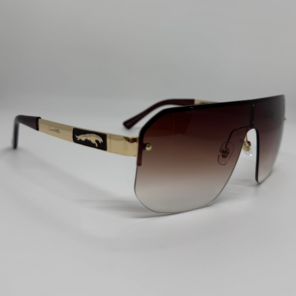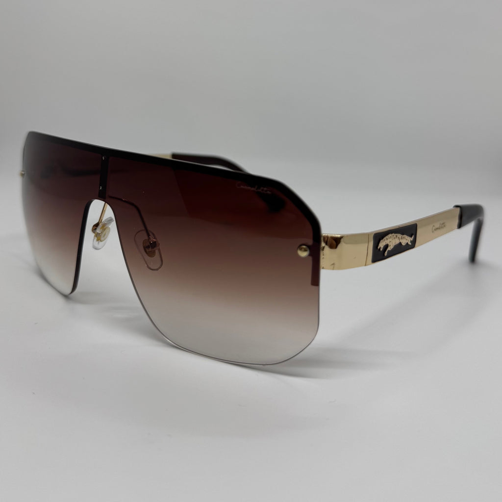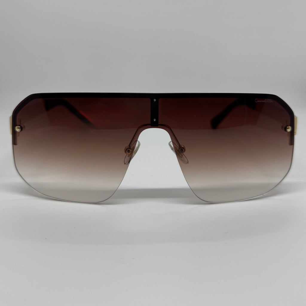 Óculos com hastes em metal dourada com lente marrom degrade.