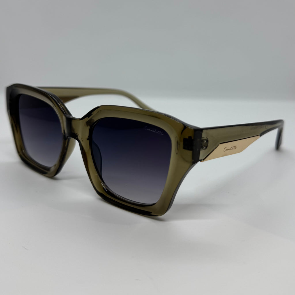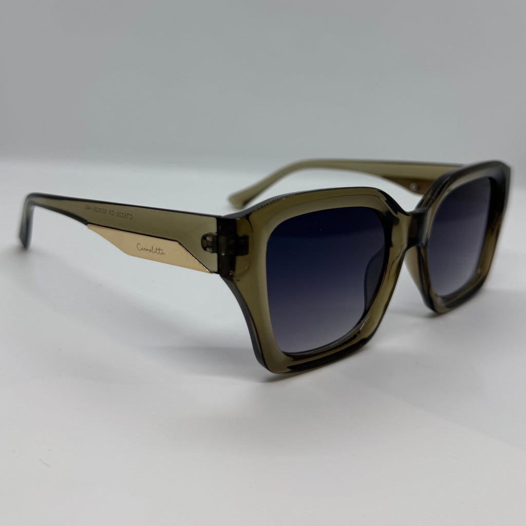 Óculos com hastes em acetato verde com detalhe dourado e lente roxa degrade.