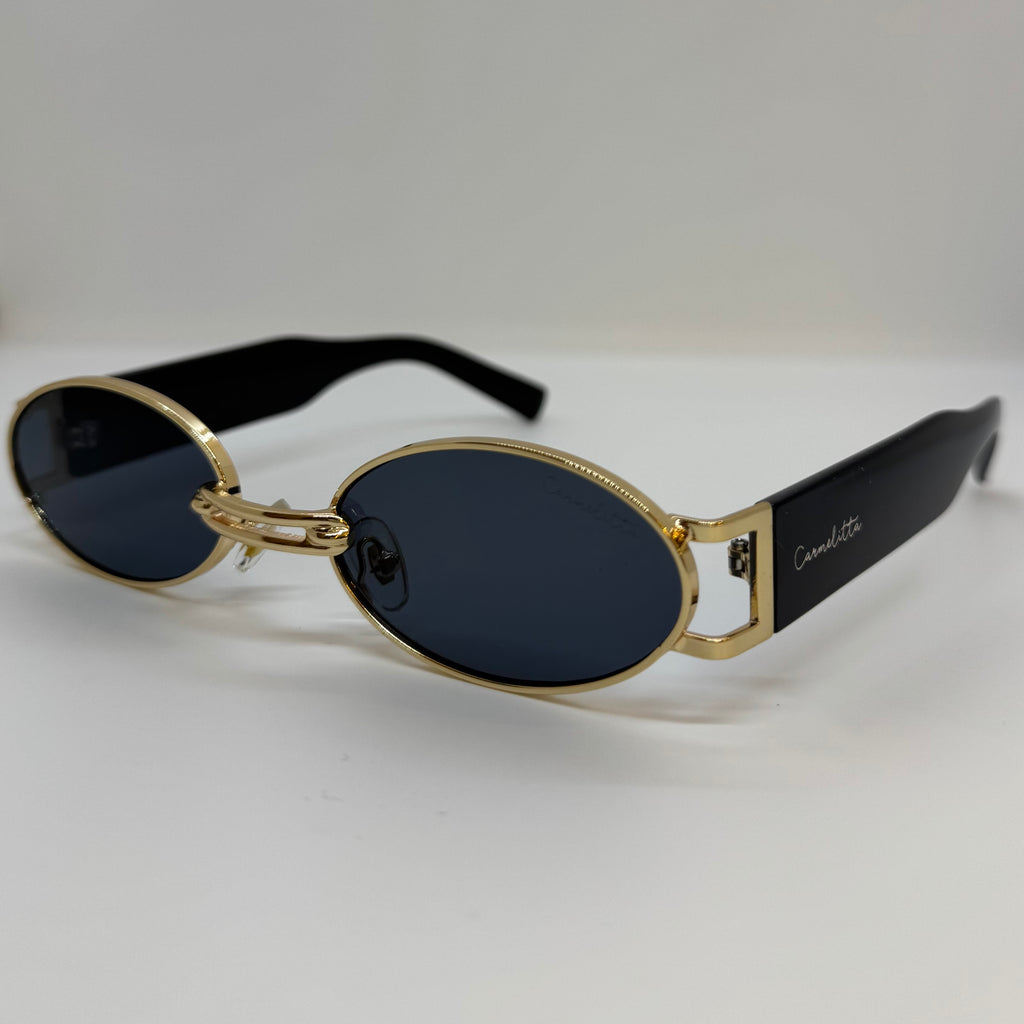 Óculos com hastes em acetato preto, frente em metal dourado e lente preta.