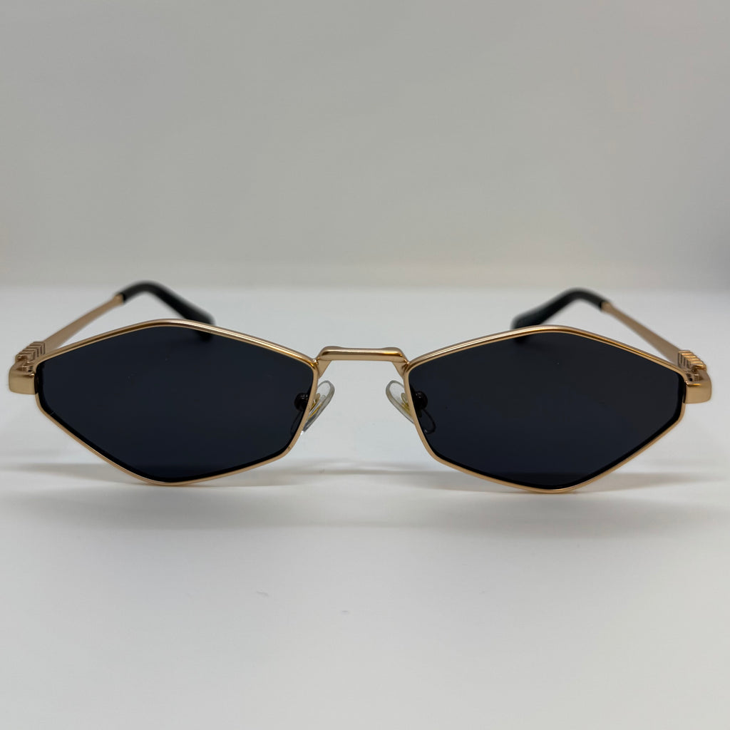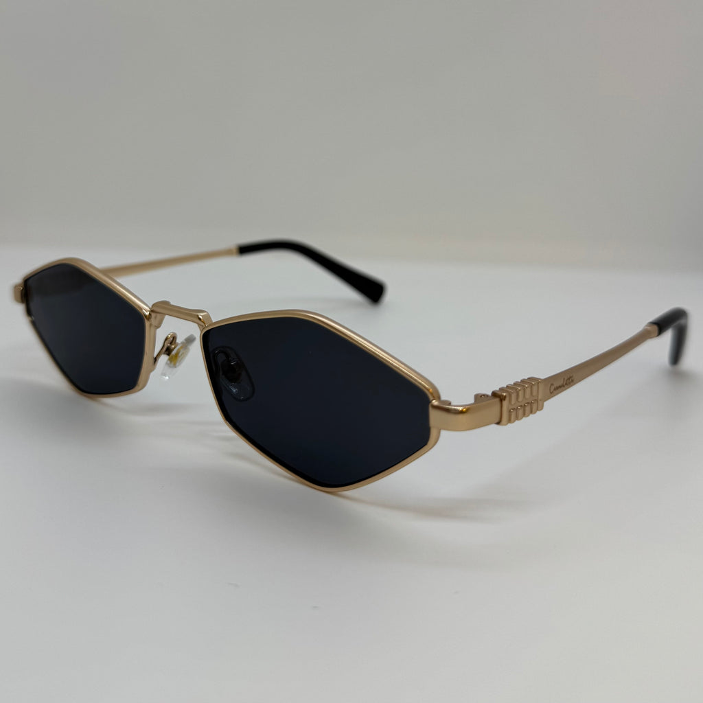 Óculos com hastes em metal dourado com lente preta.