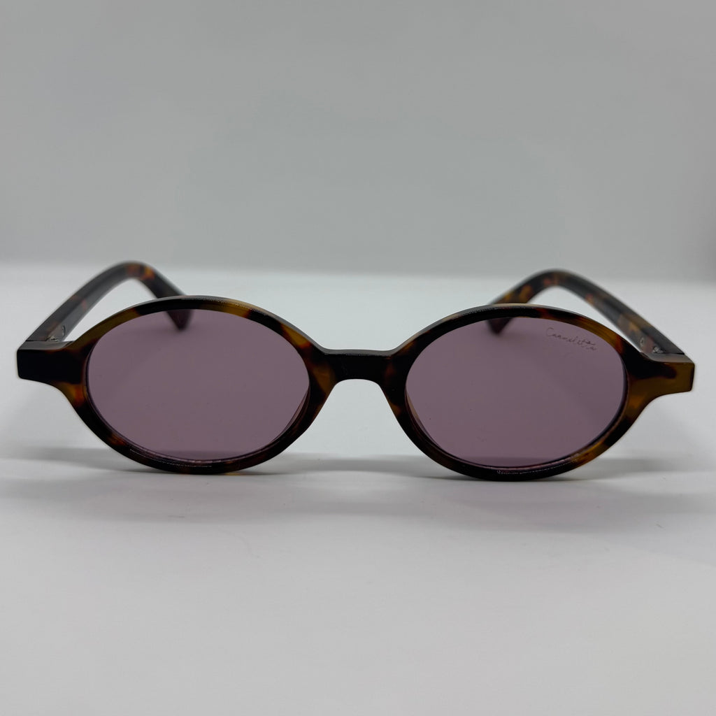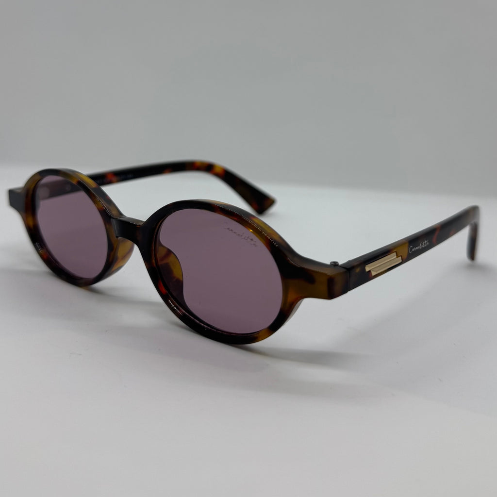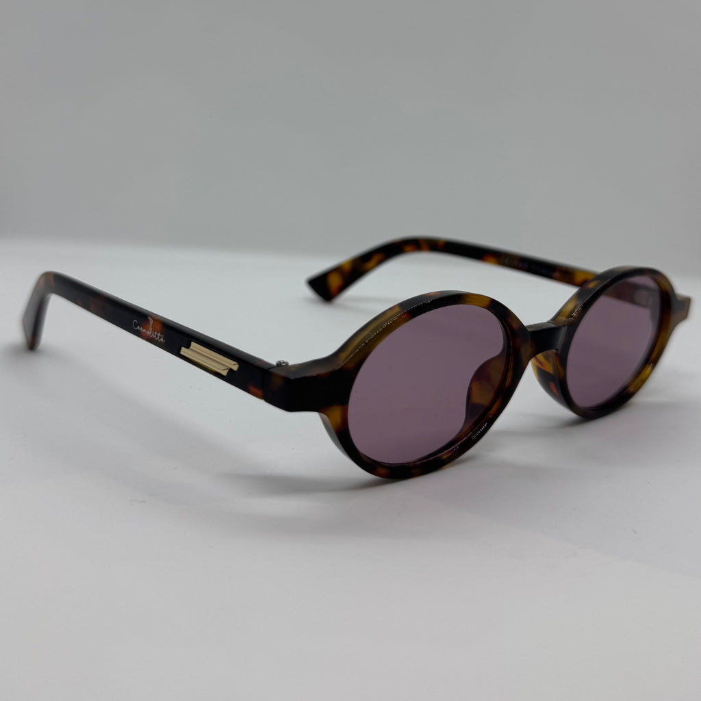 Óculos com hastes em acetato tartaruga com detalhes dourado e lente rose.