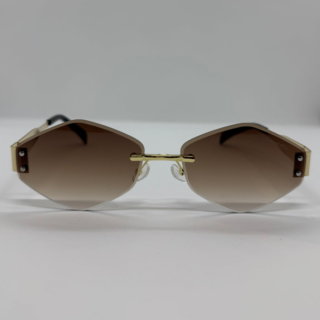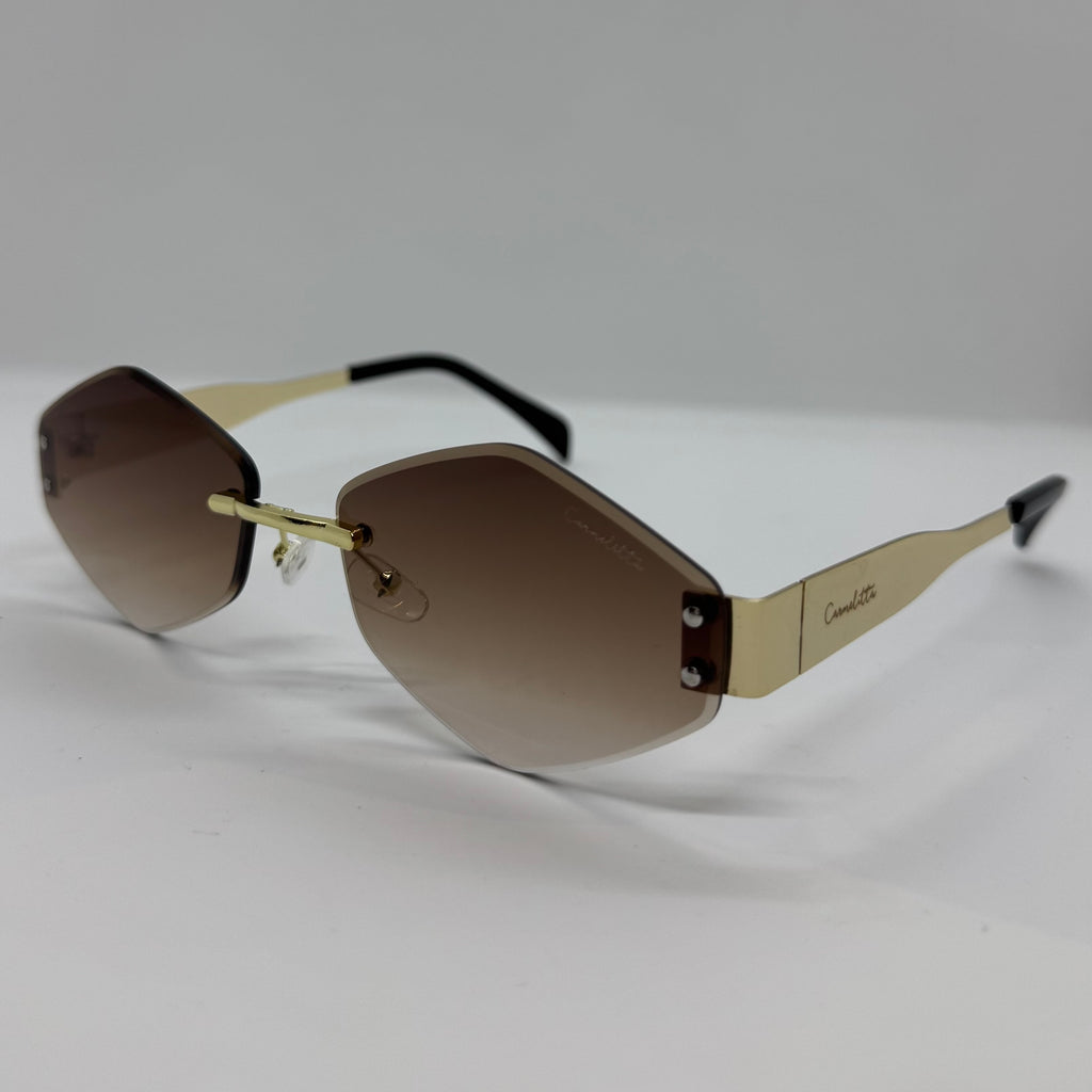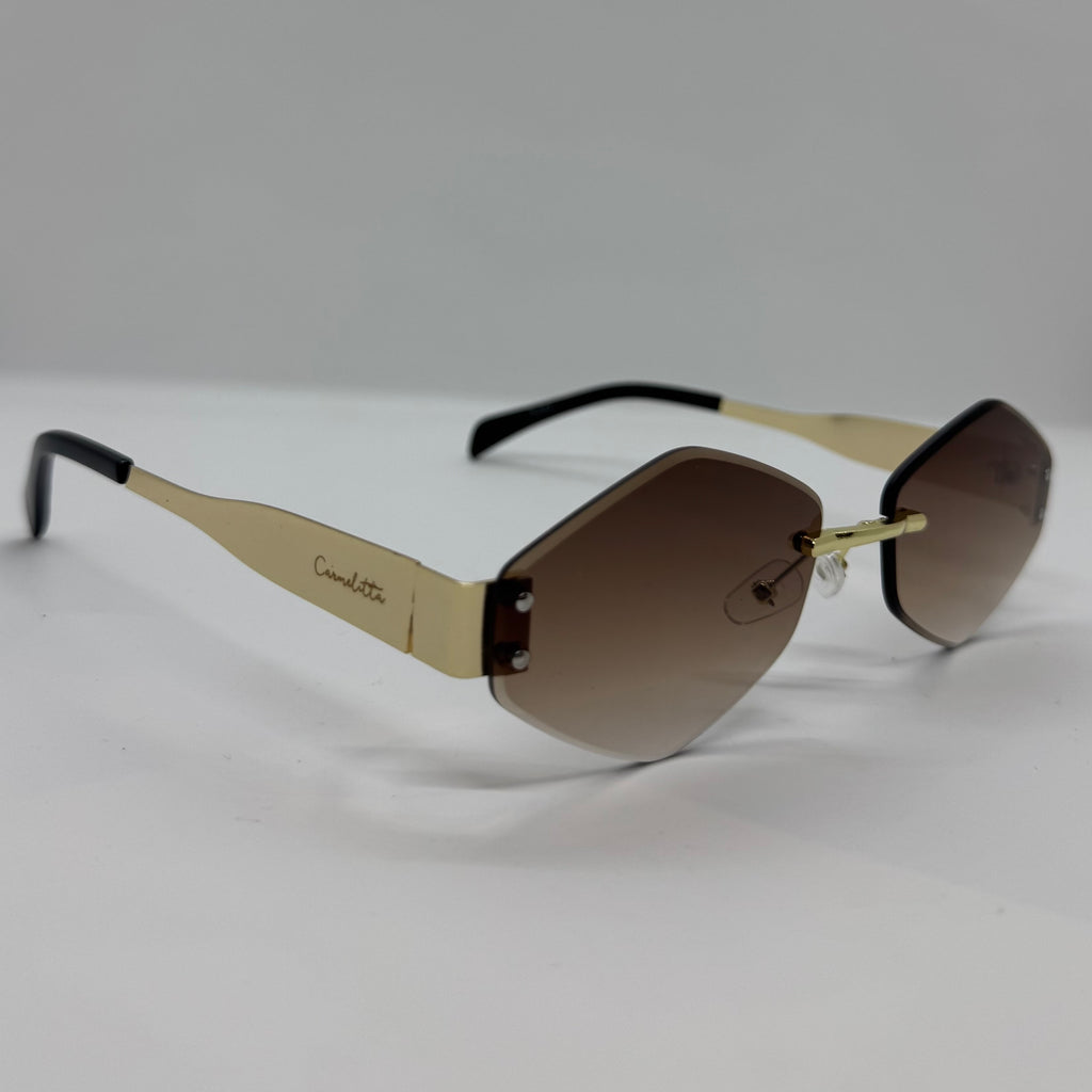 Óculos com hastes em metal dourado com lente marrom degrade.