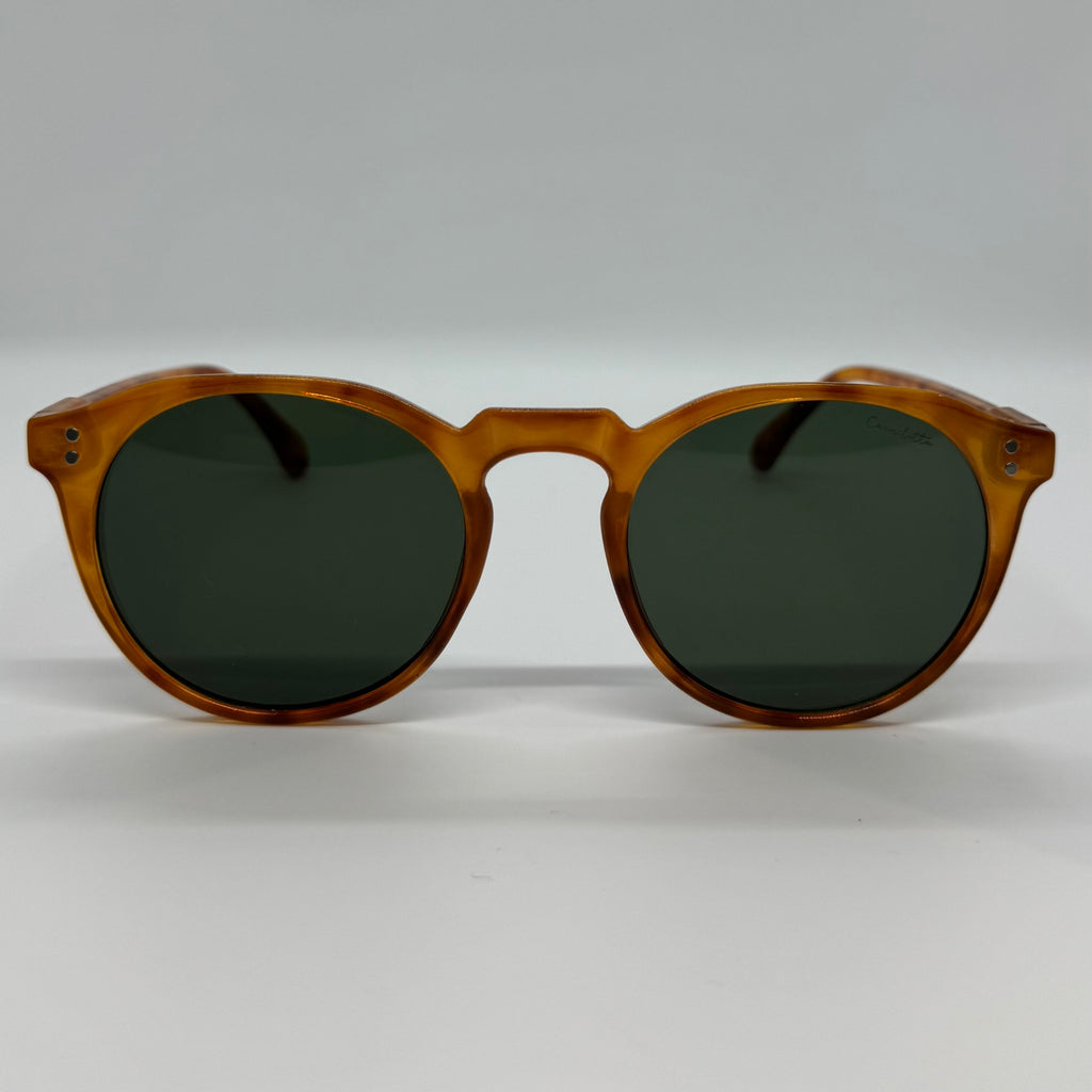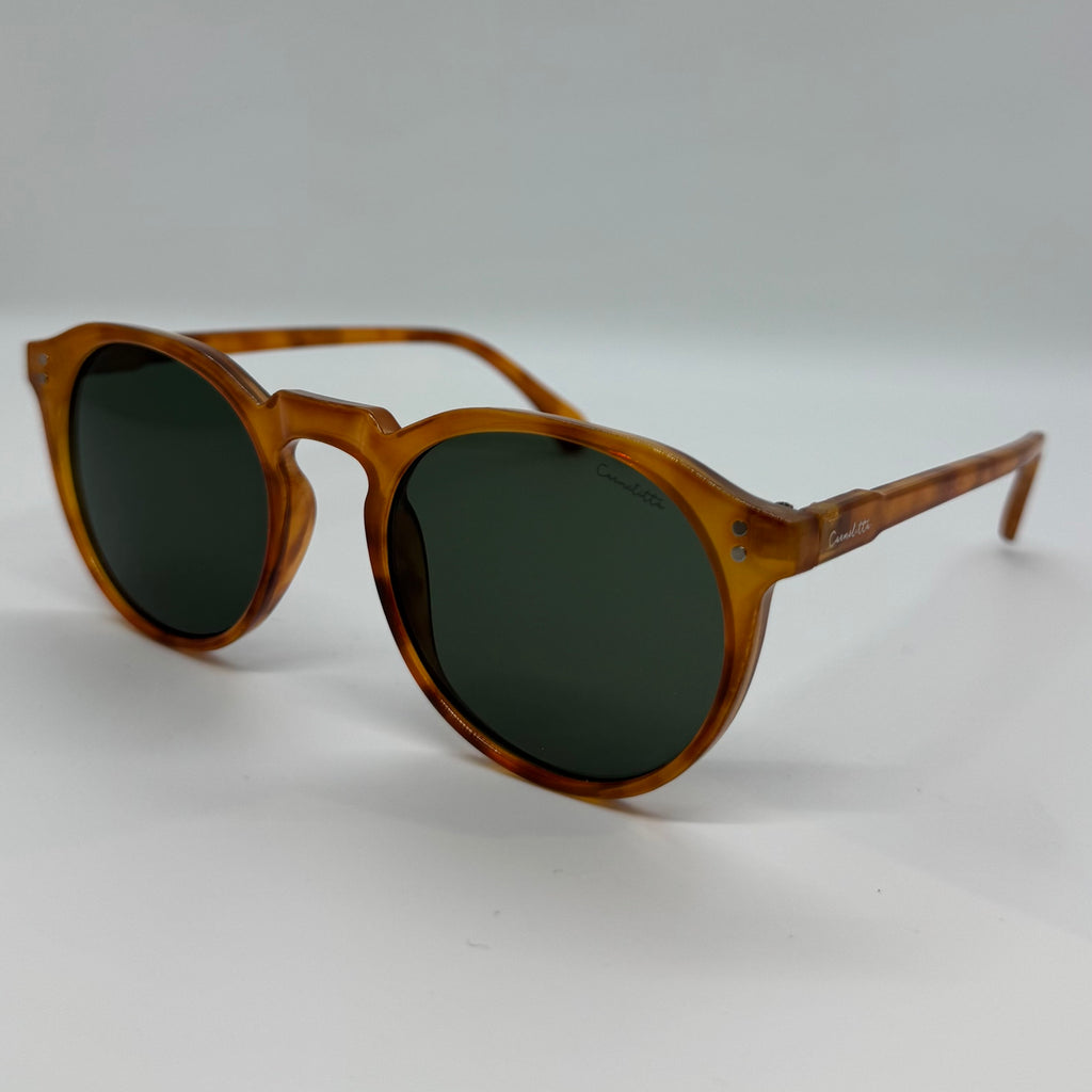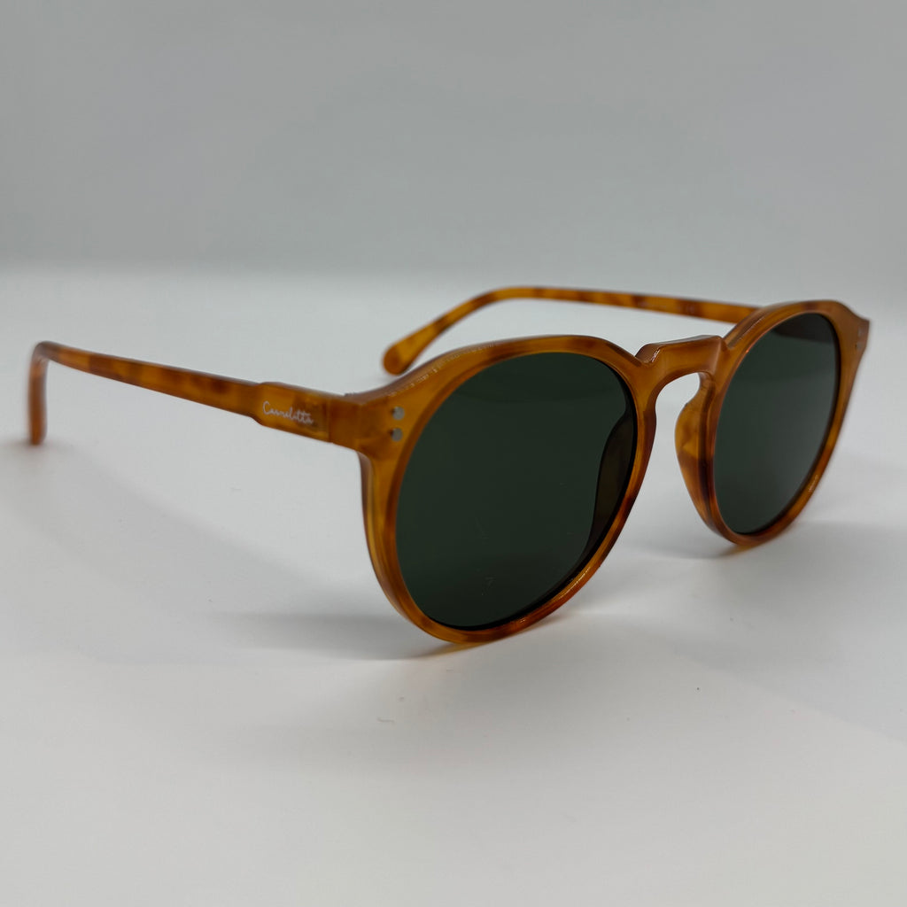 Óculos com hastes caramelo mesclado com lente verde.
