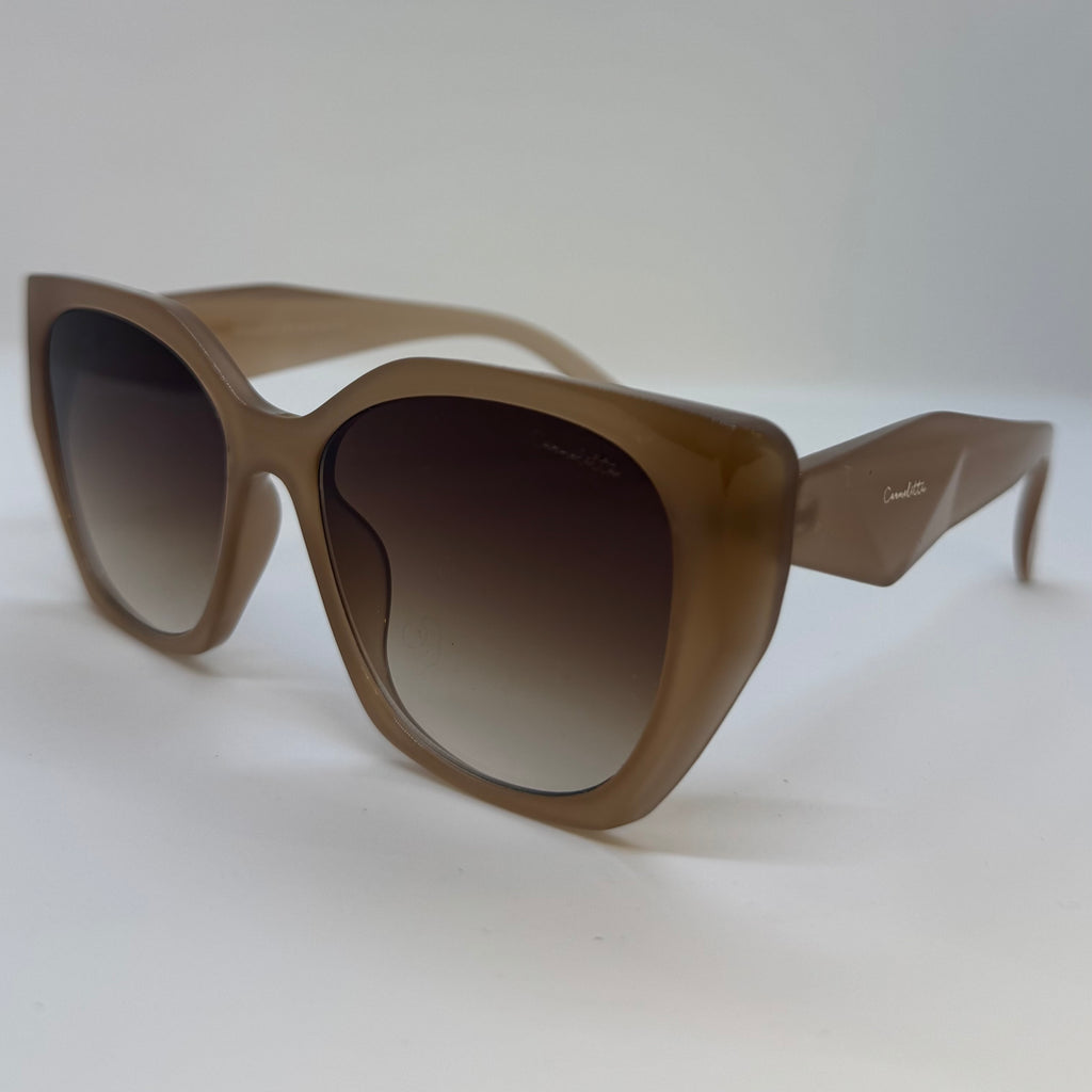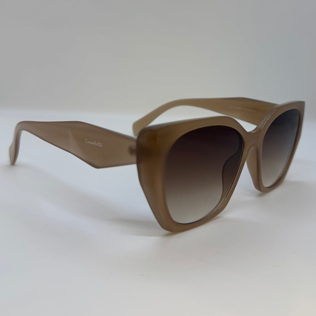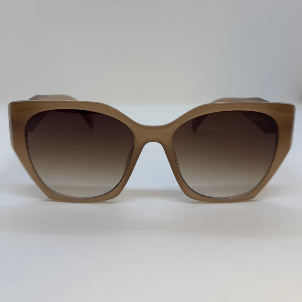 Óculos com hastes em acetato nude com lente roxa degrade.