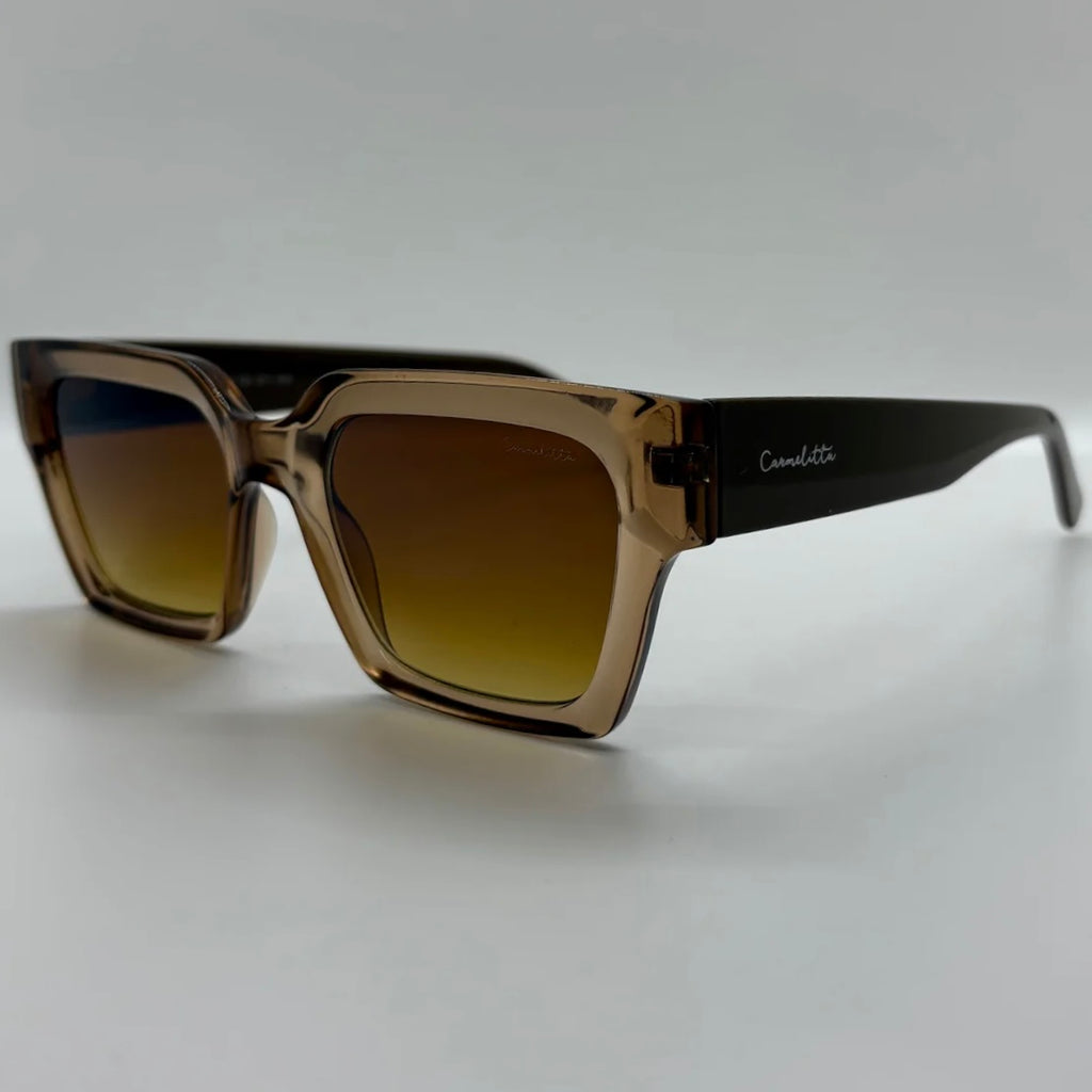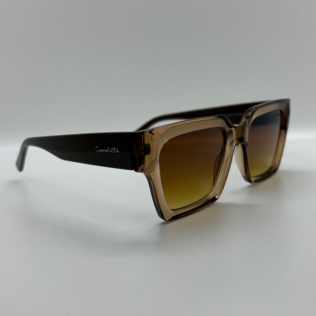 Óculos com armação em acetato marrom translúcido, hastes pretas e lentes marrom com degradê dourado.