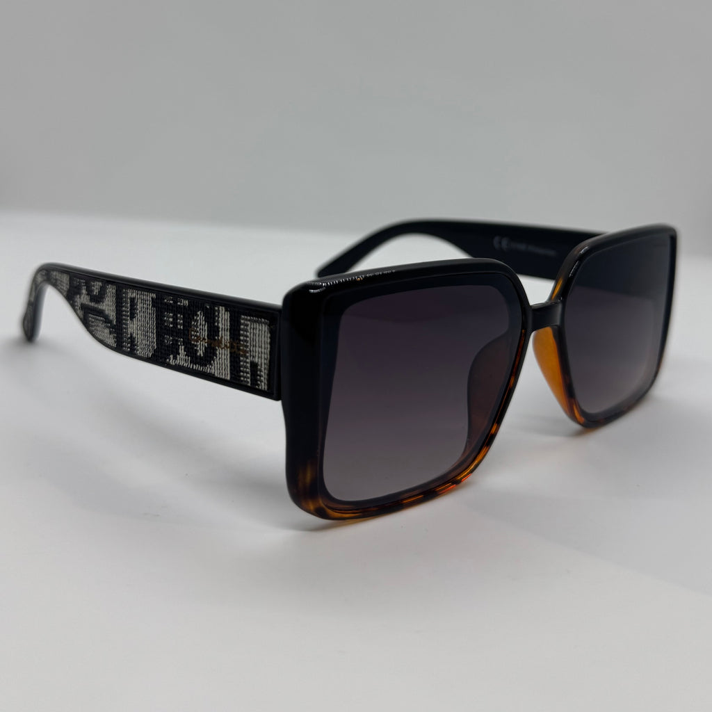Óculos com hastes com desenhos, frente superior em acetato preto e inferior tartaruga com lente roxa degrade.